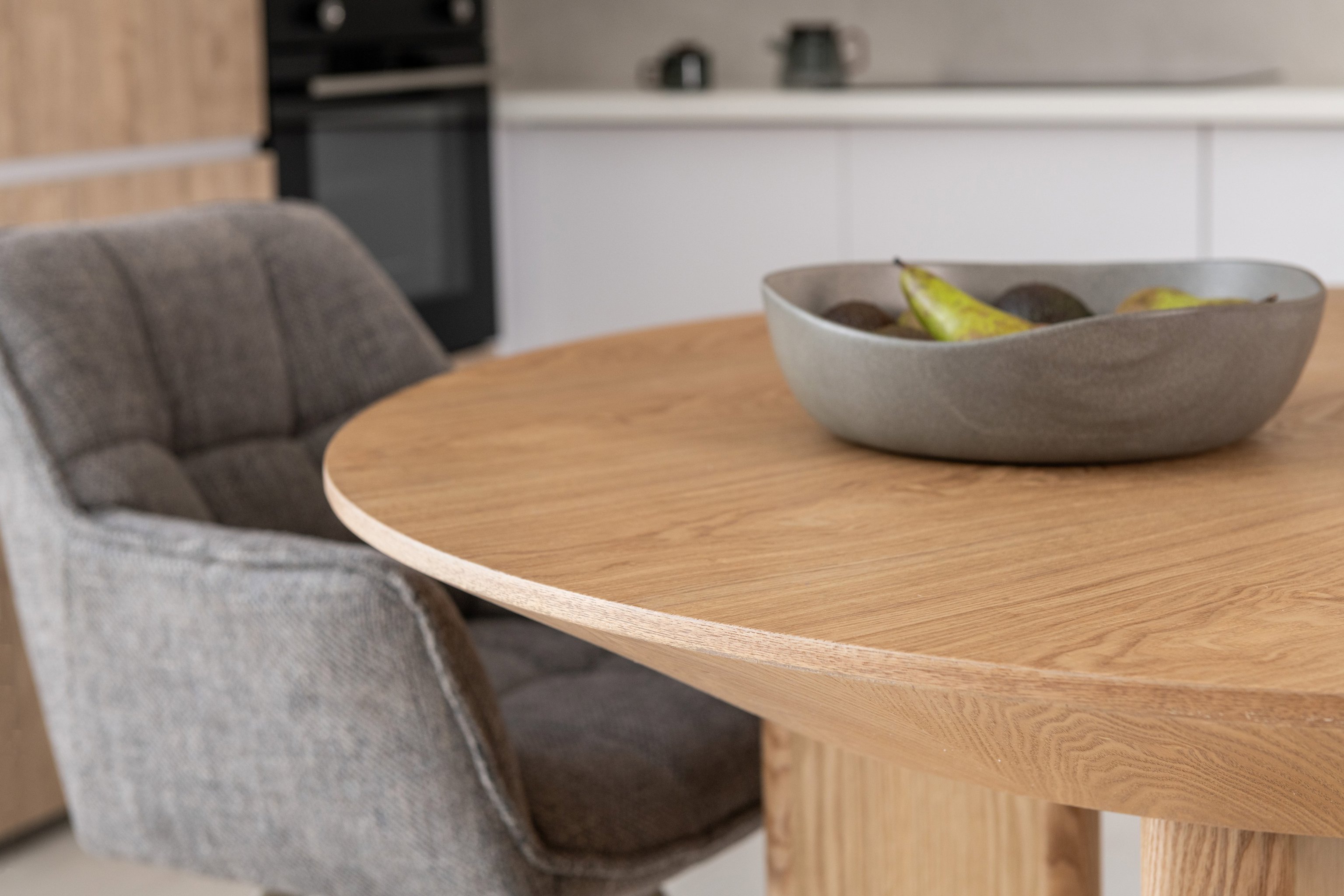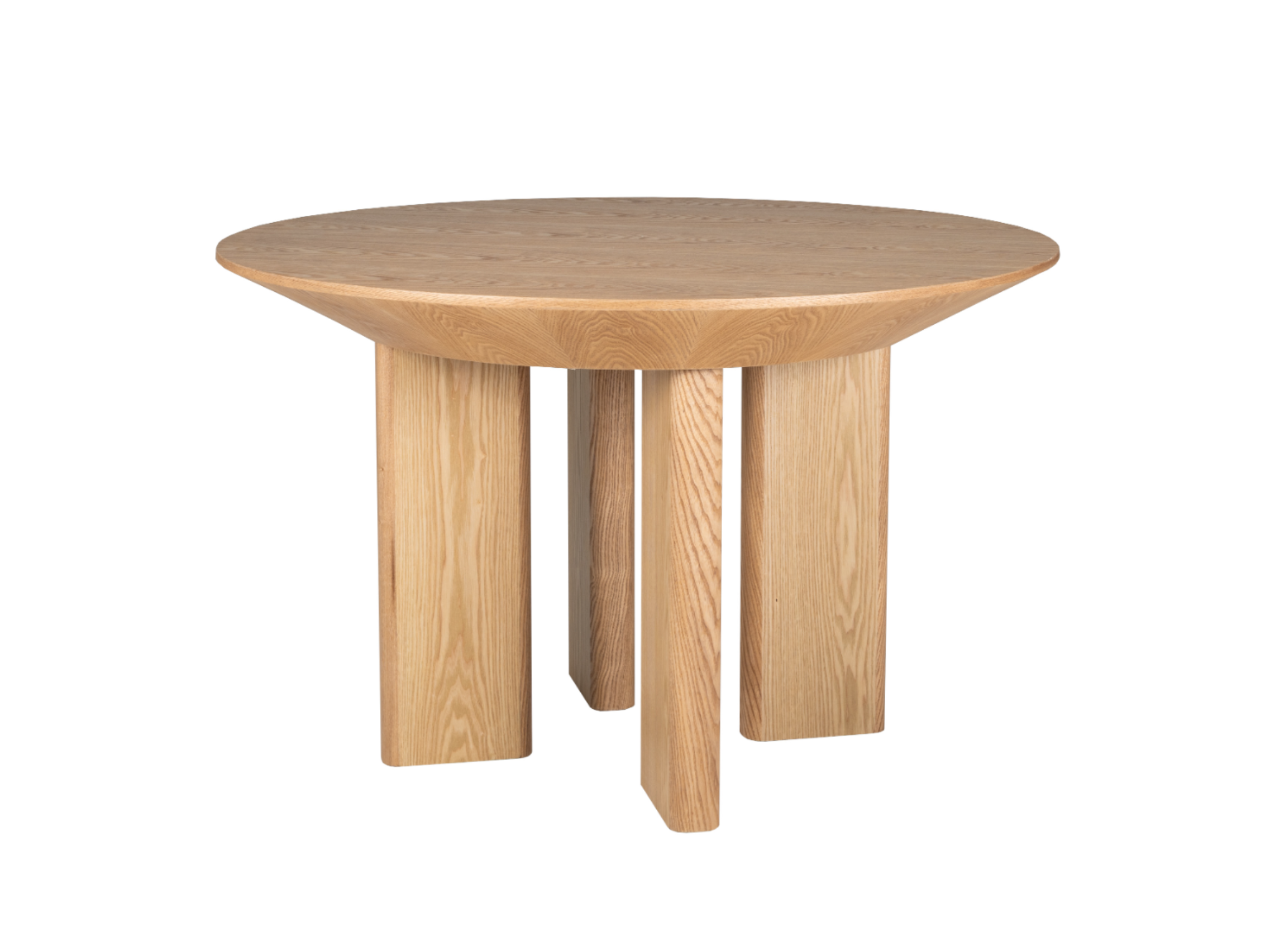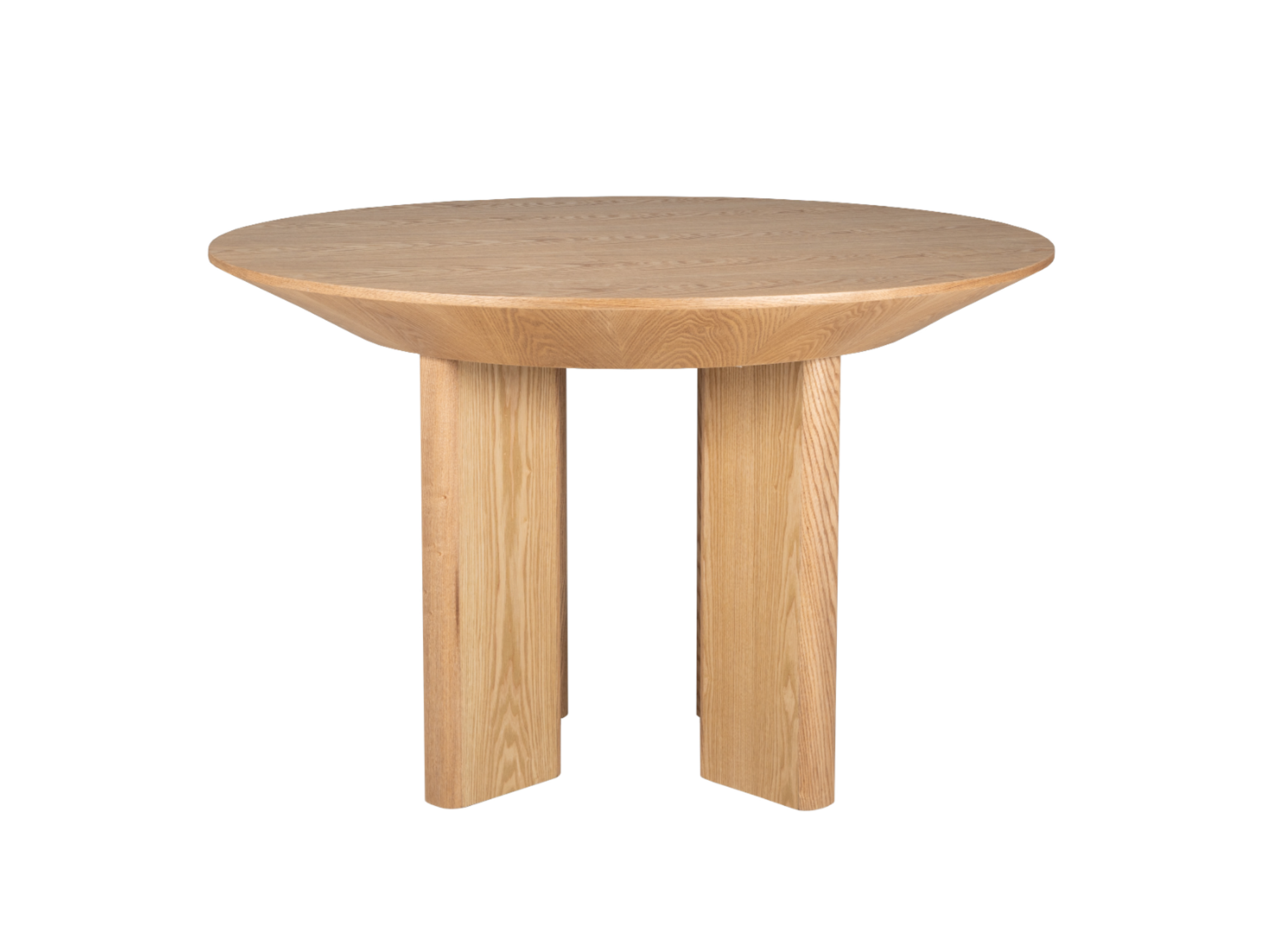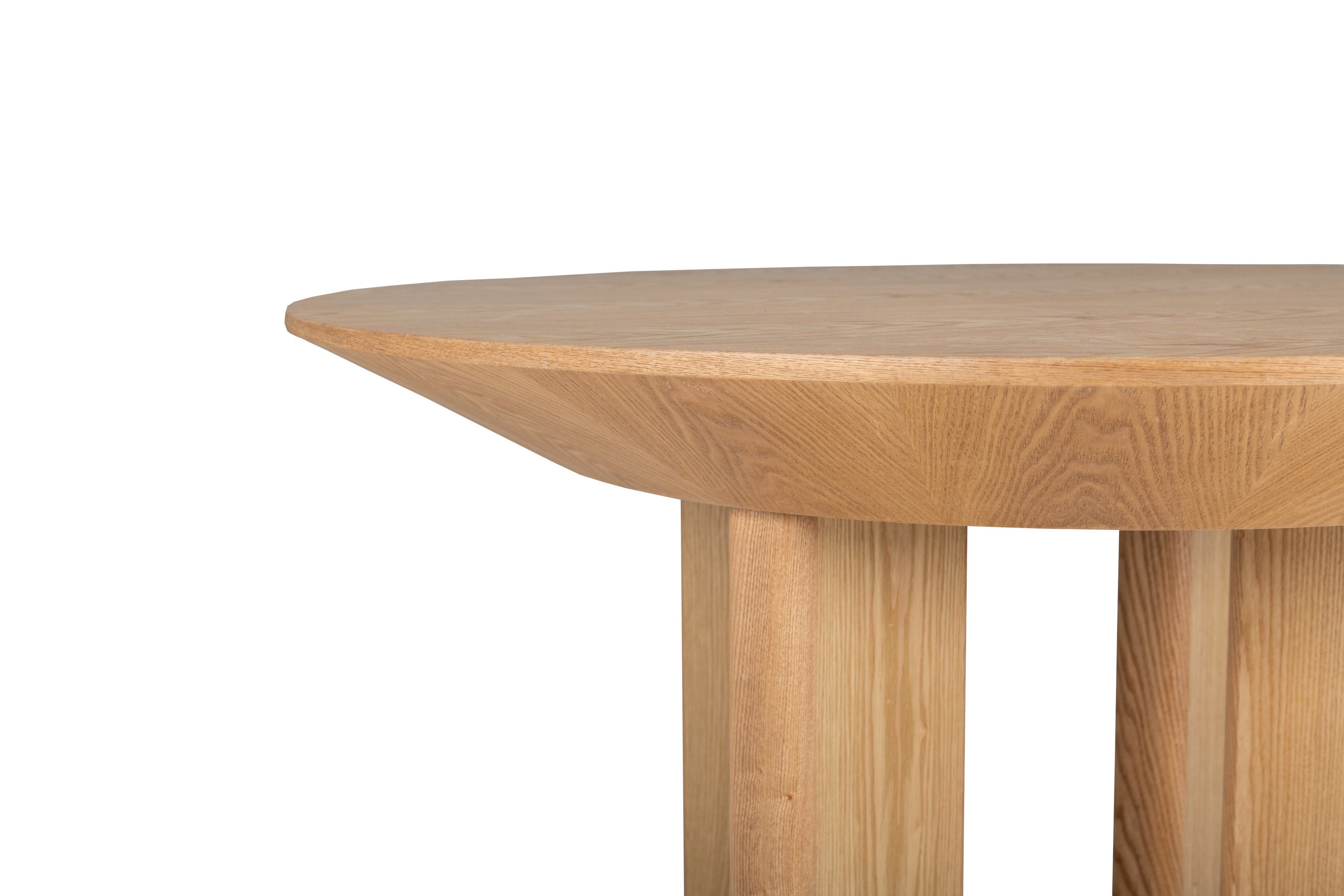 Кругла стільниця діаметром 120 см виконана зі шпонованого МДФ у природному відтінку "ясень", що додає інтер’єру тепла та затишку.