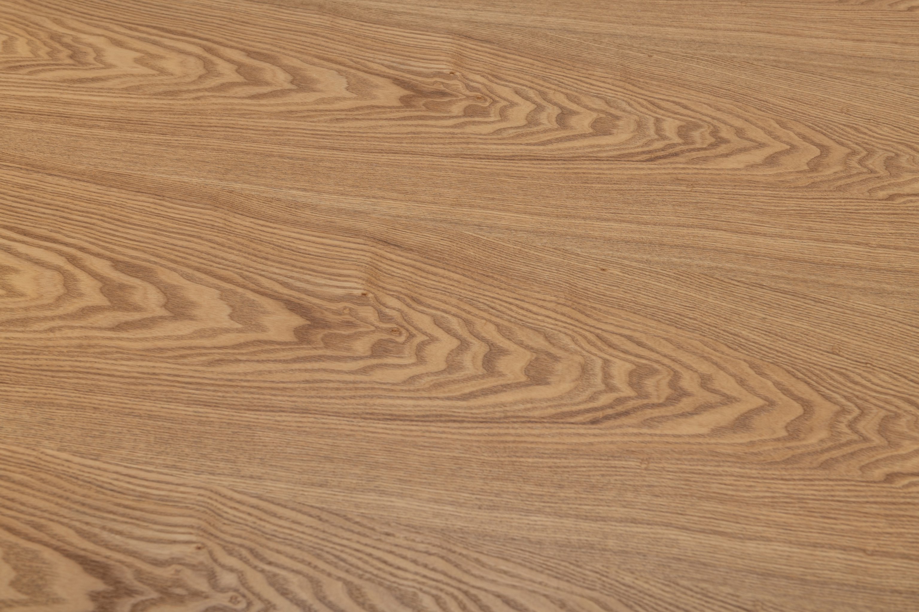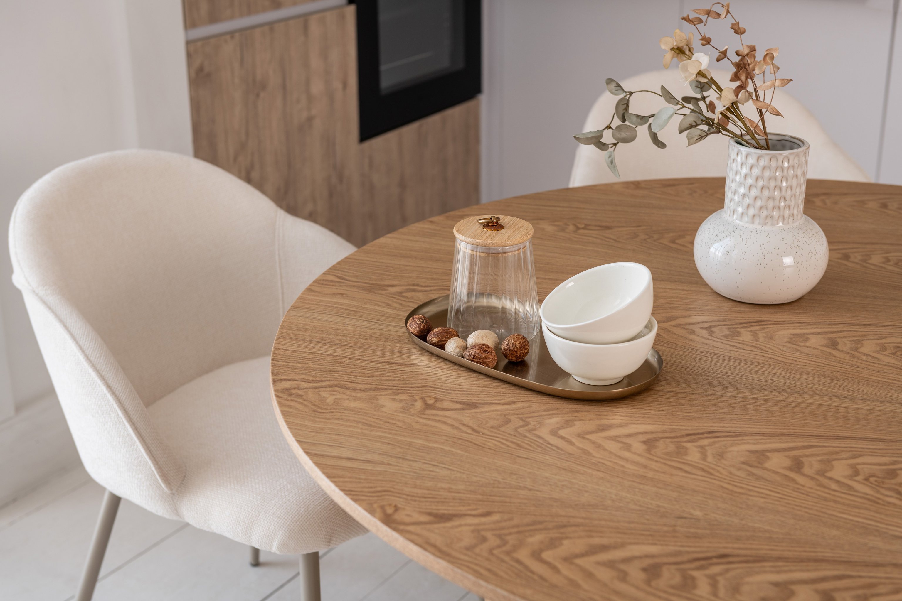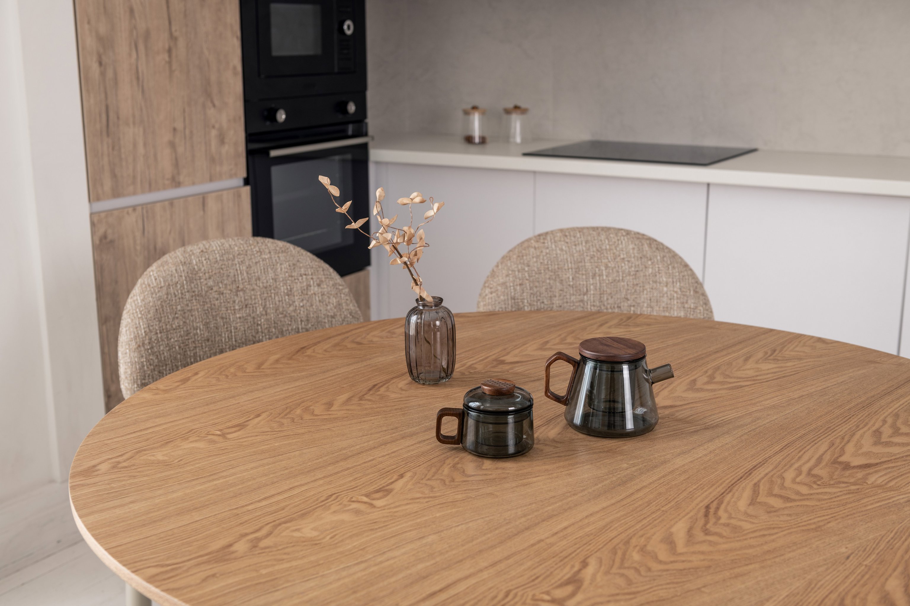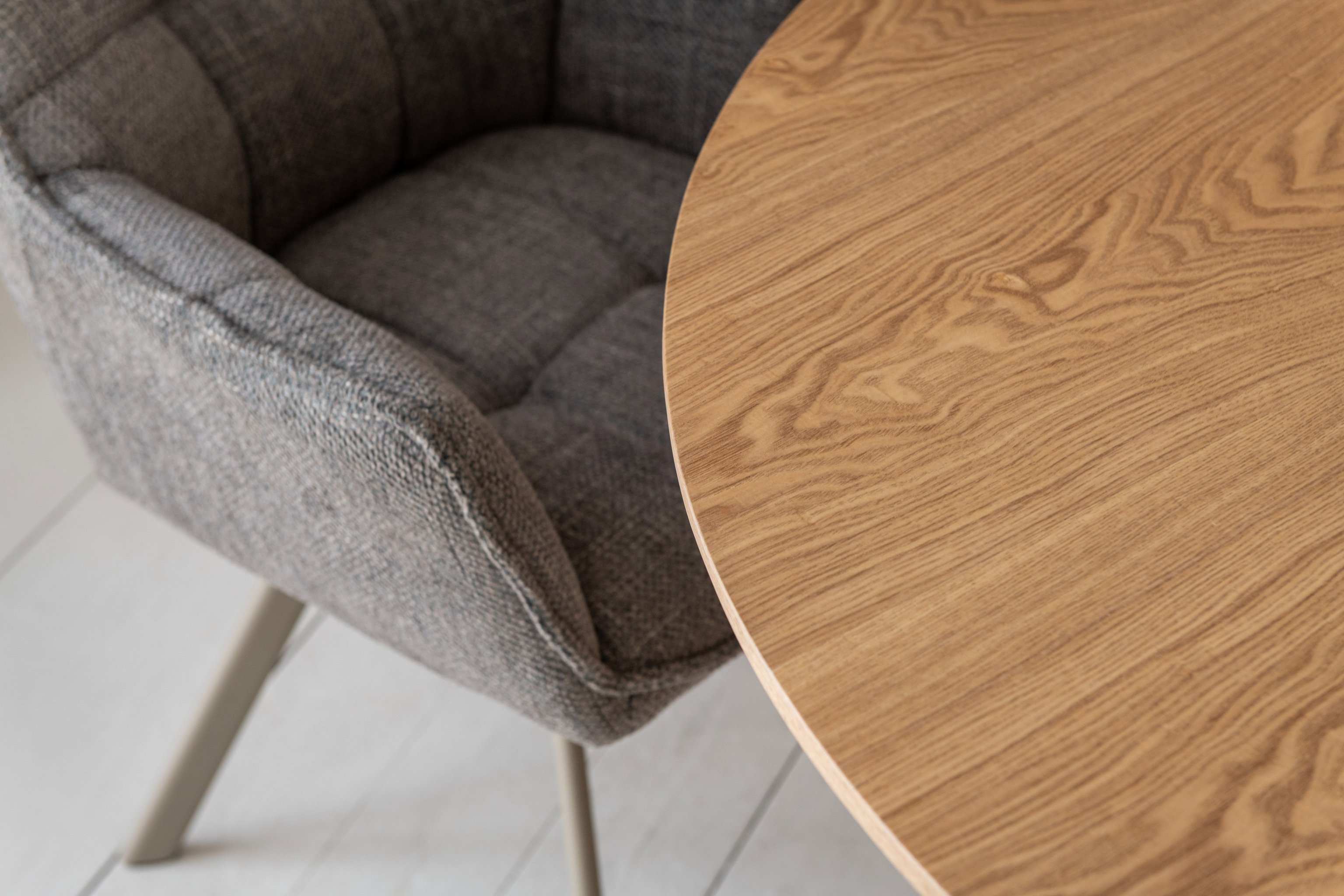 Кругла стільниця діаметром 120 см виконана зі шпонованого МДФ у природному відтінку "ясень", що додає інтер’єру тепла та затишку.