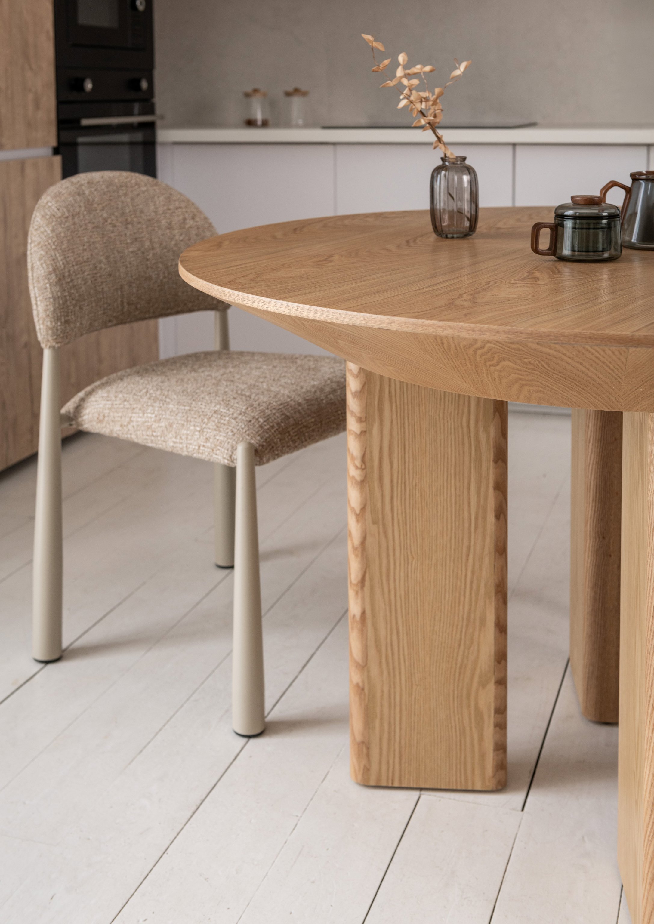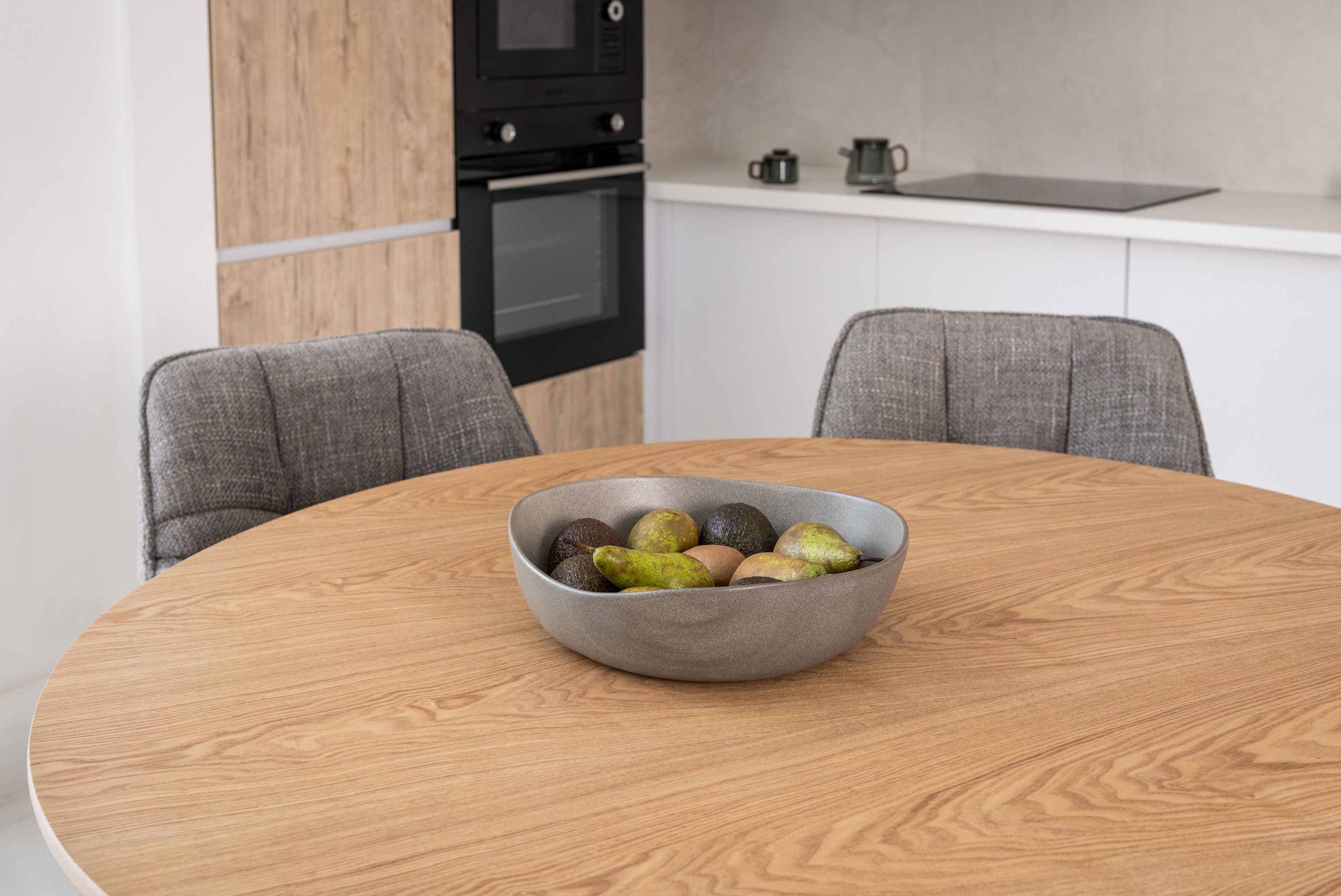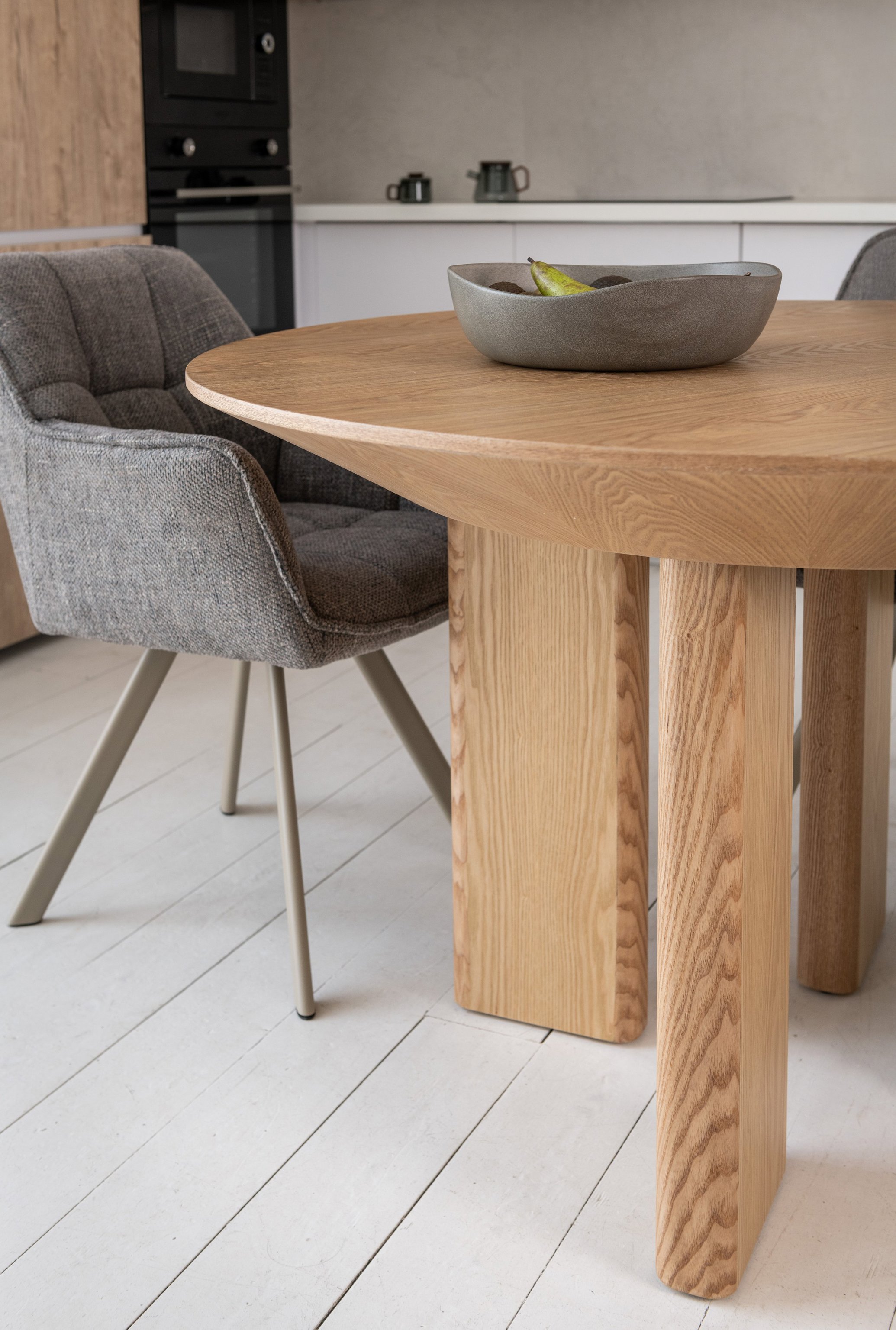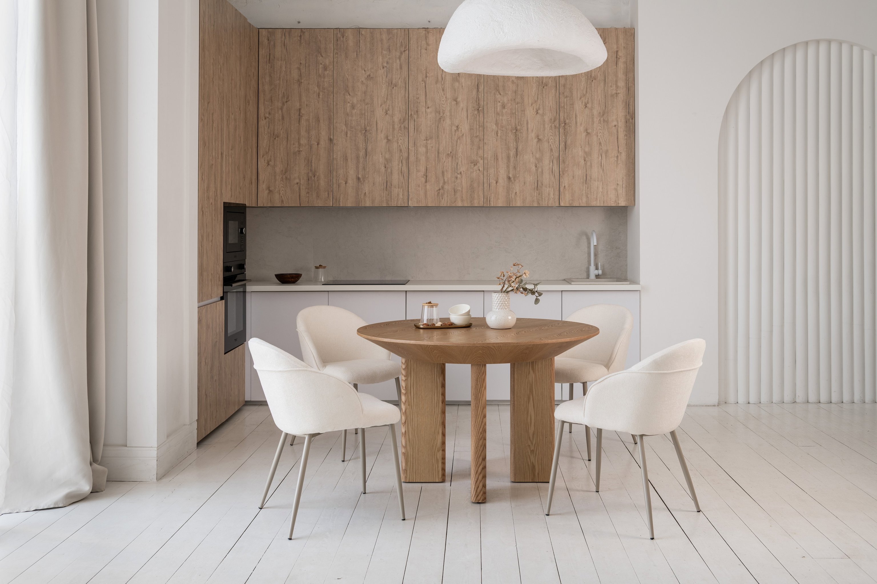 Кругла стільниця діаметром 120 см виконана зі шпонованого МДФ у природному відтінку "ясень", що додає інтер’єру тепла та затишку.