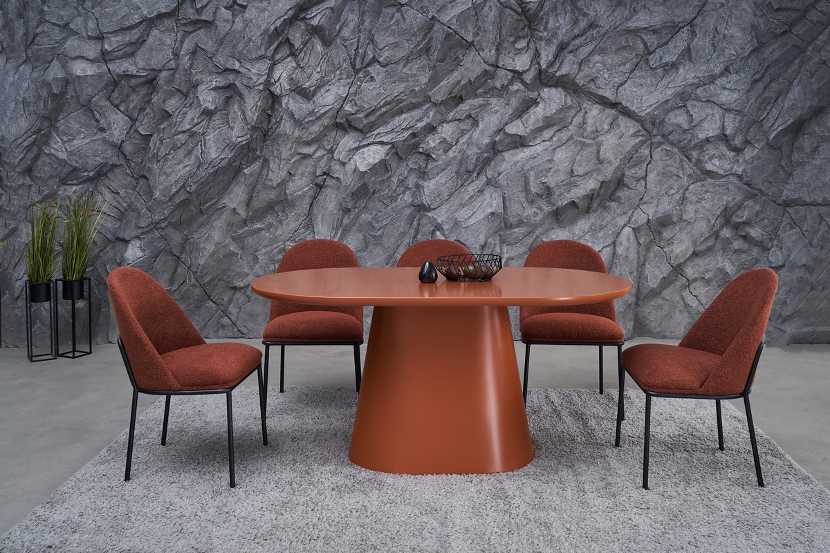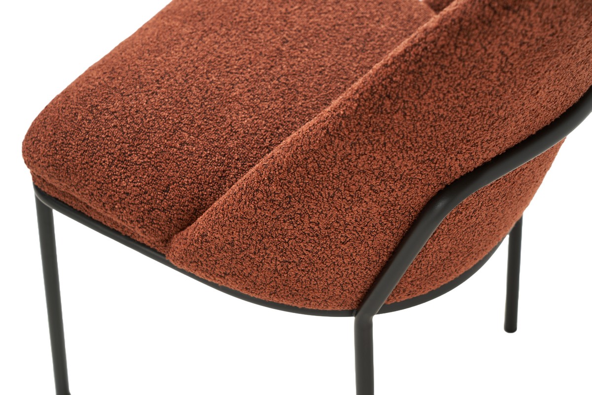 Теракотовий букле – це матеріал, який поєднує в собі тепло, природність та текстуровану поверхню, що надає стільцям затишного та стильного вигляду. Теракотовий колір, що нагадує відтінки землі та глини, додає інтер’єру тепла і комфорту, а букле забезпечує додаткову текстурну привабливість.