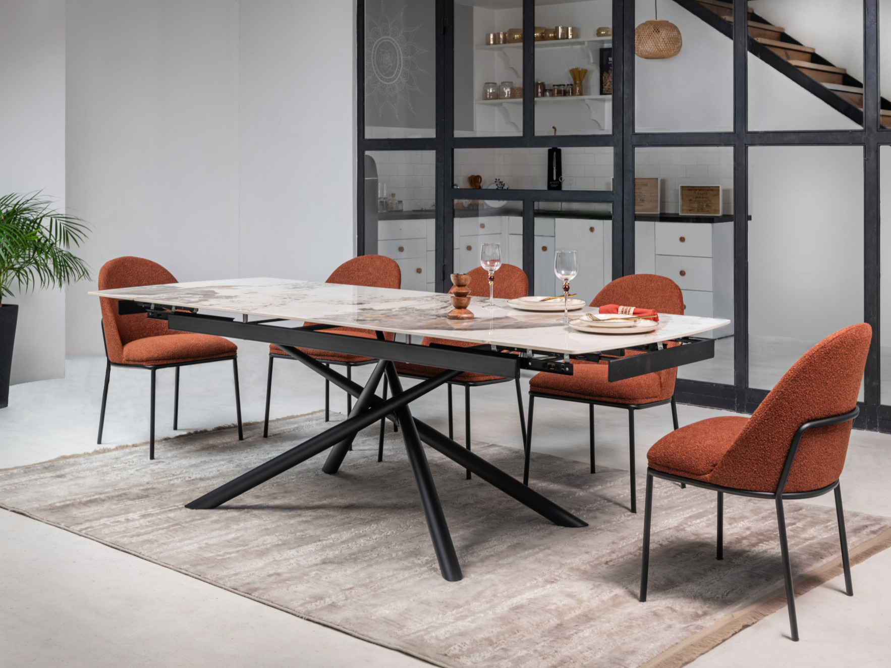 Поєднання теракотового букле з іншими кольорами та матеріалами дозволяє створювати різні настрої та стилі інтер'єру, від сучасного мінімалізму до теплих і затишних класичних інтер'єрів.
