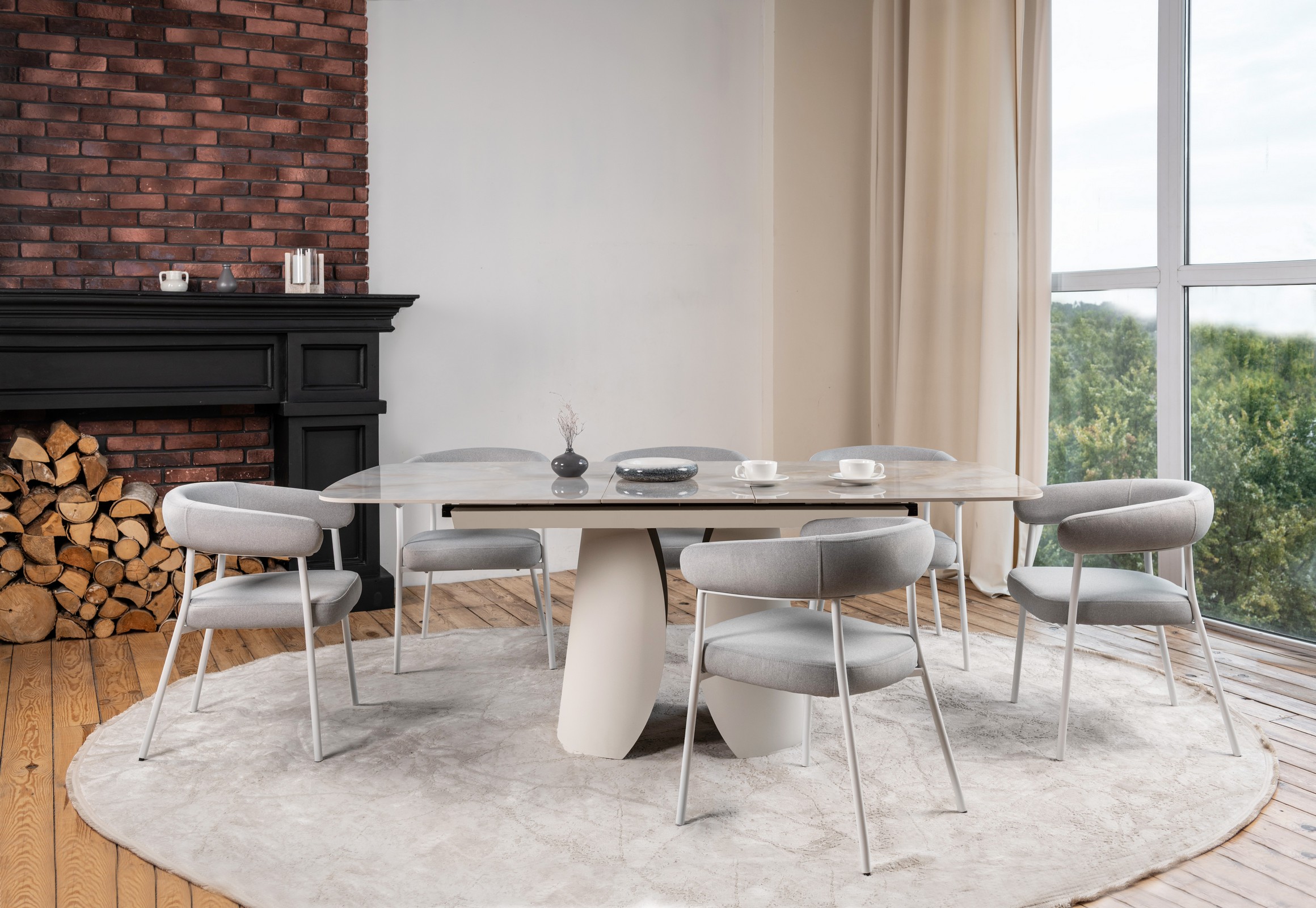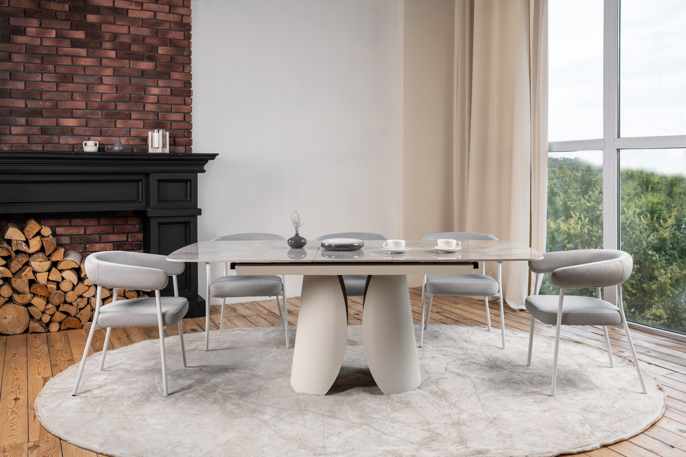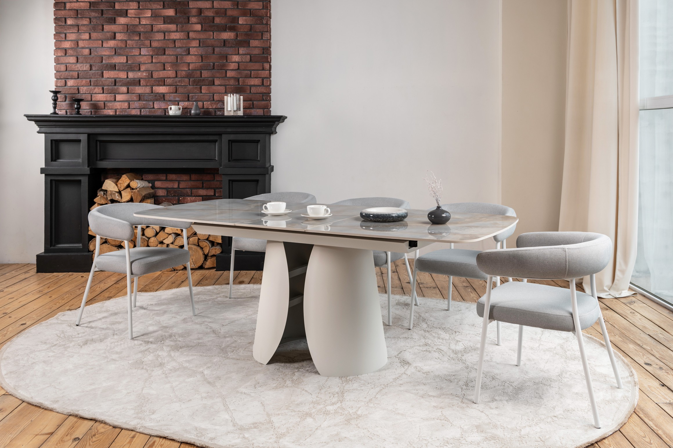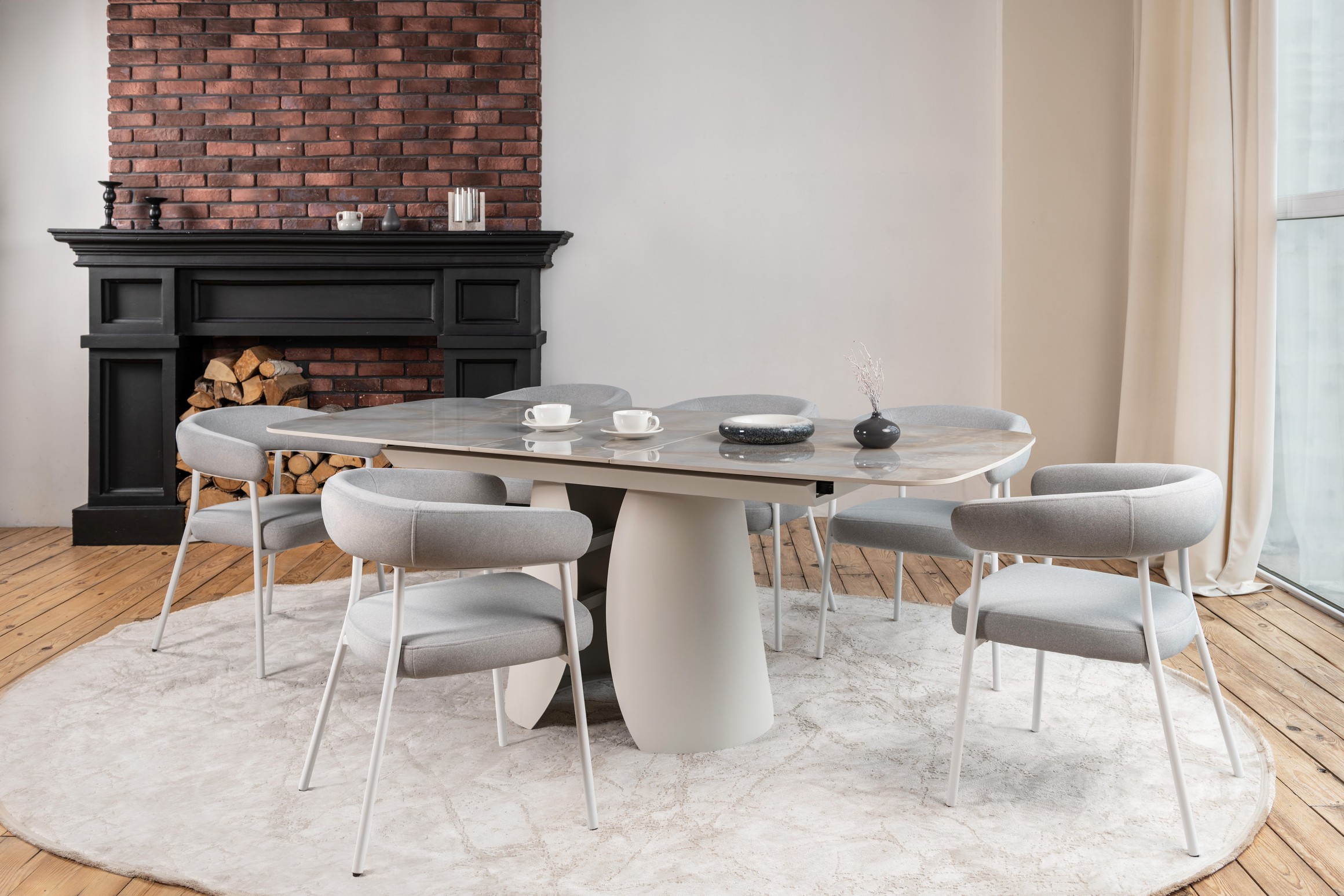 Стілець має міцну металеву основу, пофарбовану в білий колір, що створює свіжий і легкий акцент в інтер’єрі. Його стриманий силует ідеально пасує як до сучасного, так і до скандинавського або мінімалістичного стилю.