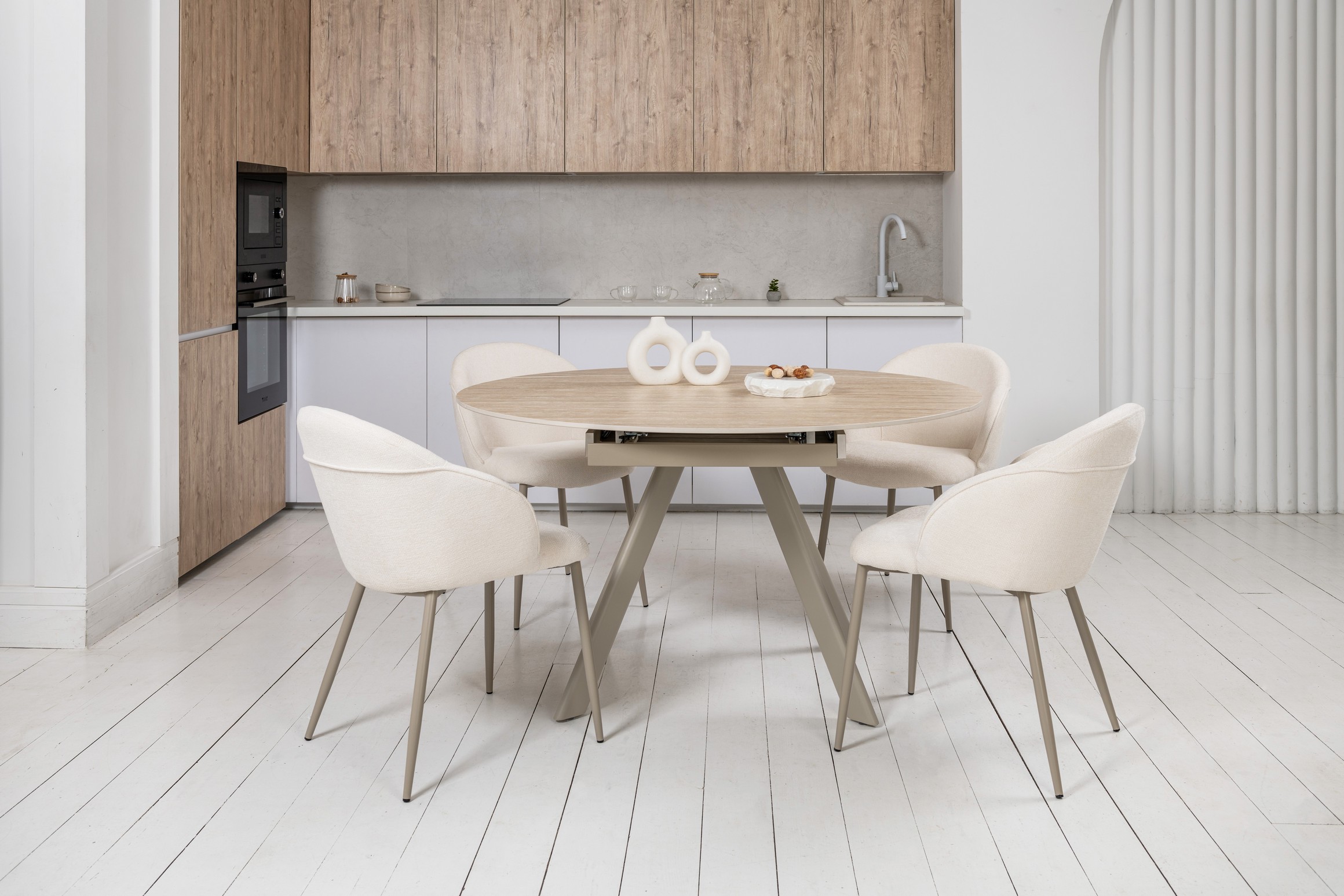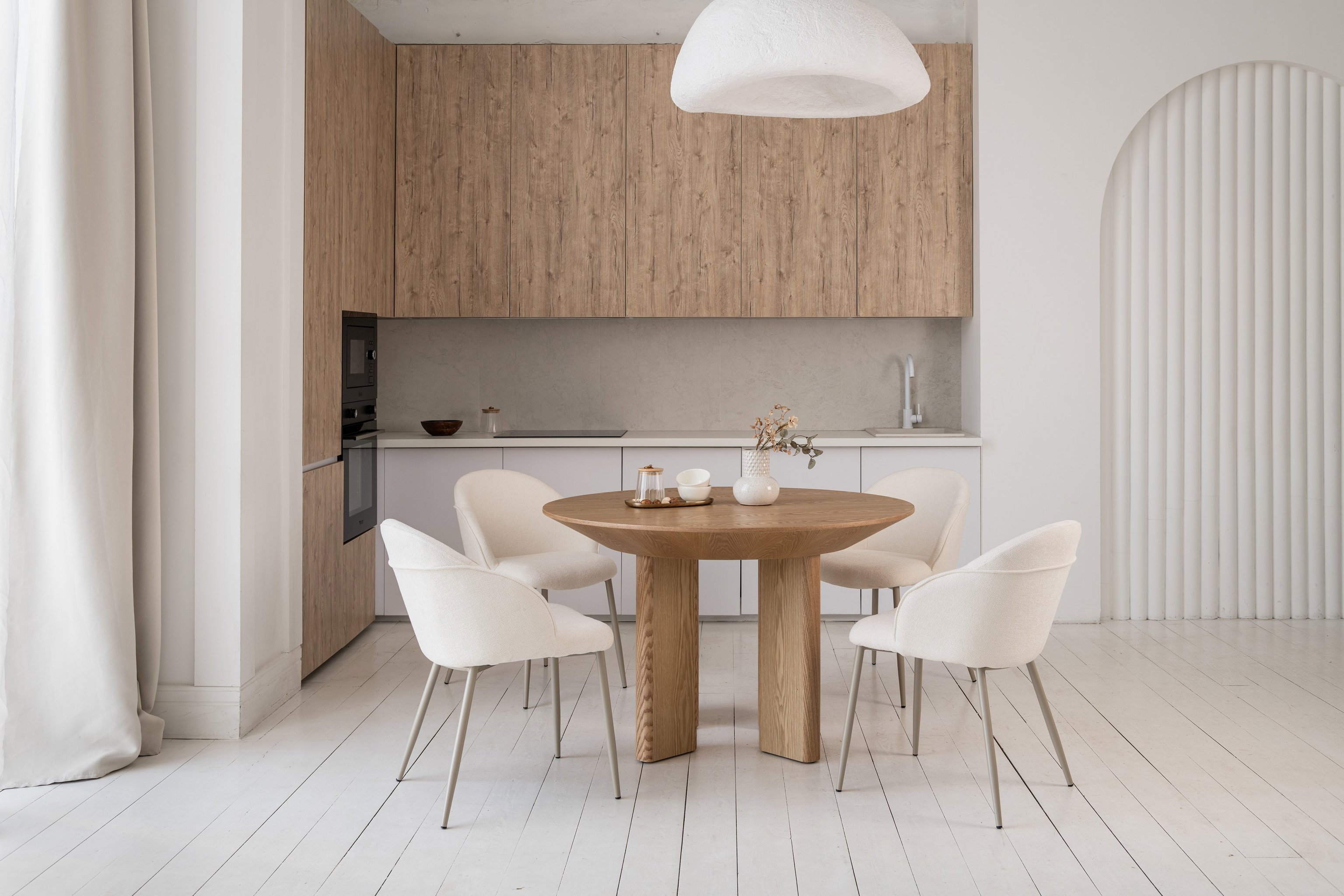 Поєднання оббивки в кольорі маршмеллоу та ніжок у відтінку капучино — це м’який і дуже затишний дует, що створює теплу, збалансовану атмосферу в інтер’єрі.