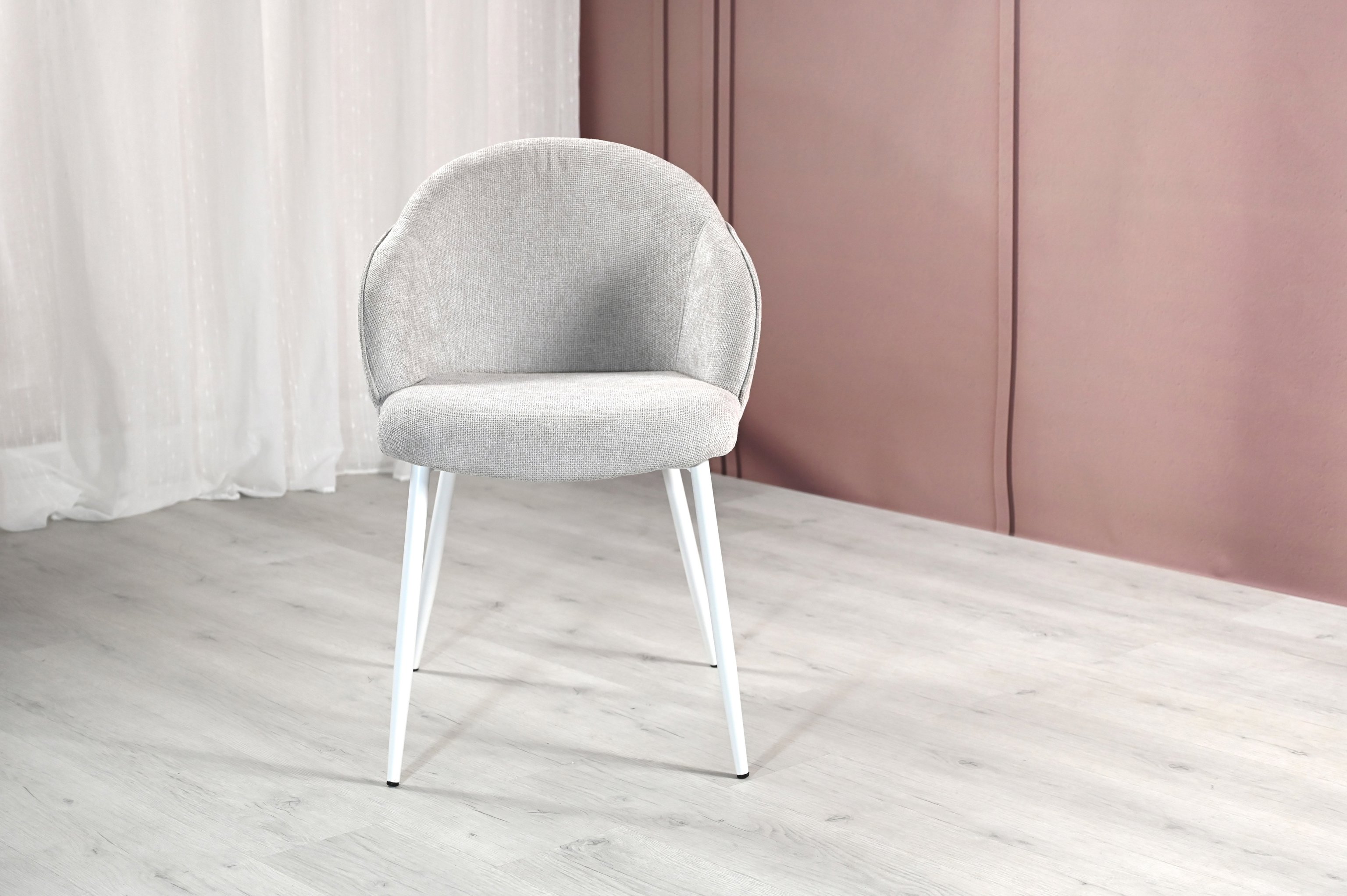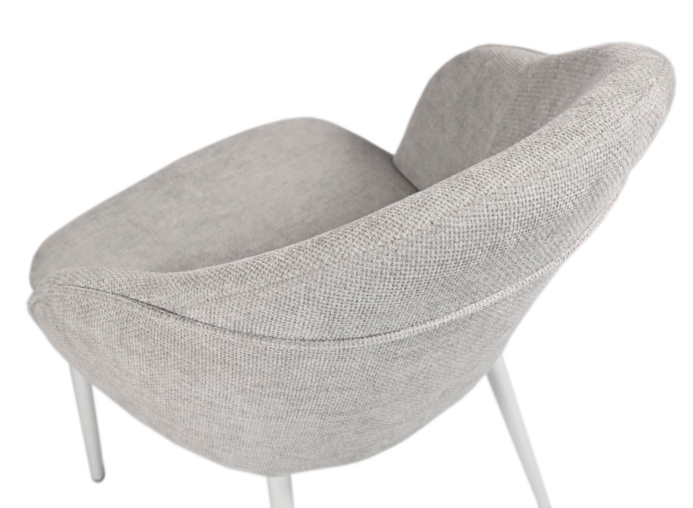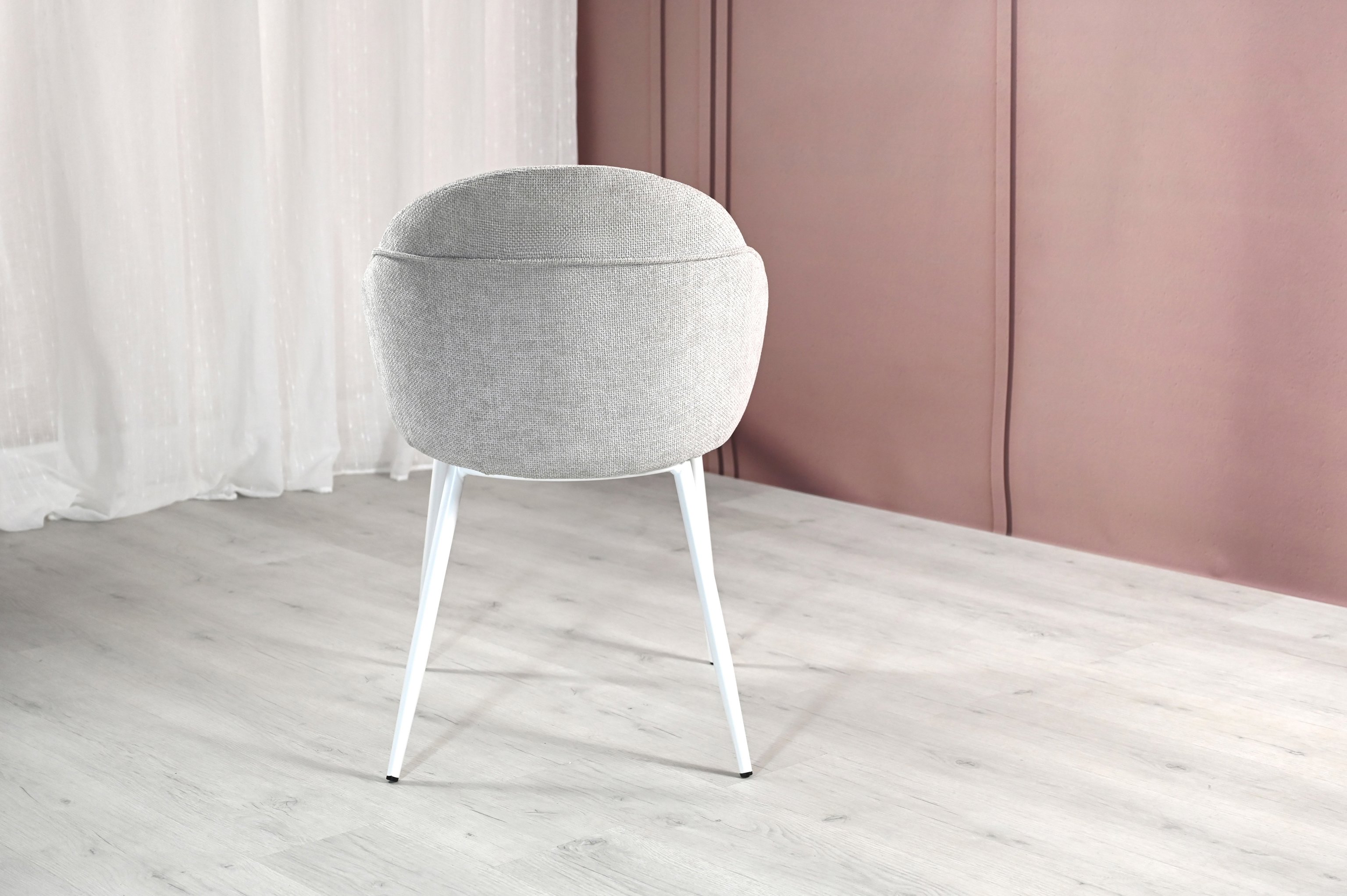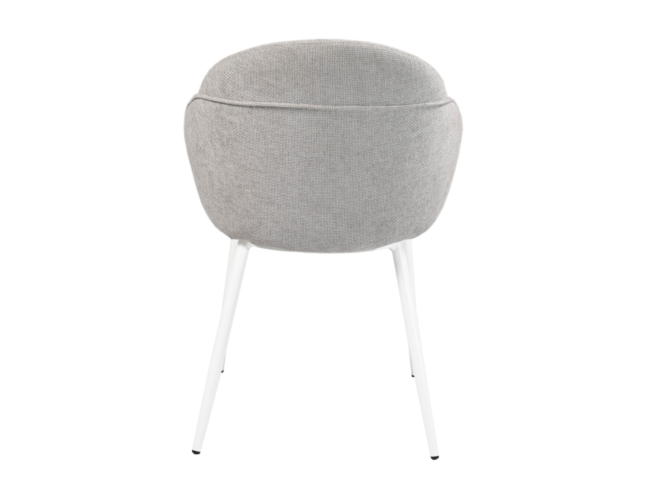 Підлокітники та зручна форма сидіння забезпечують комфорт під час тривалого сидіння — як за обіднім столом, так і в зонах відпочинку. Металеві ніжки, пофарбовані у білий колір, додають конструкції легкості та свіжості, утворюючи контраст з темною оббивкою.