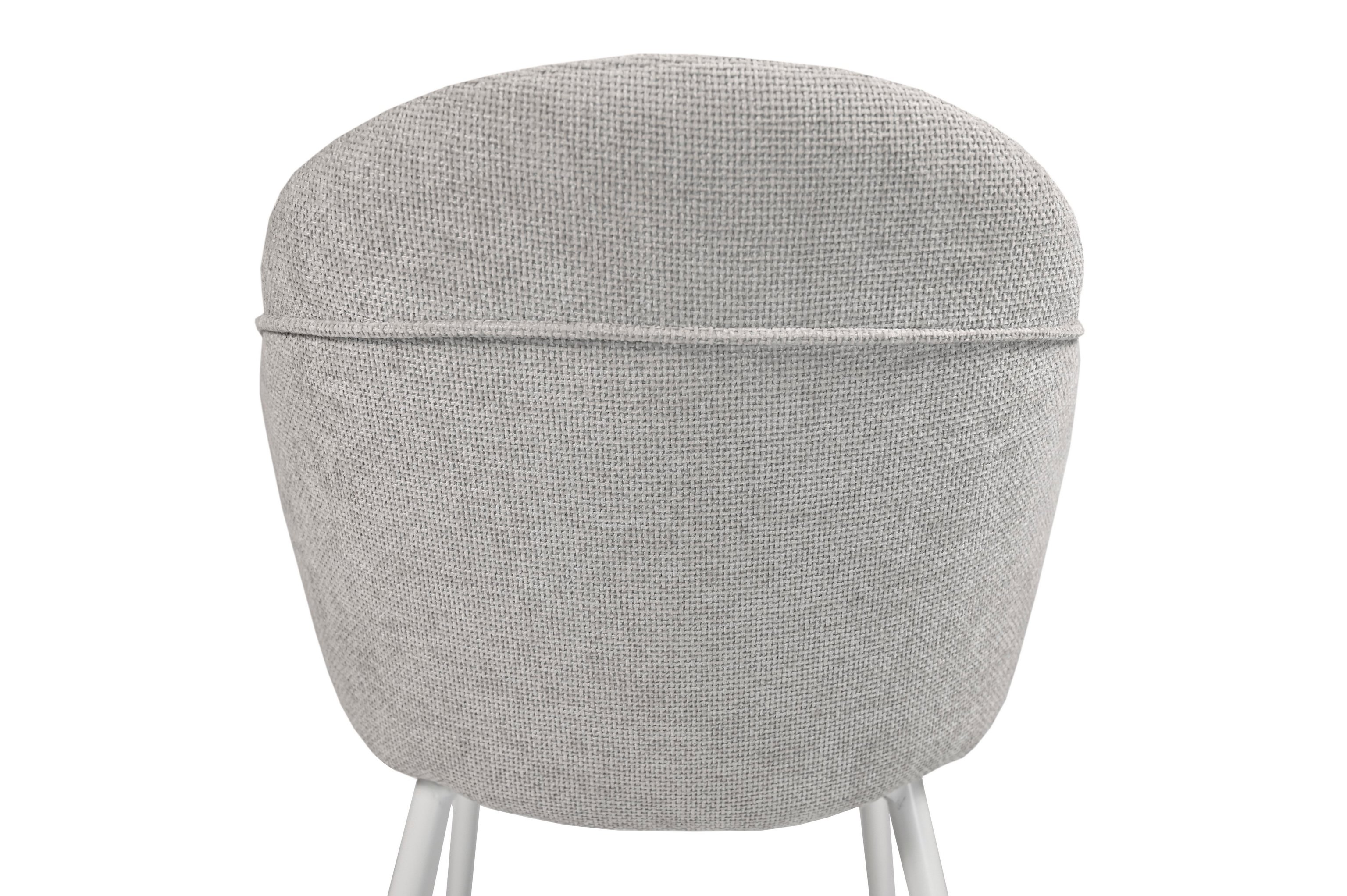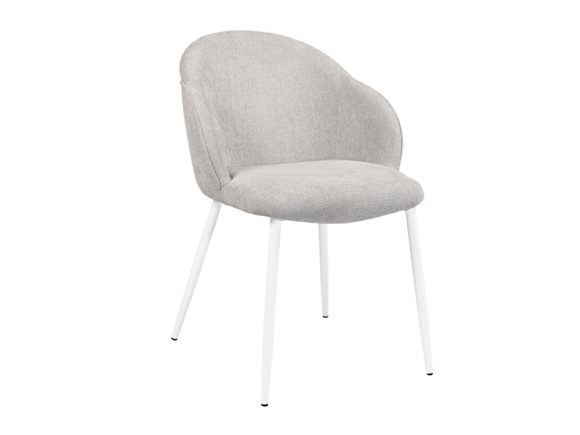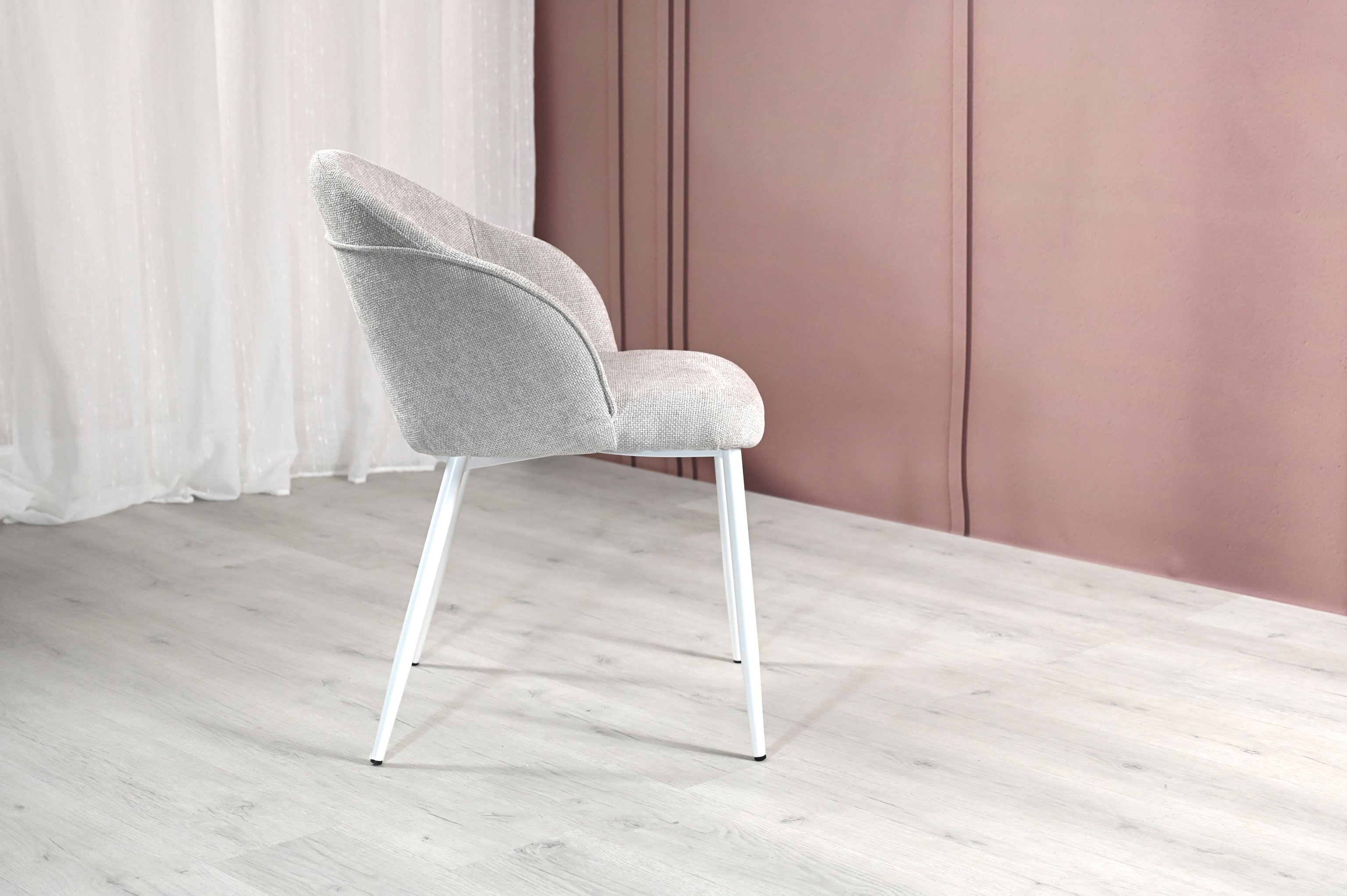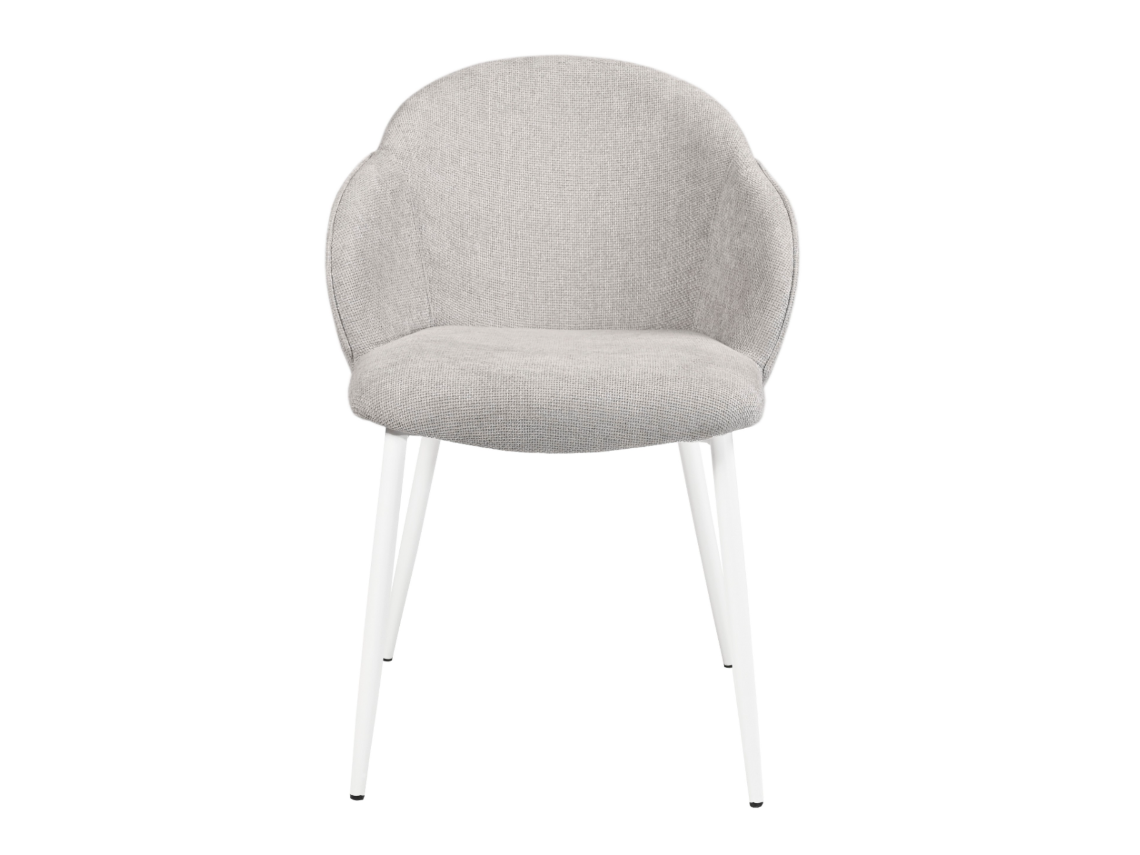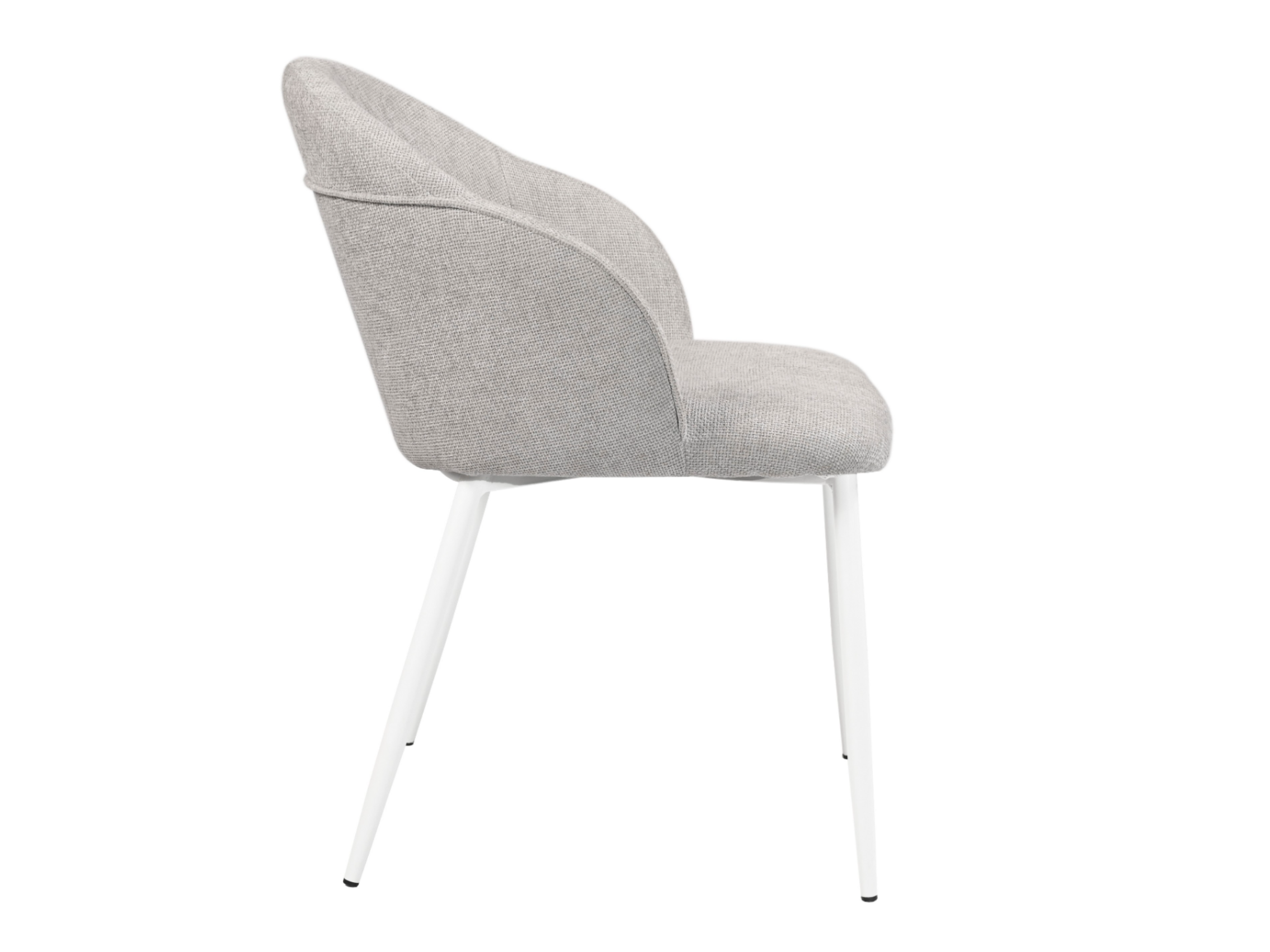 Підлокітники та зручна форма сидіння забезпечують комфорт під час тривалого сидіння — як за обіднім столом, так і в зонах відпочинку. Металеві ніжки, пофарбовані у білий колір, додають конструкції легкості та свіжості, утворюючи контраст з темною оббивкою.