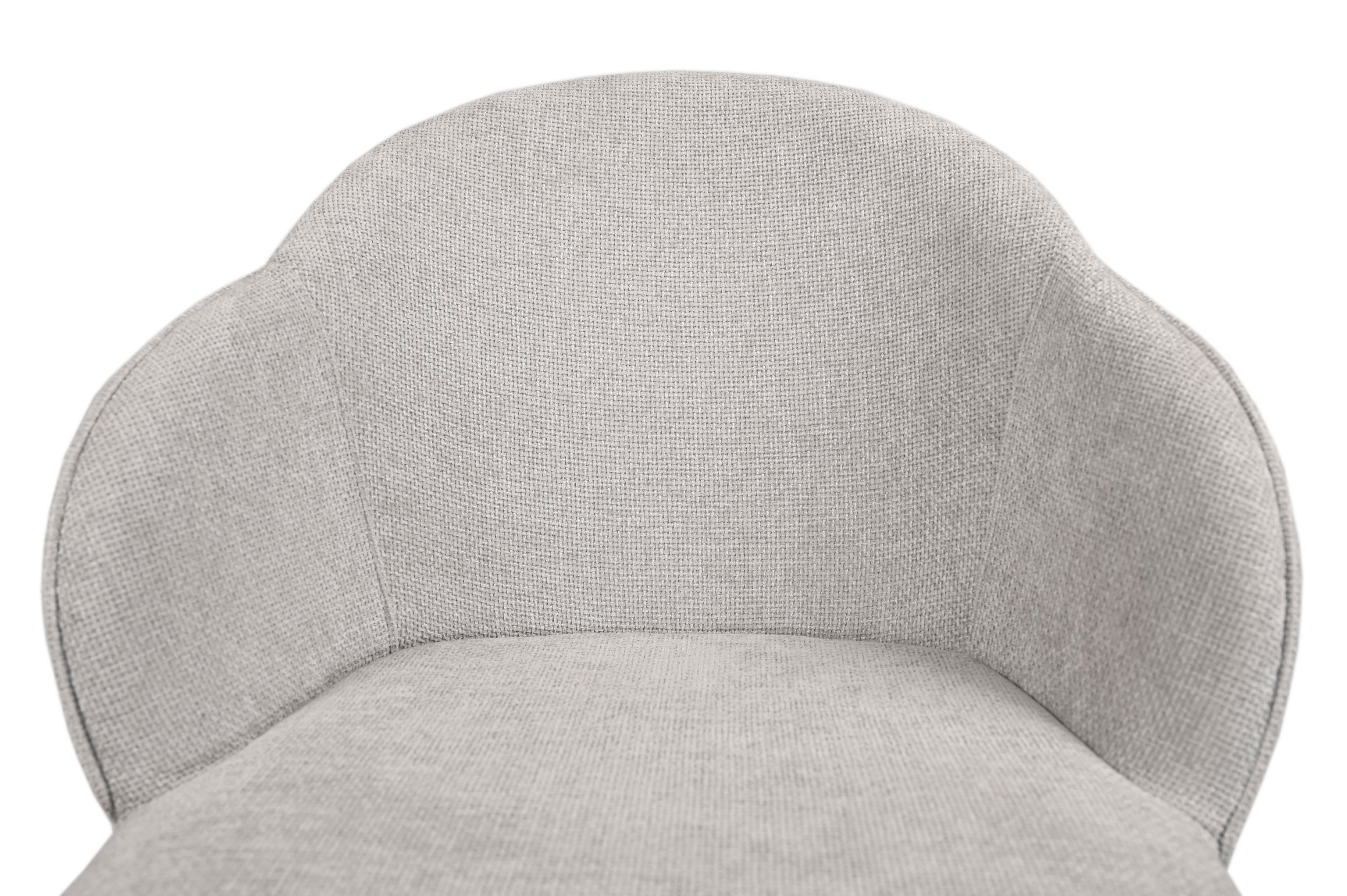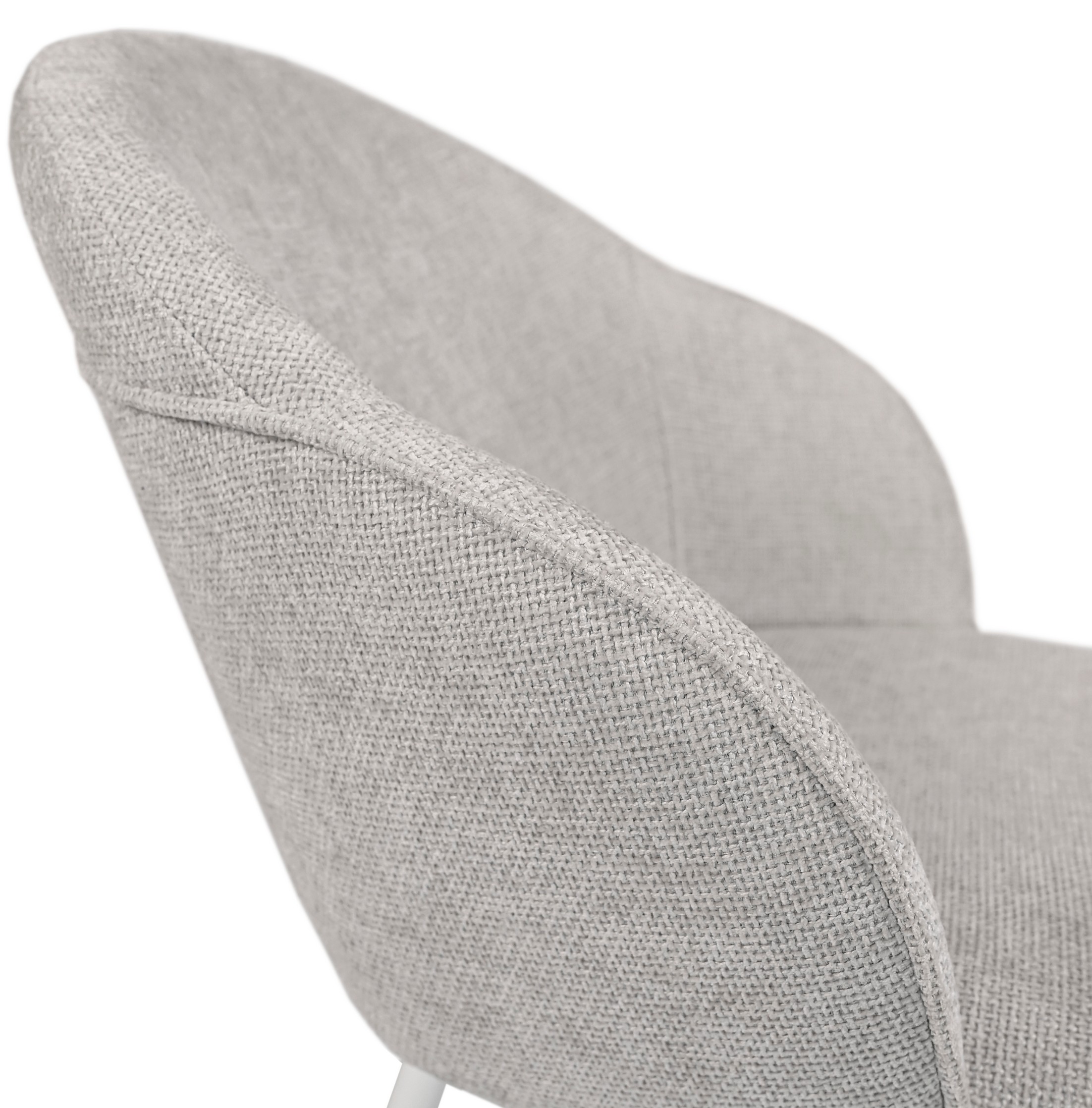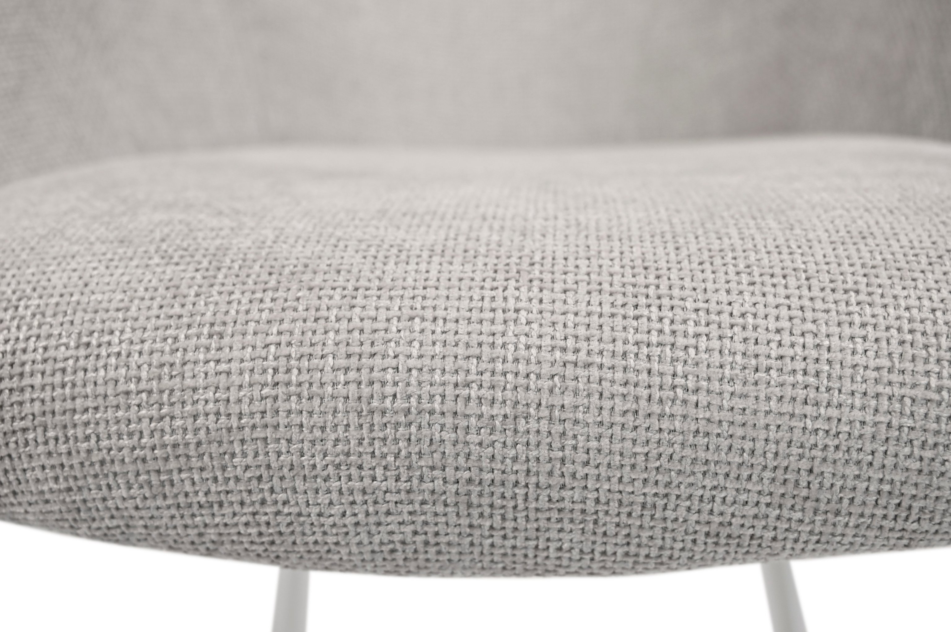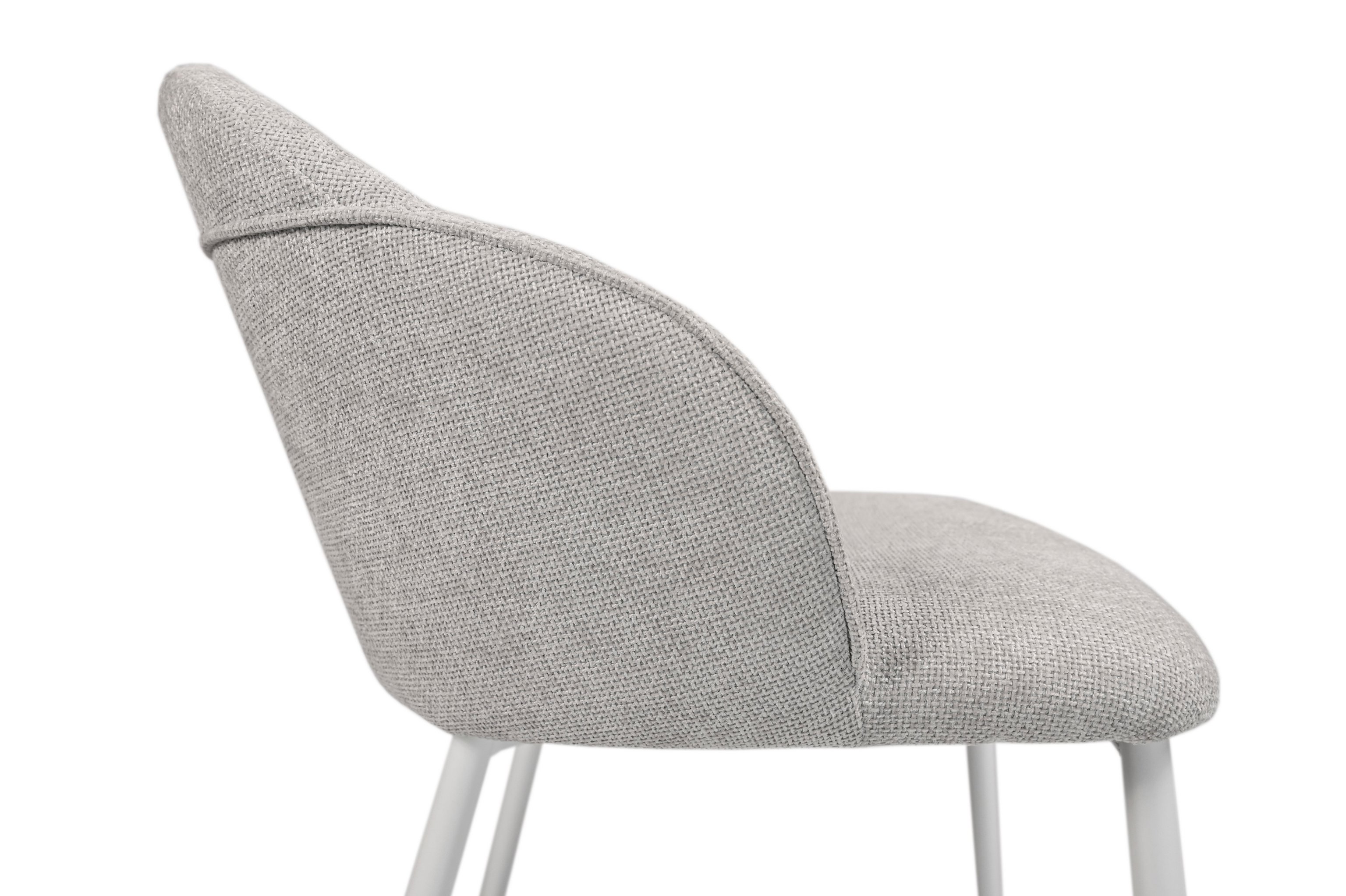 Підлокітники та зручна форма сидіння забезпечують комфорт під час тривалого сидіння — як за обіднім столом, так і в зонах відпочинку. Металеві ніжки, пофарбовані у білий колір, додають конструкції легкості та свіжості, утворюючи контраст з темною оббивкою.