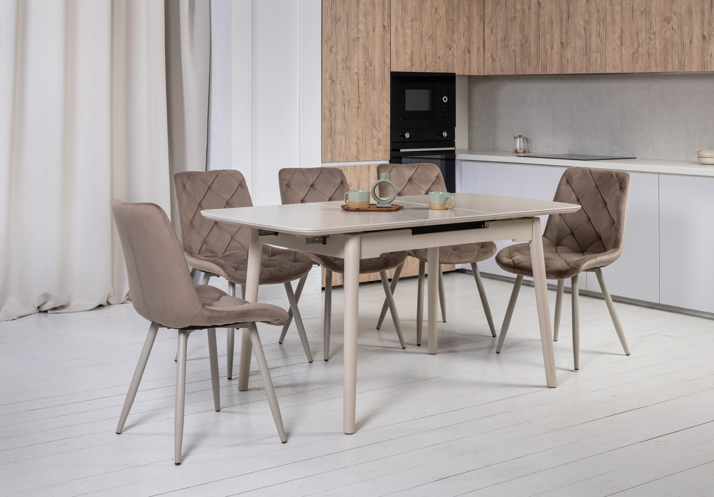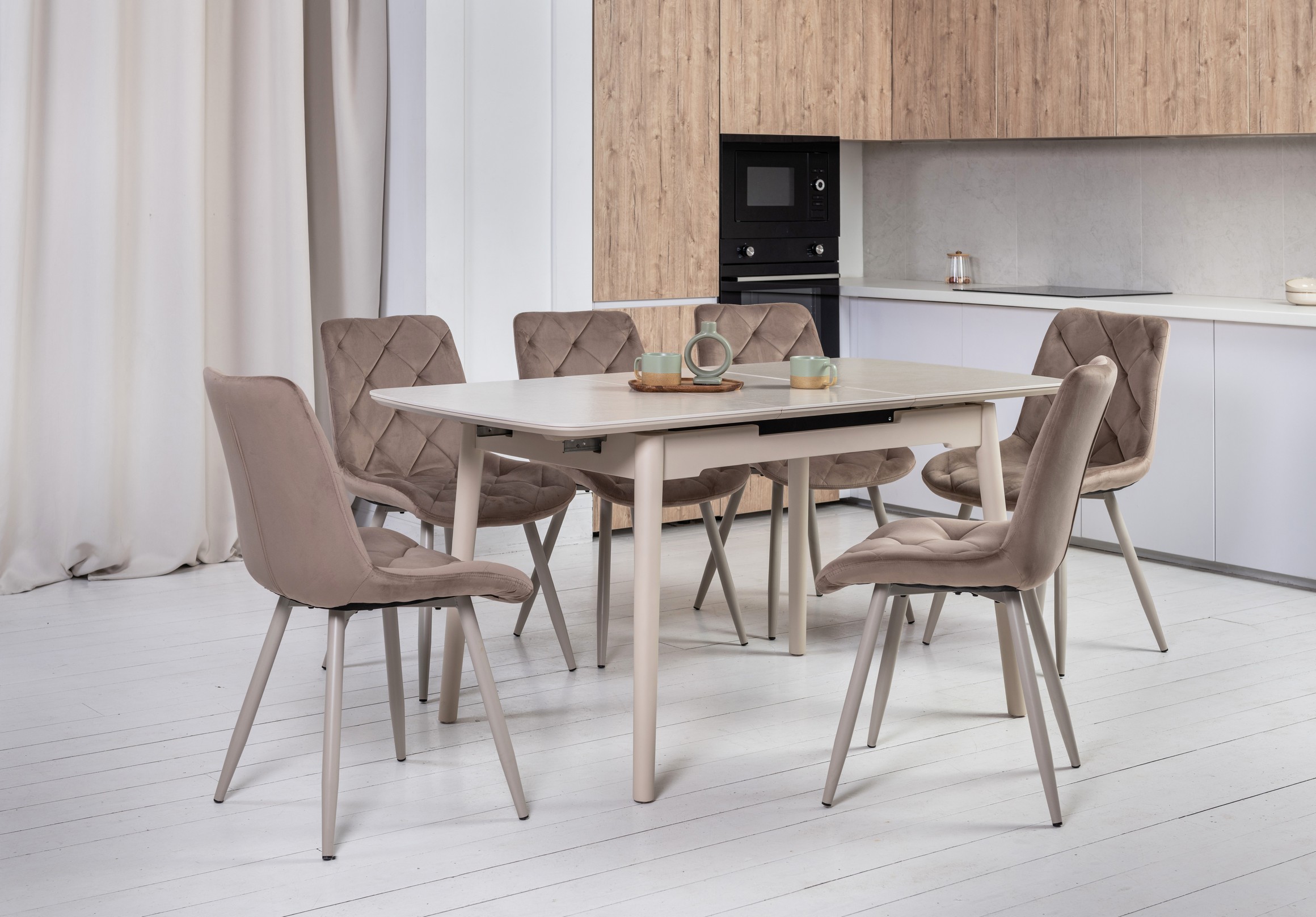 Ця модель добре впишеться в інтер’єр кухні, їдальні або вітальні, додаючи простору тепла й затишку, зберігаючи при цьому нейтральну естетику.