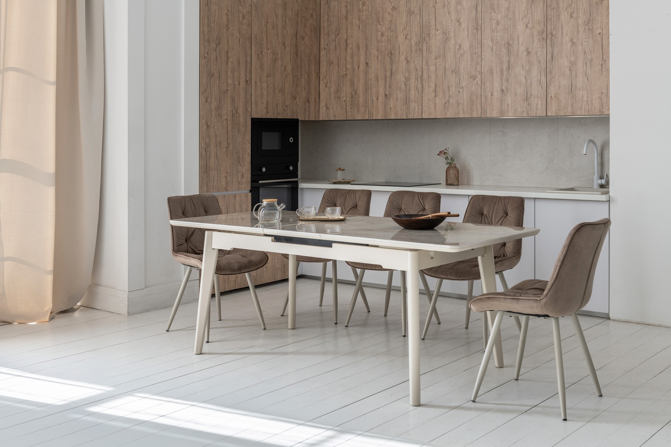 Ергономічна форма сидіння забезпечує комфорт під час тривалого сидіння, а висота 46 см ідеально підходить для обіднього столу. Металева основа, пофарбована в тон оббивки, робить конструкцію міцною та стійкою, підкреслюючи при цьому цілісність дизайну.
