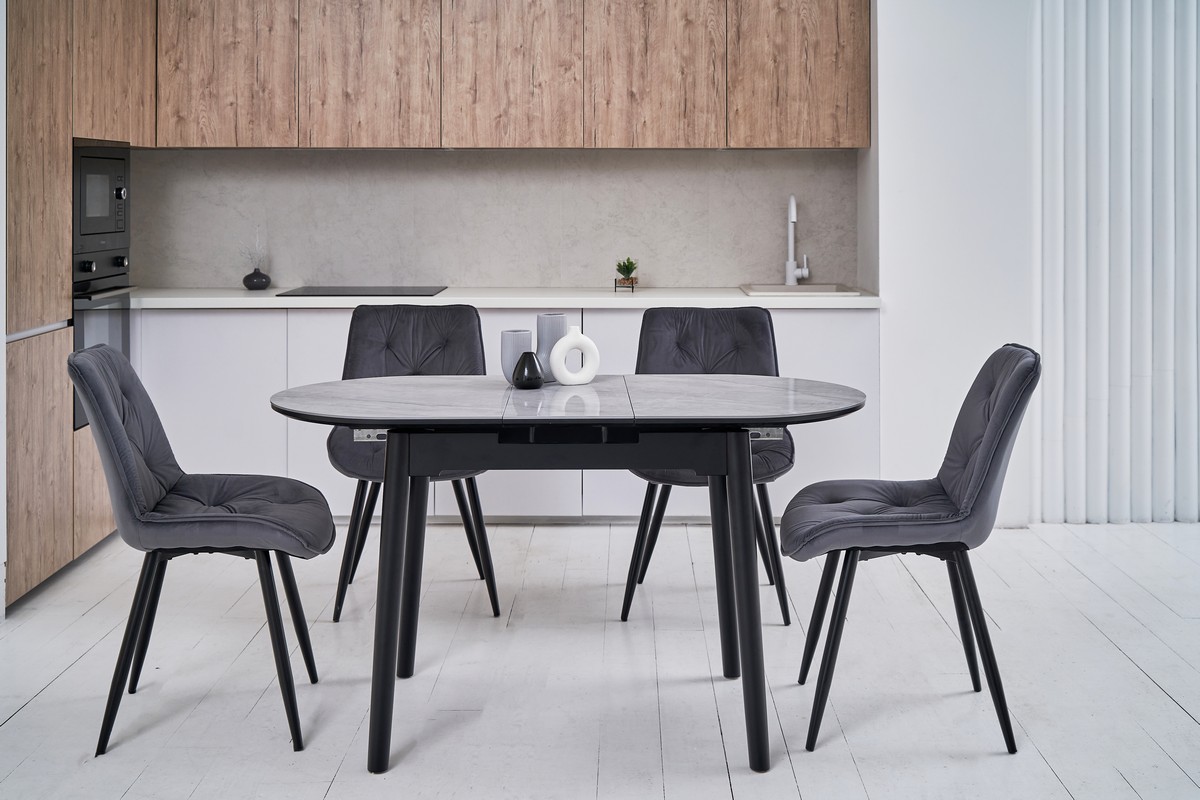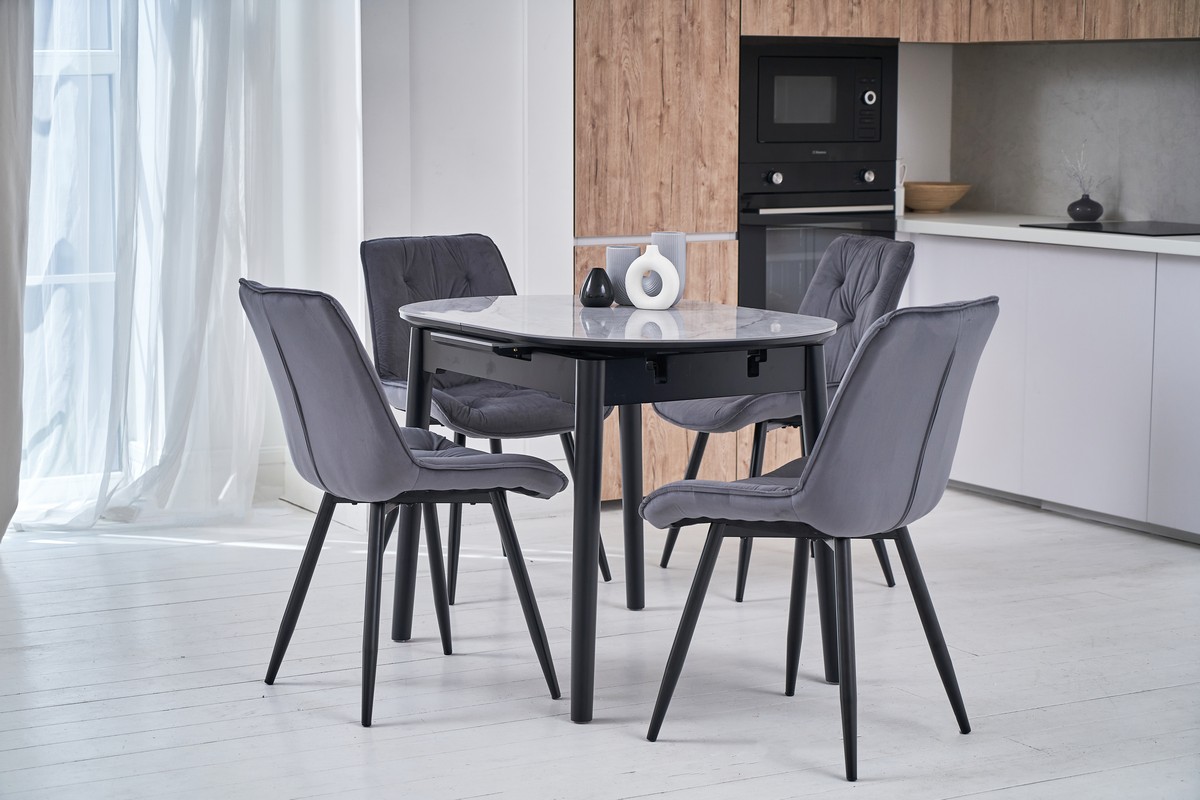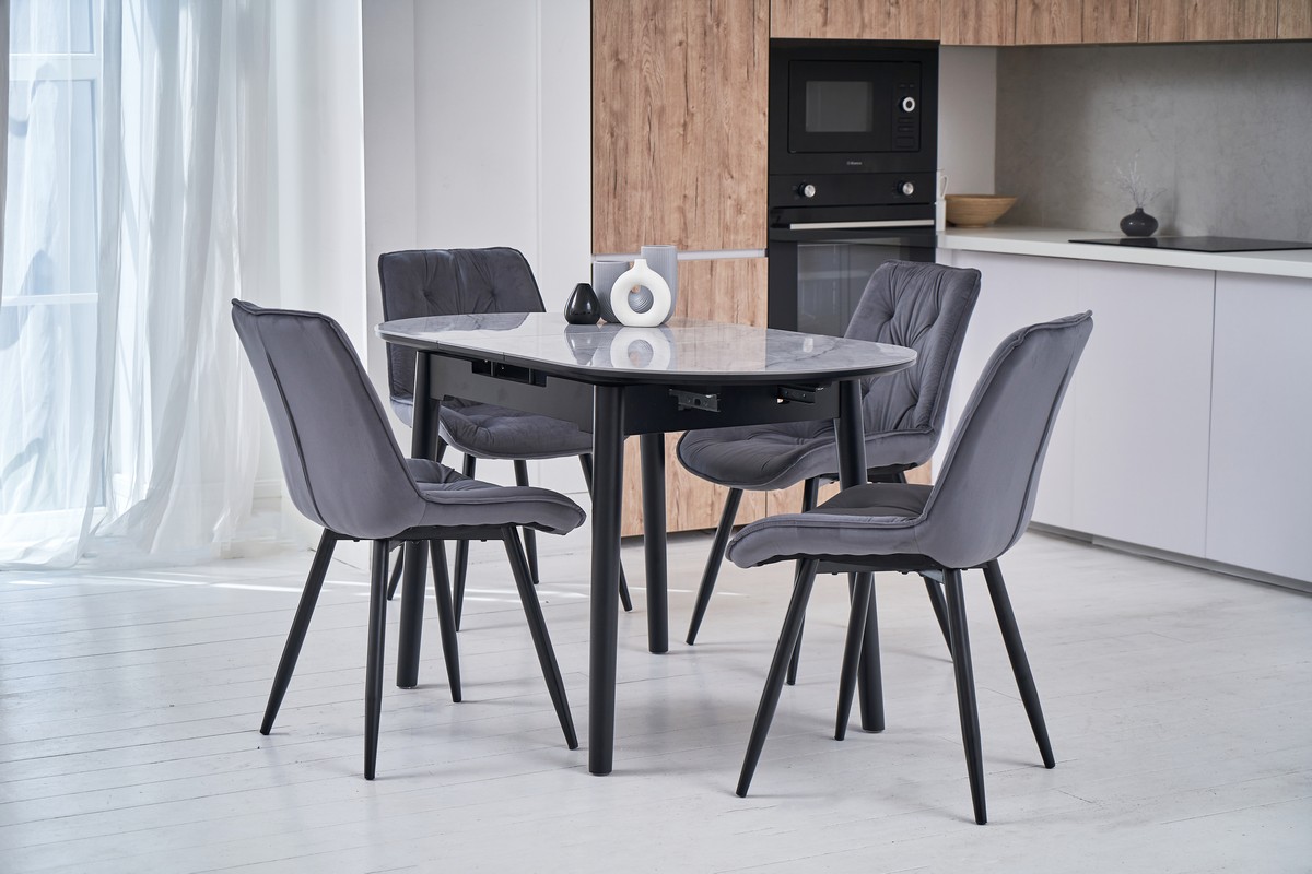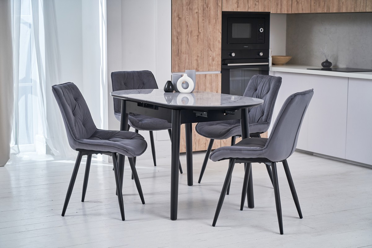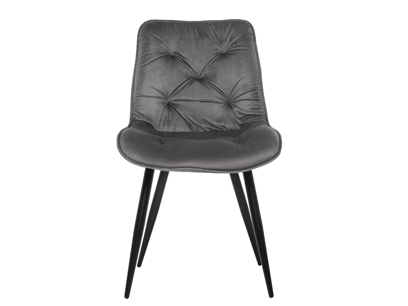 Стілець M-48 у поєднанні сірого велюру та чорного каркаса — це втілення стриманої елегантності та сучасної витонченості. Сірий відтінок оббивки надає стільцю нейтральності та спокою, органічно поєднуючись з чорним каркасом, який додає йому контрасту та глибини. М’яка велюрова тканина дарує комфорт і створює затишок, а її текстура підкреслює стильний вигляд моделі.