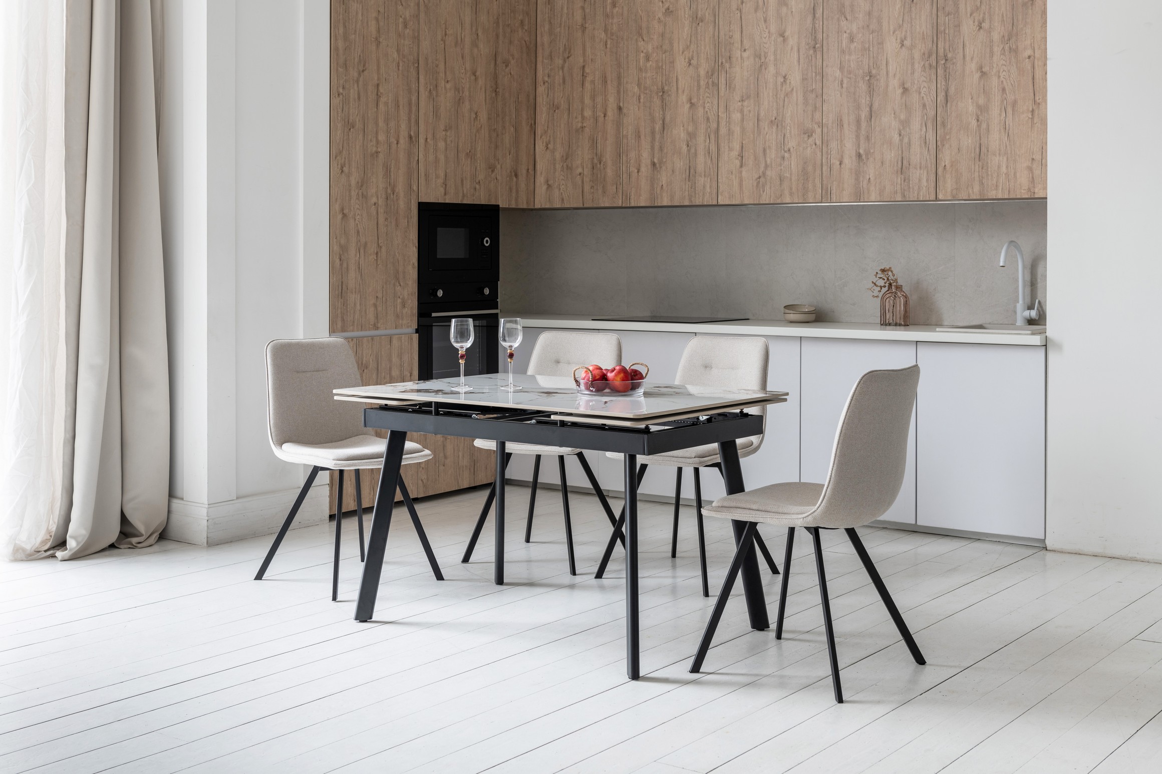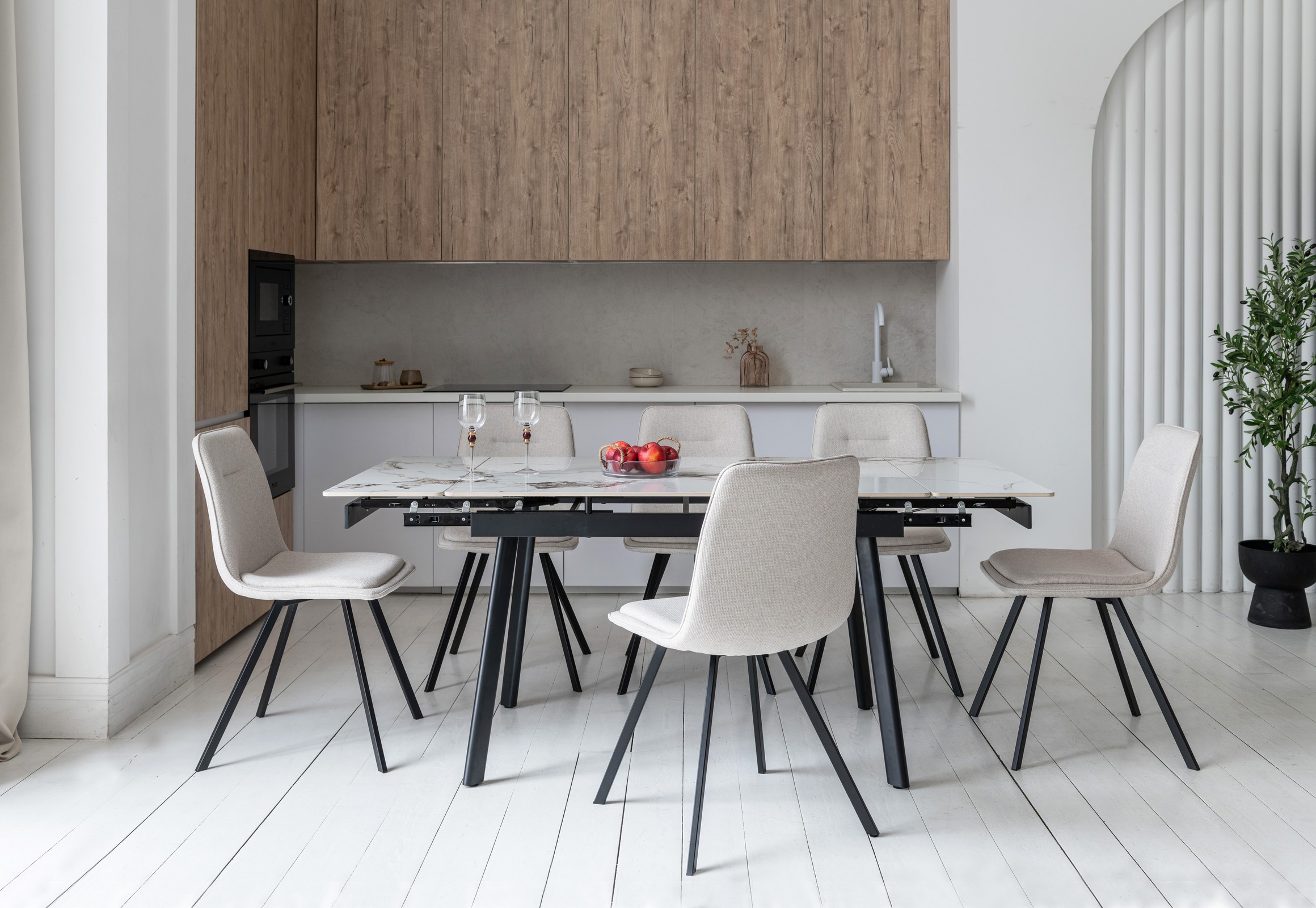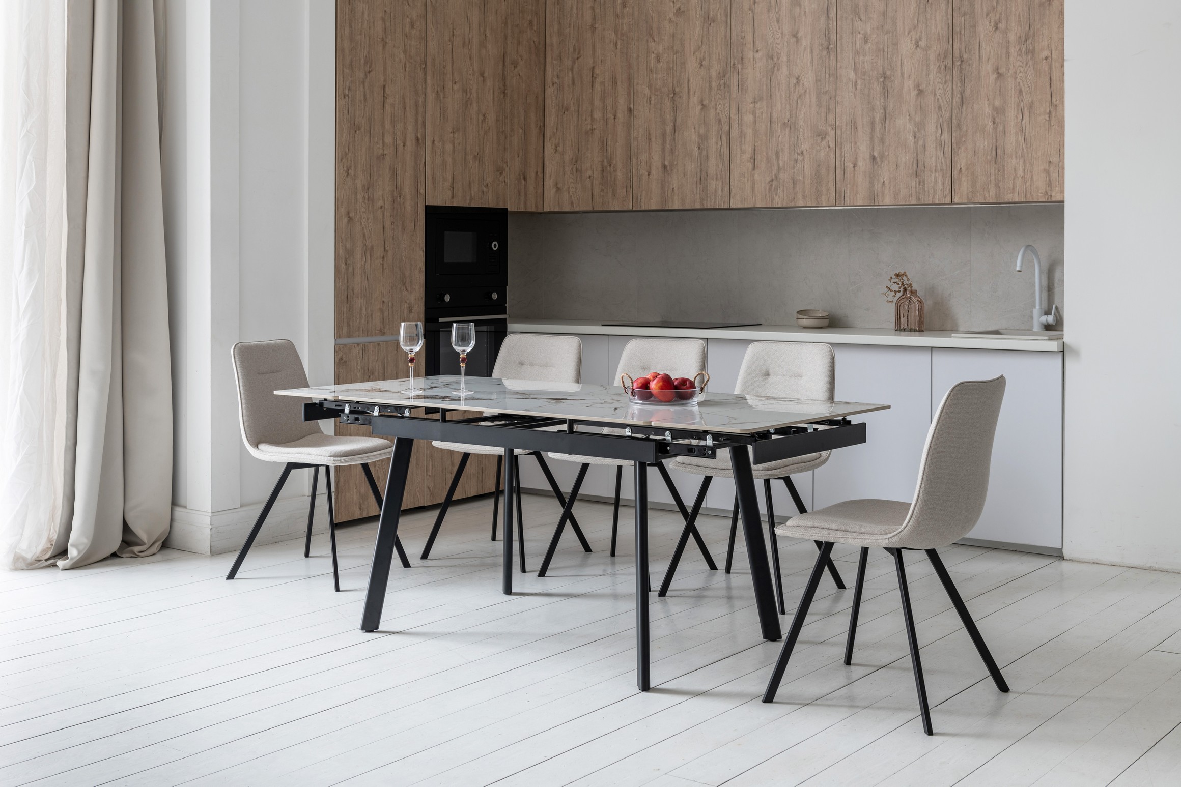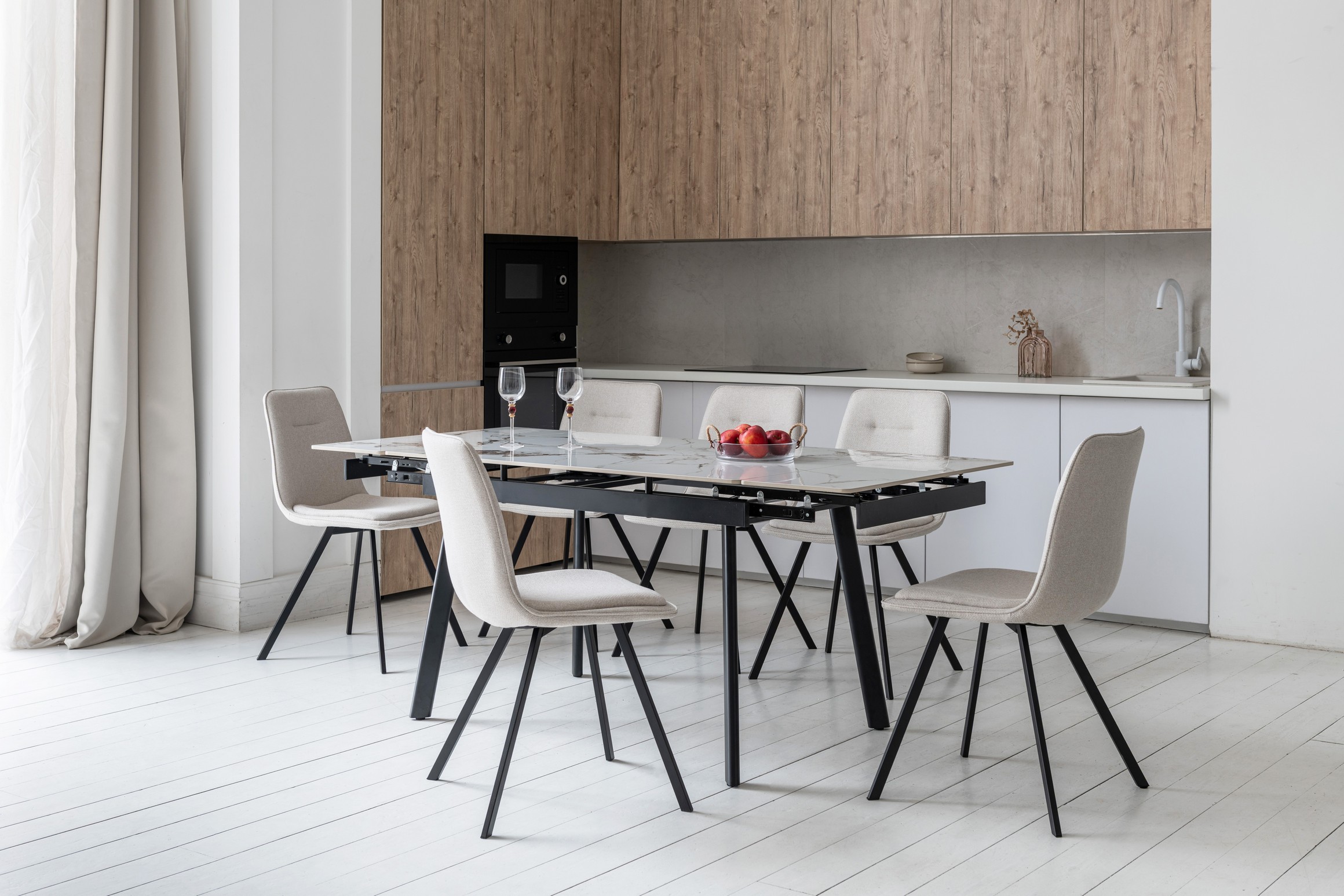 Ширина сидіння (46 см) і глибина (55.5 см) забезпечують достатній простір для комфортного сидіння. Висота до сидіння 49.5 см є стандартною і підходить для більшості обідніх столів.