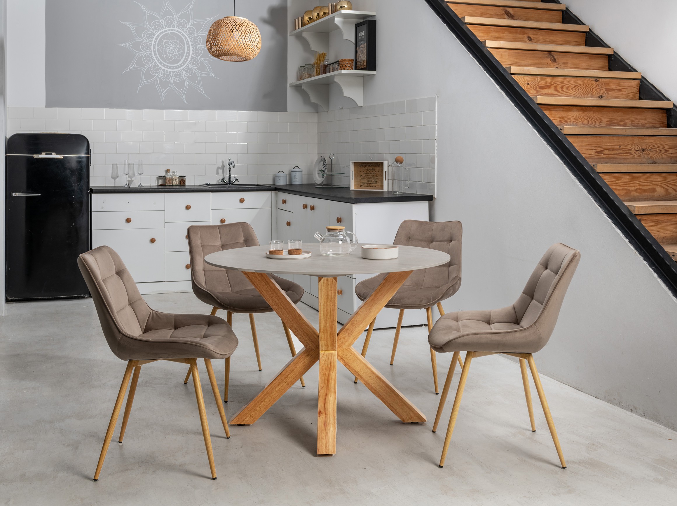 Стілець N-45 у кольорі "капучино велюр + дуб" — це вдале поєднання елегантності та сучасності. Сидіння, обтягнуте м'яким велюром у теплом відтінку капучино, додає інтер’єру затишку та розкоші, а його текстура робить виріб по-справжньому приємним на дотик.