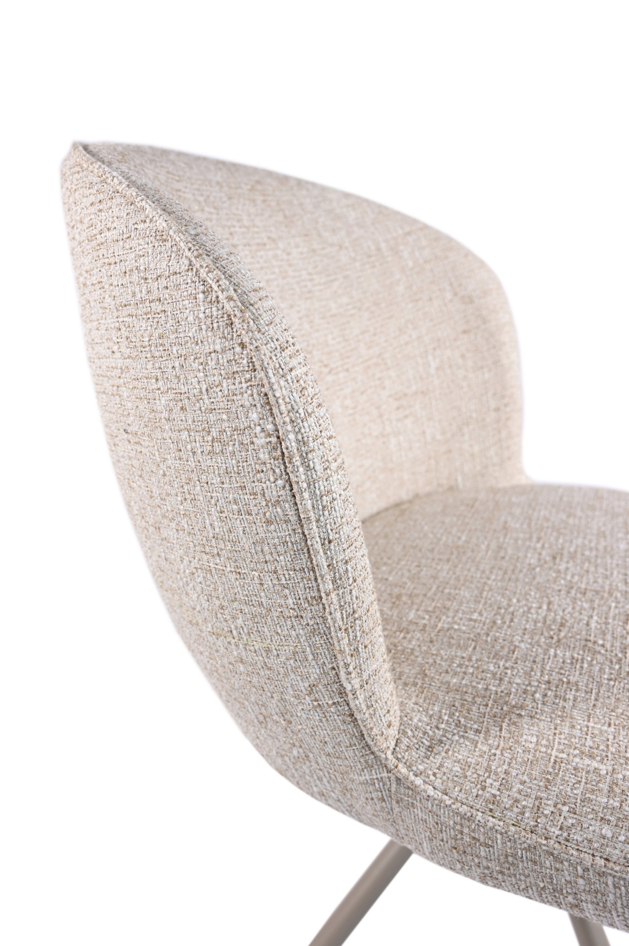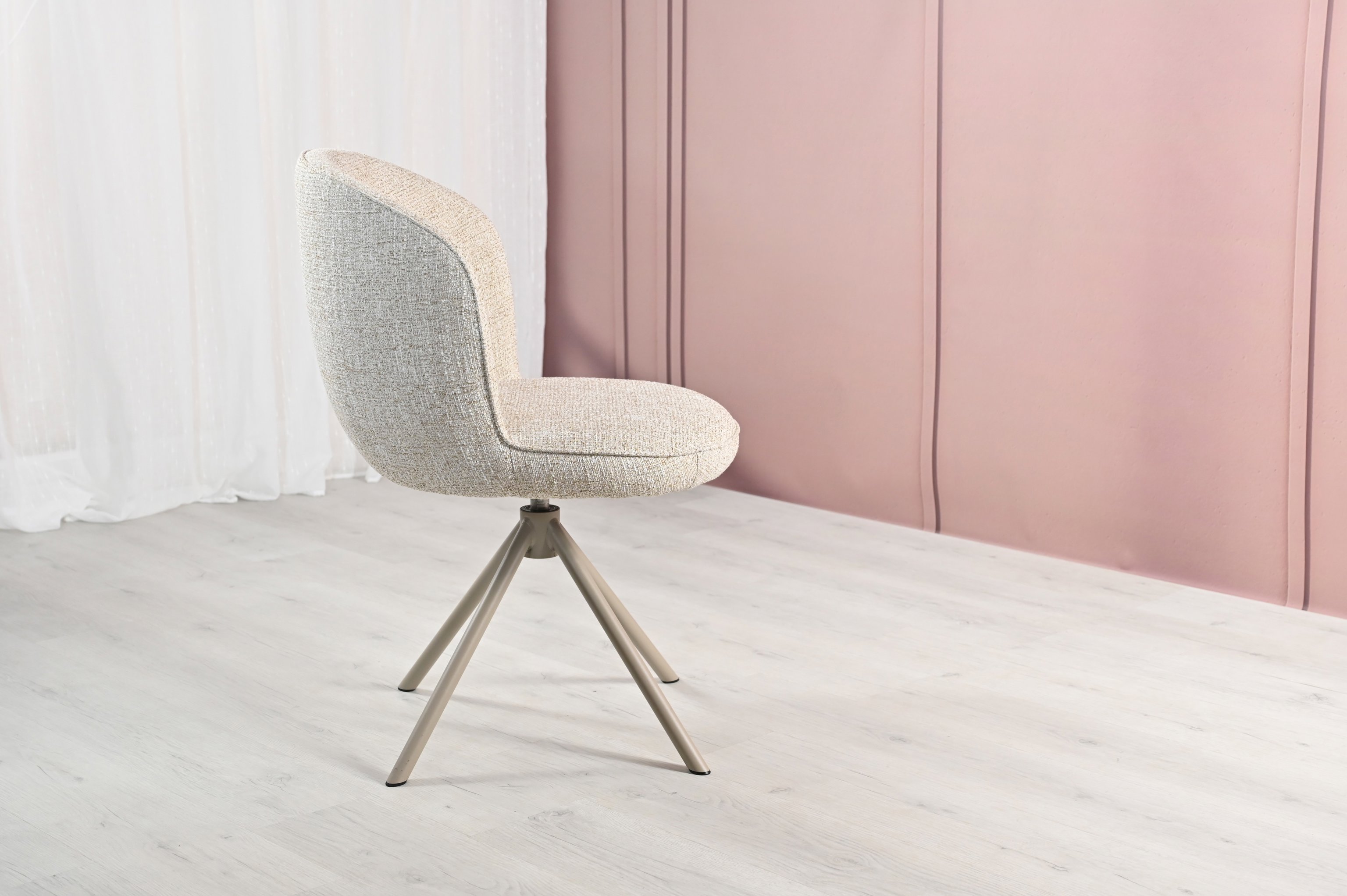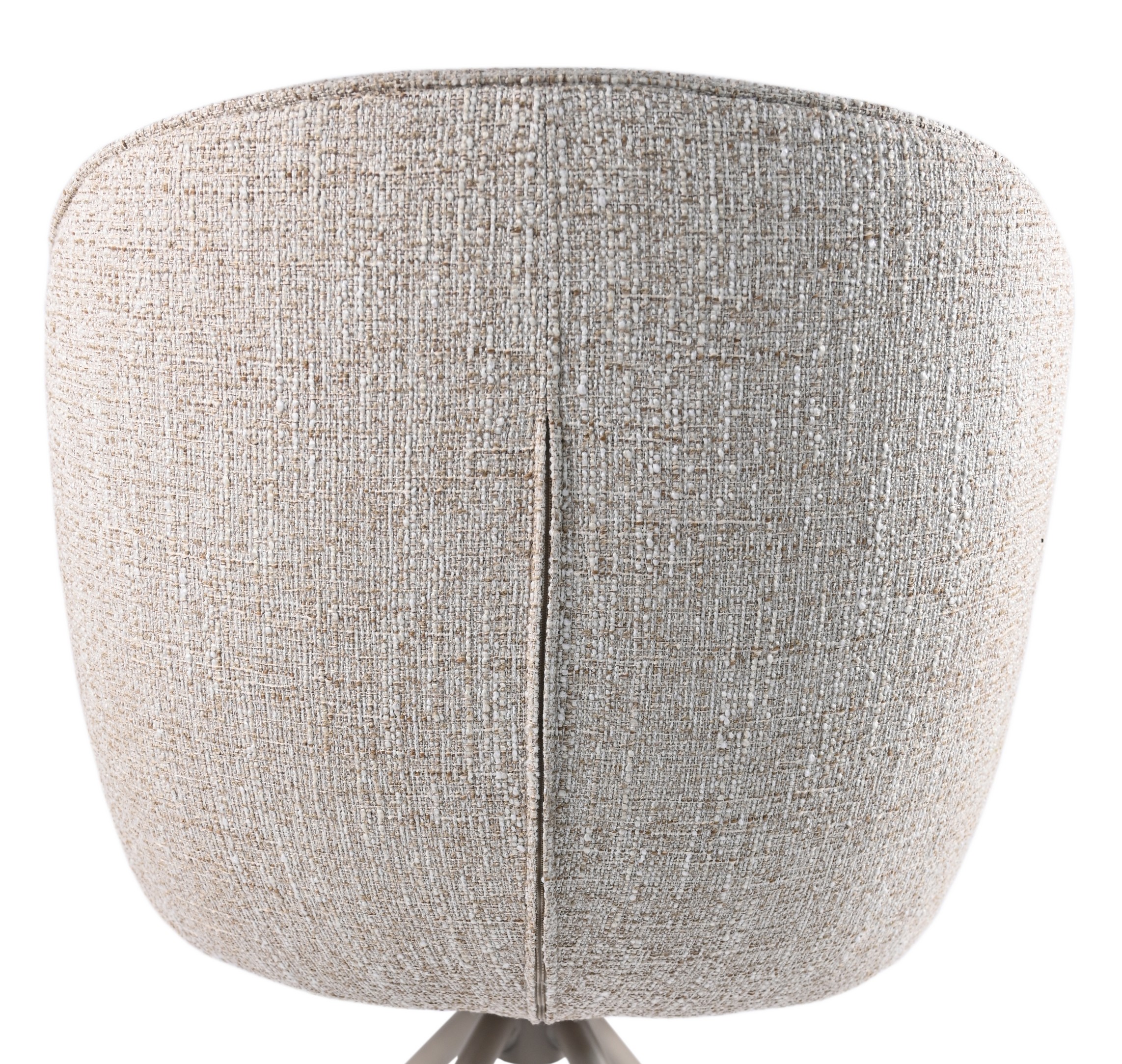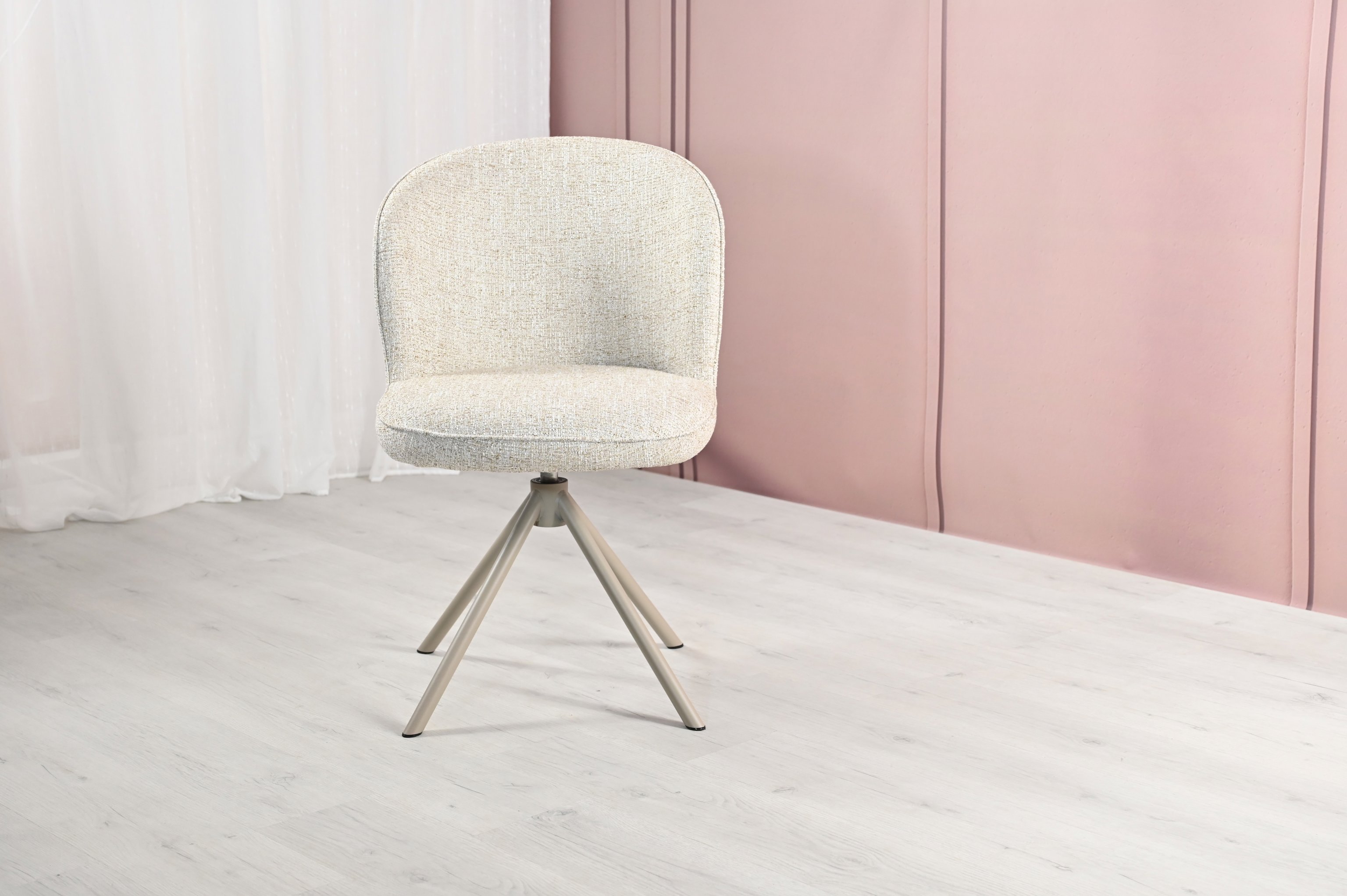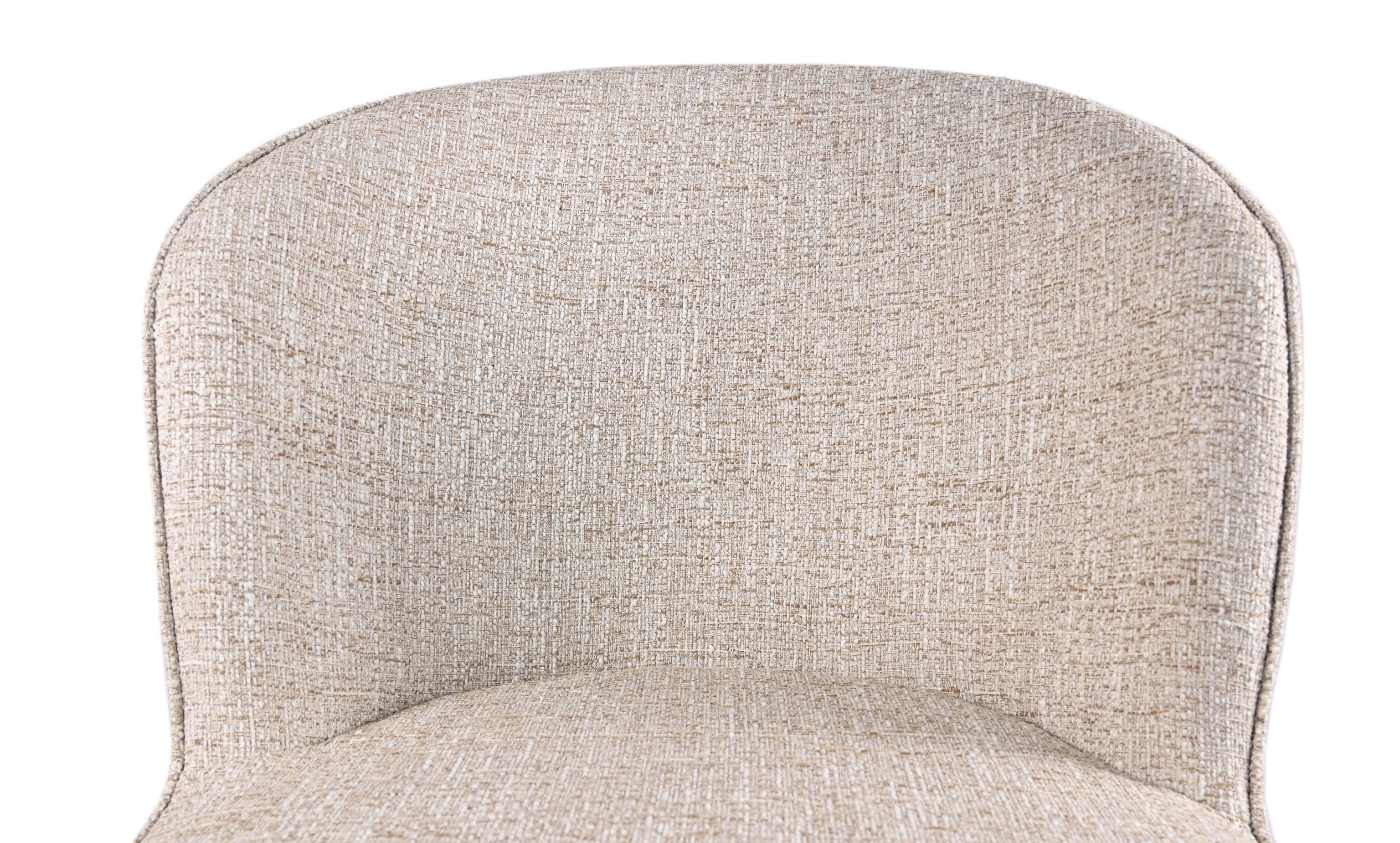 Ця модель має обертальну основу на 360° з автоповоротом, що забезпечує зручність рухів та мобільність. Оббивка з високоякісного твиду у відтінку "френч ваніль" виглядає витончено та приємно на дотик. Теплий відтінок ванілі надає стільцю легкості та розкішного вигляду, гармонійно поєднуючись з капучиновими металевими ніжками, що додають елегантності.