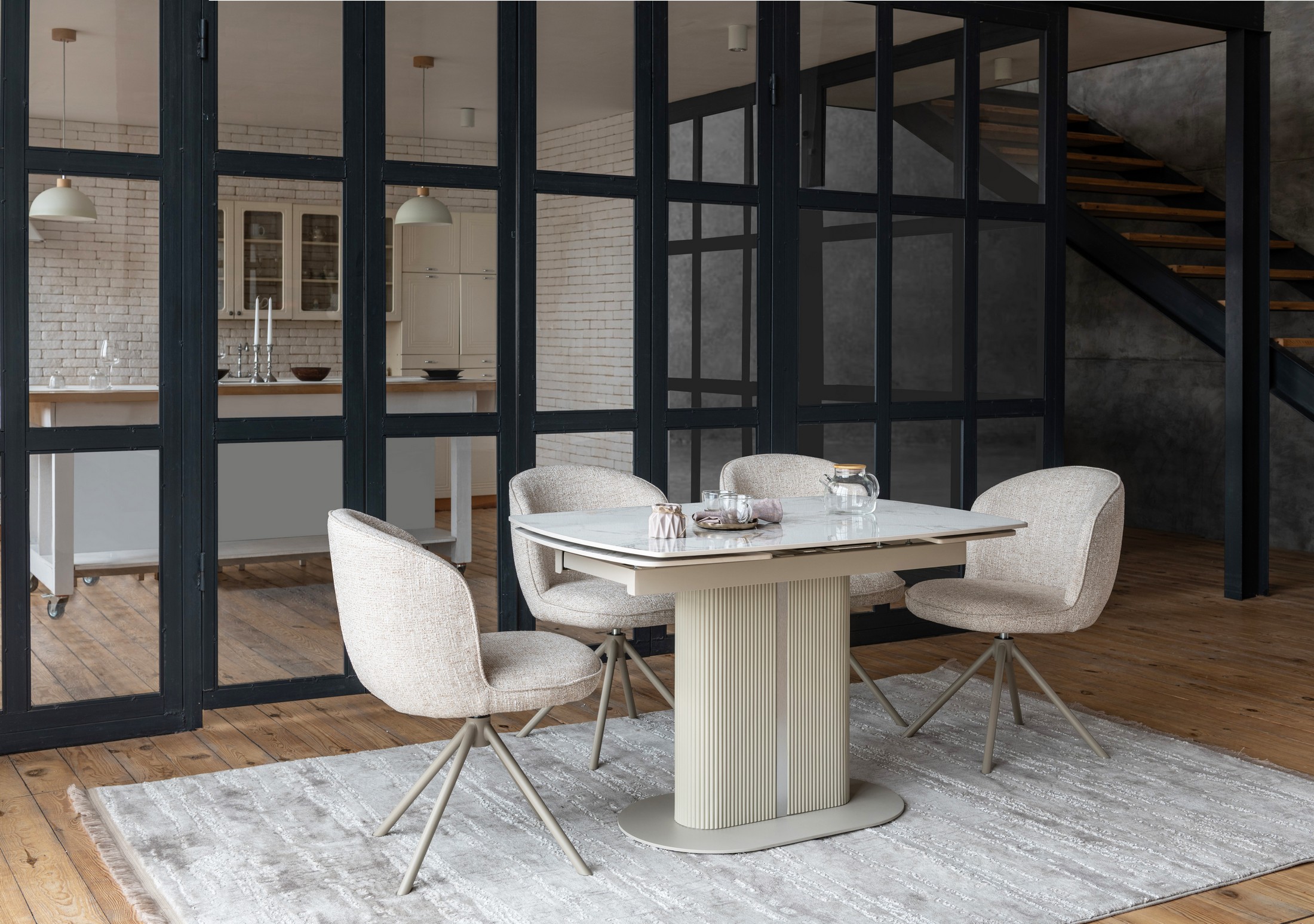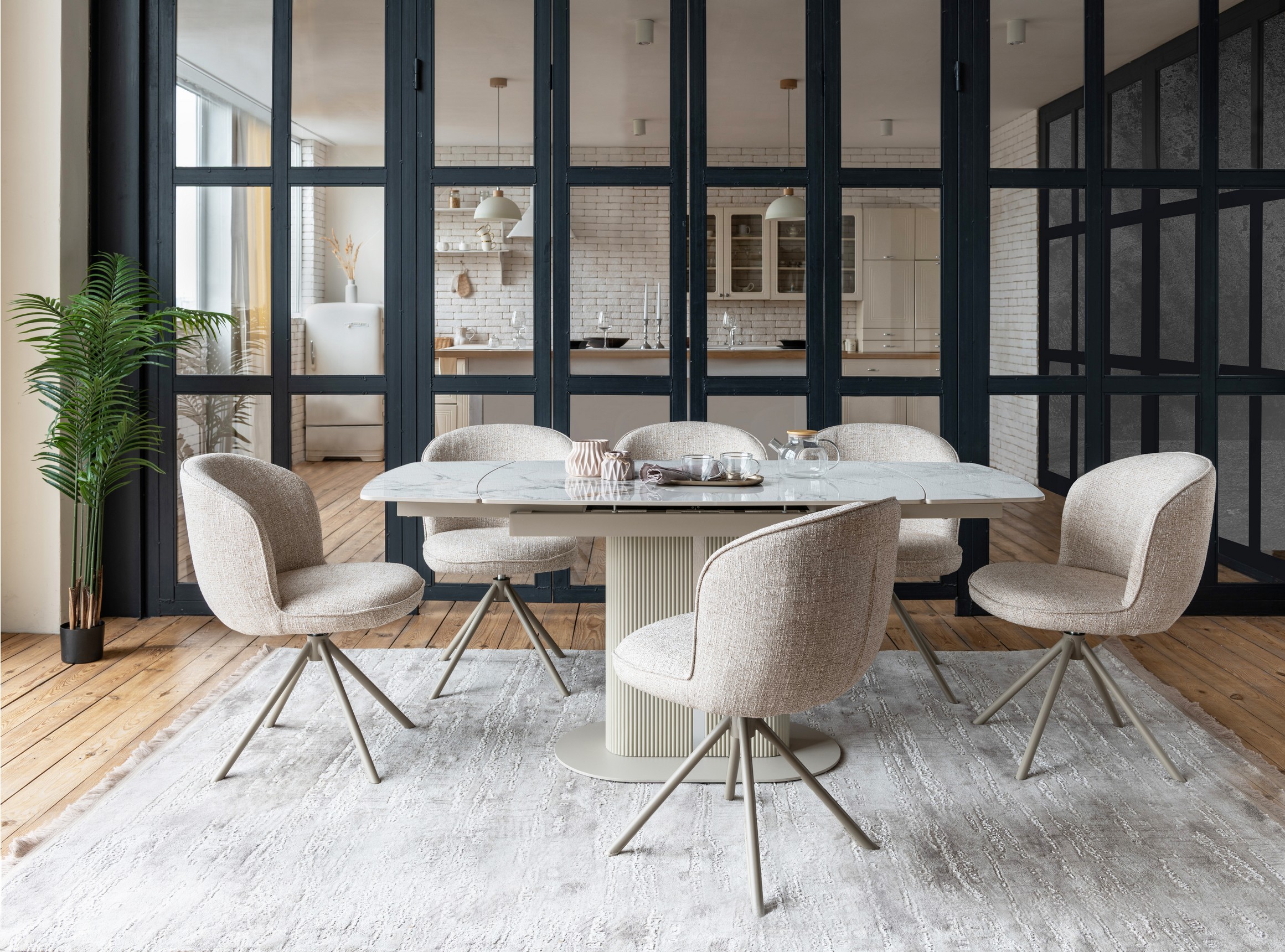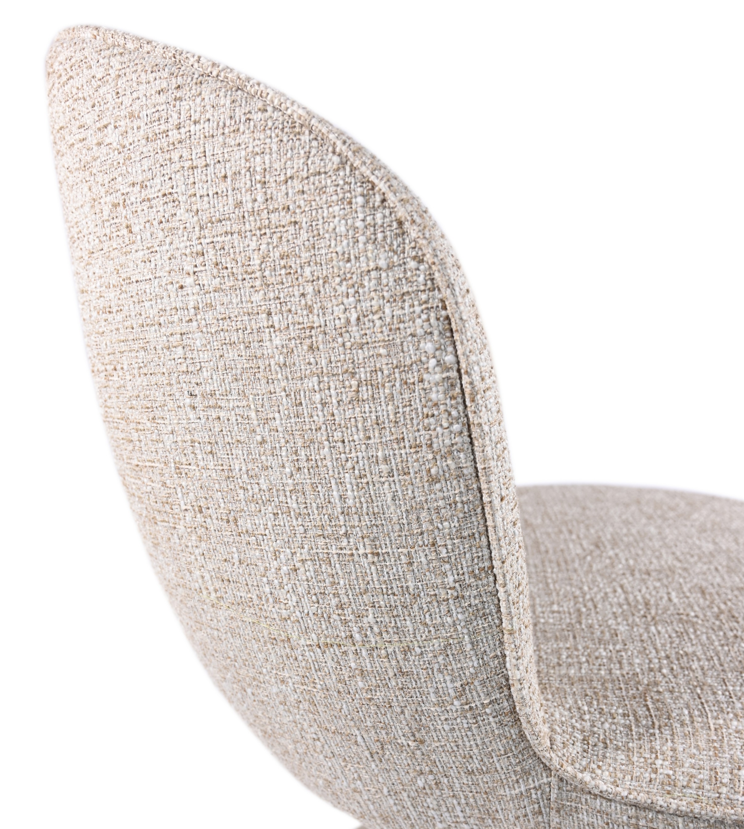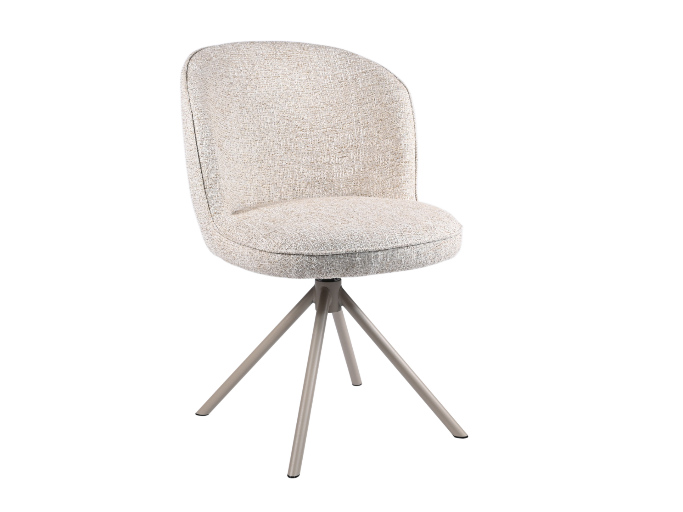 Ця модель має обертальну основу на 360° з автоповоротом, що забезпечує зручність рухів та мобільність. Оббивка з високоякісного твиду у відтінку "френч ваніль" виглядає витончено та приємно на дотик. Теплий відтінок ванілі надає стільцю легкості та розкішного вигляду, гармонійно поєднуючись з капучиновими металевими ніжками, що додають елегантності.