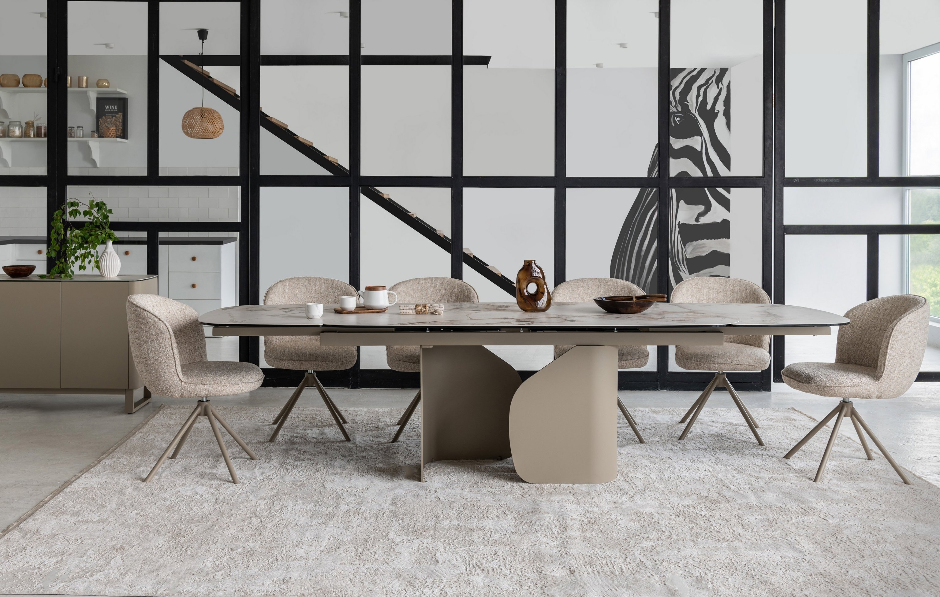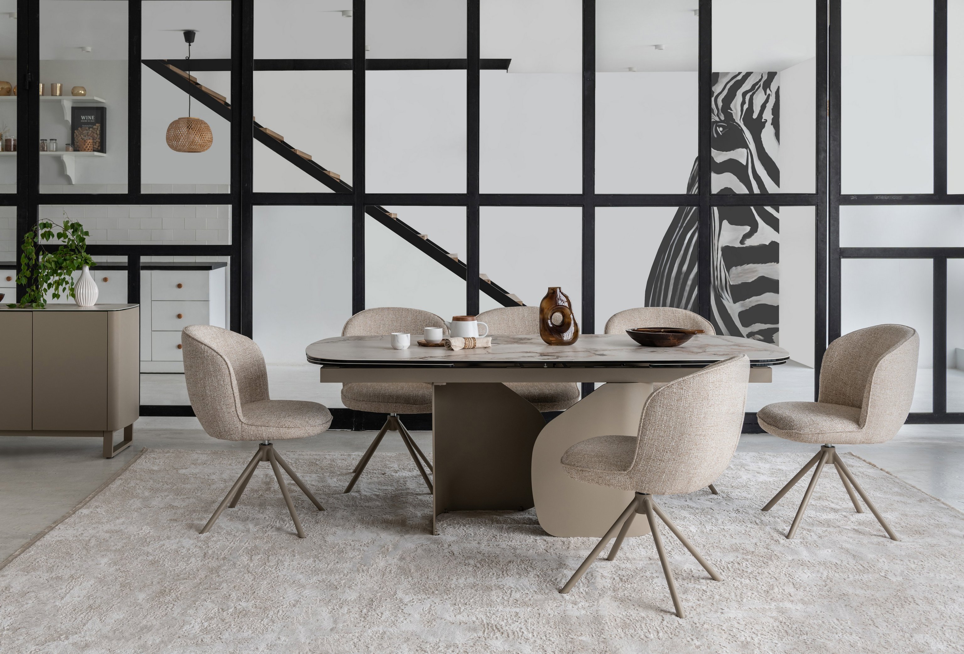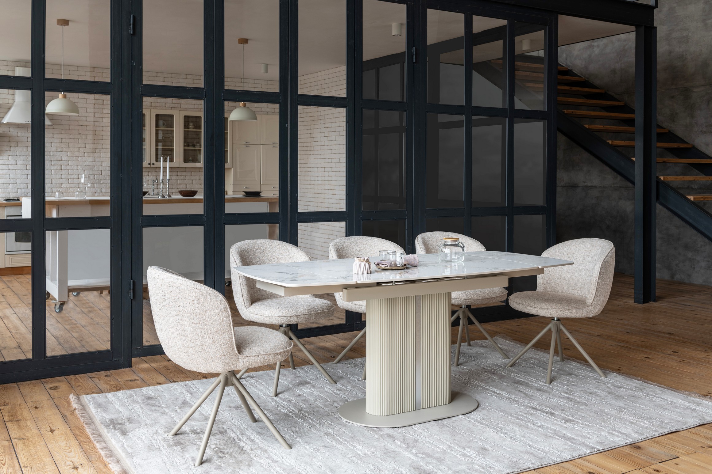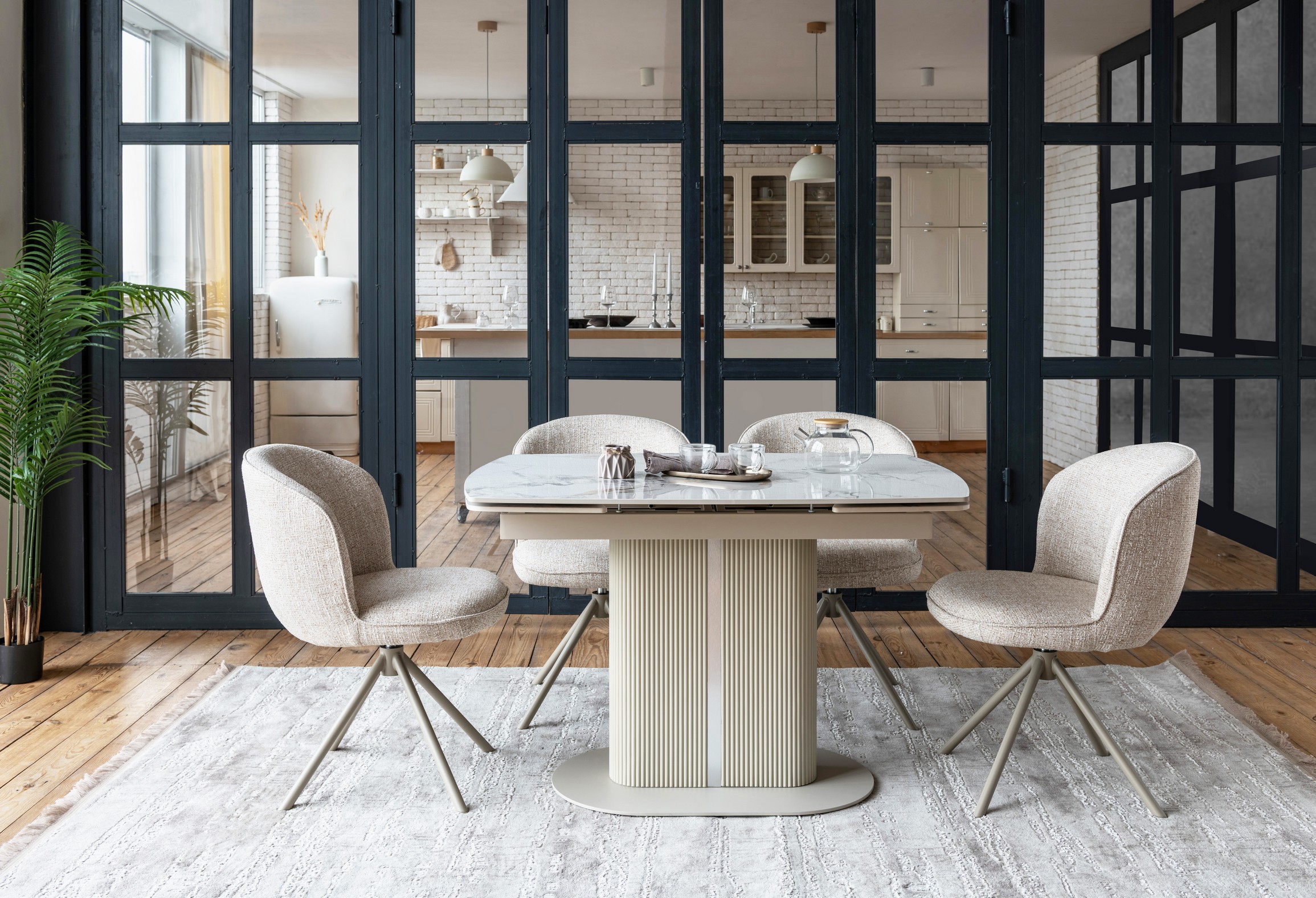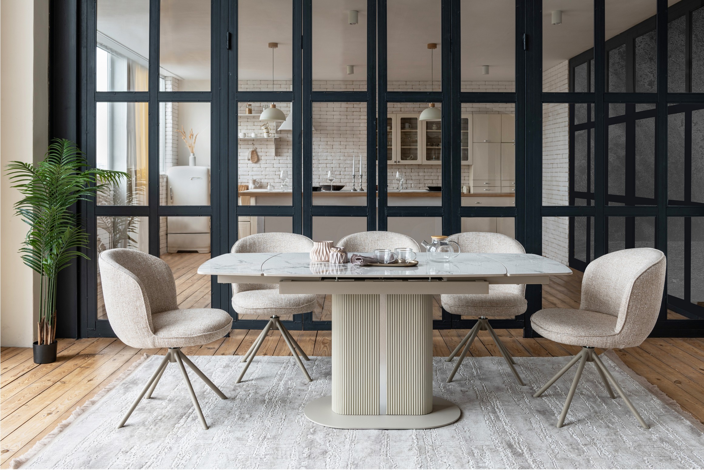 Ця модель має обертальну основу на 360° з автоповоротом, що забезпечує зручність рухів та мобільність. Оббивка з високоякісного твиду у відтінку "френч ваніль" виглядає витончено та приємно на дотик. Теплий відтінок ванілі надає стільцю легкості та розкішного вигляду, гармонійно поєднуючись з капучиновими металевими ніжками, що додають елегантності.