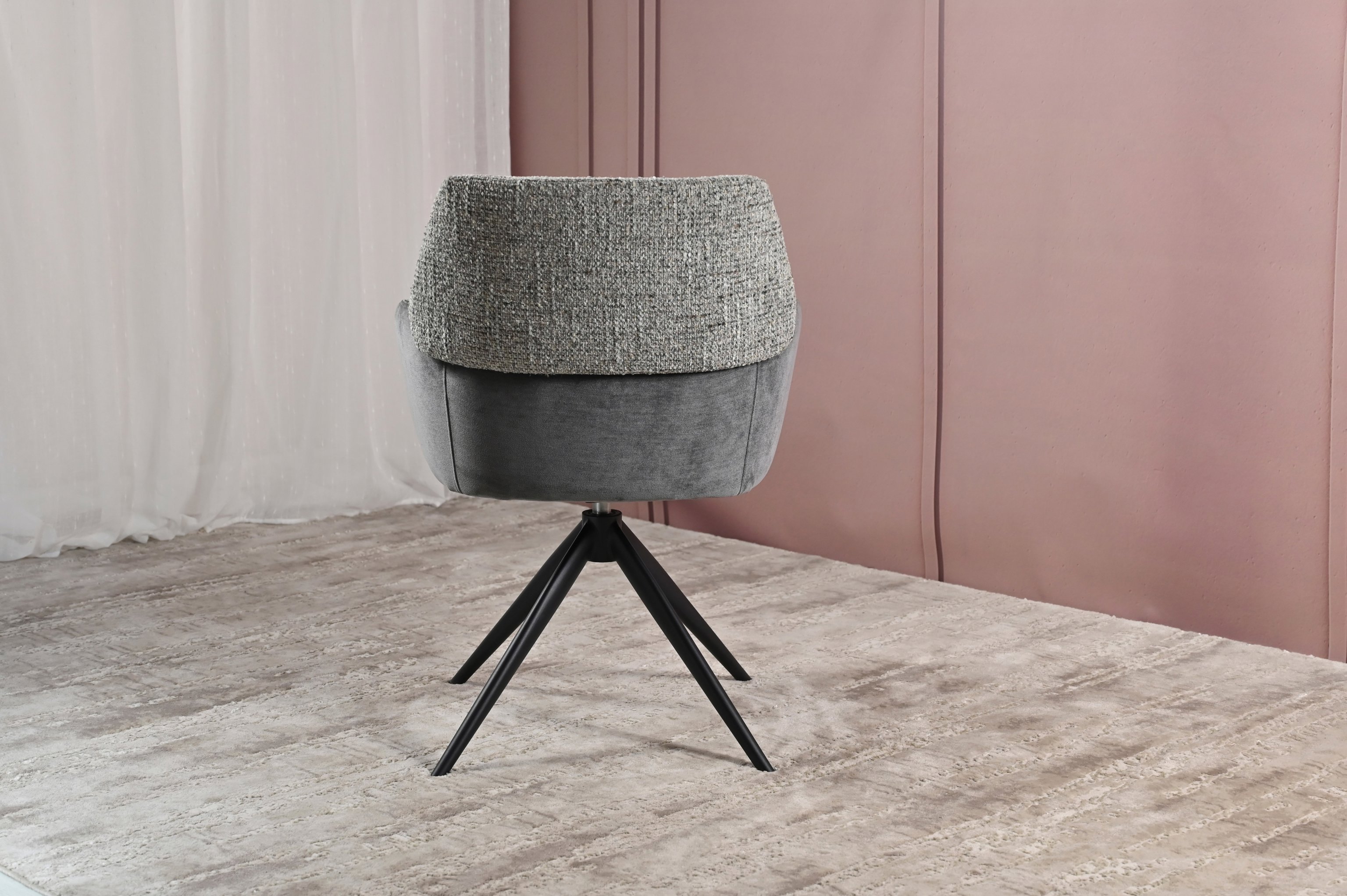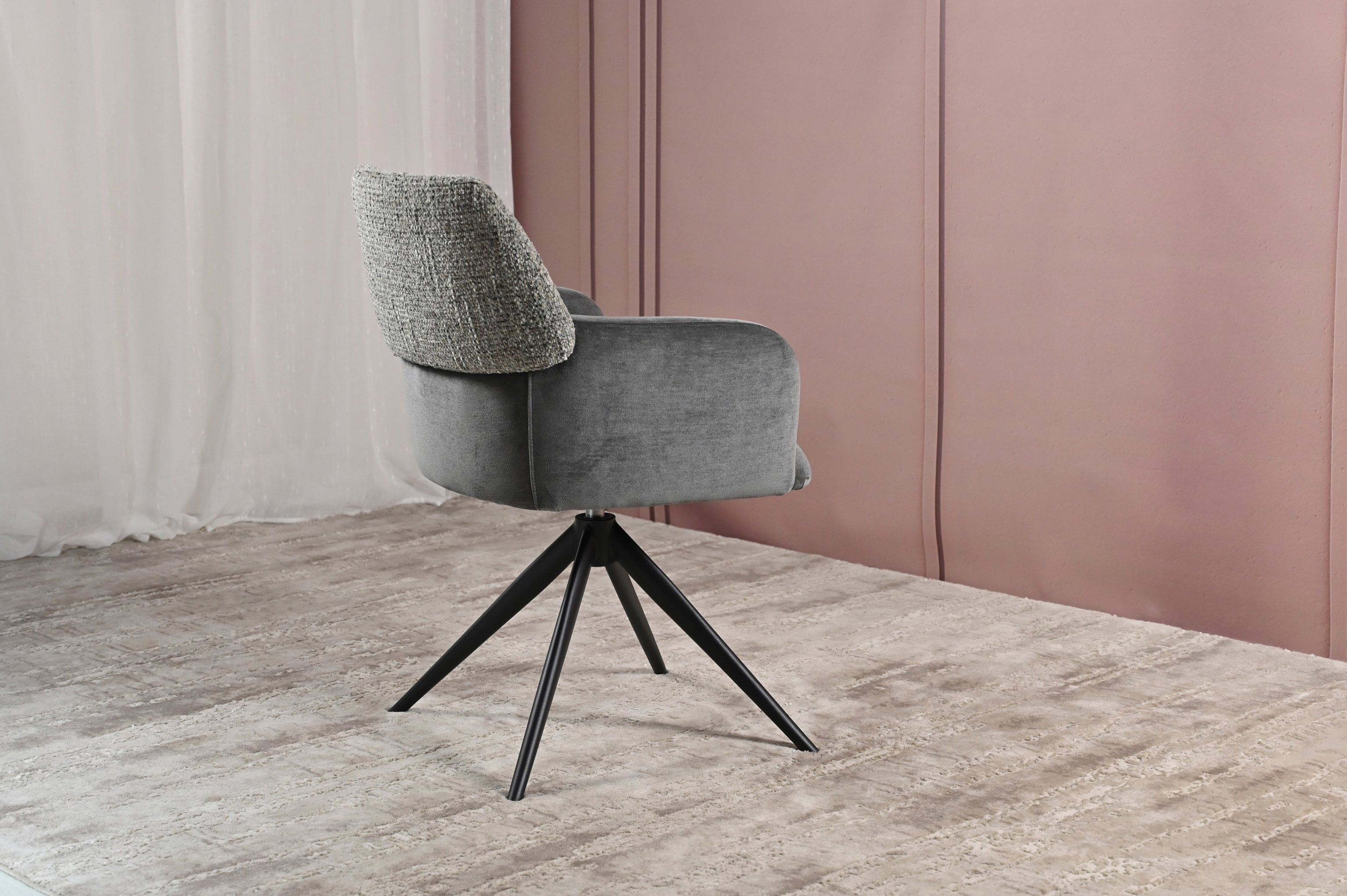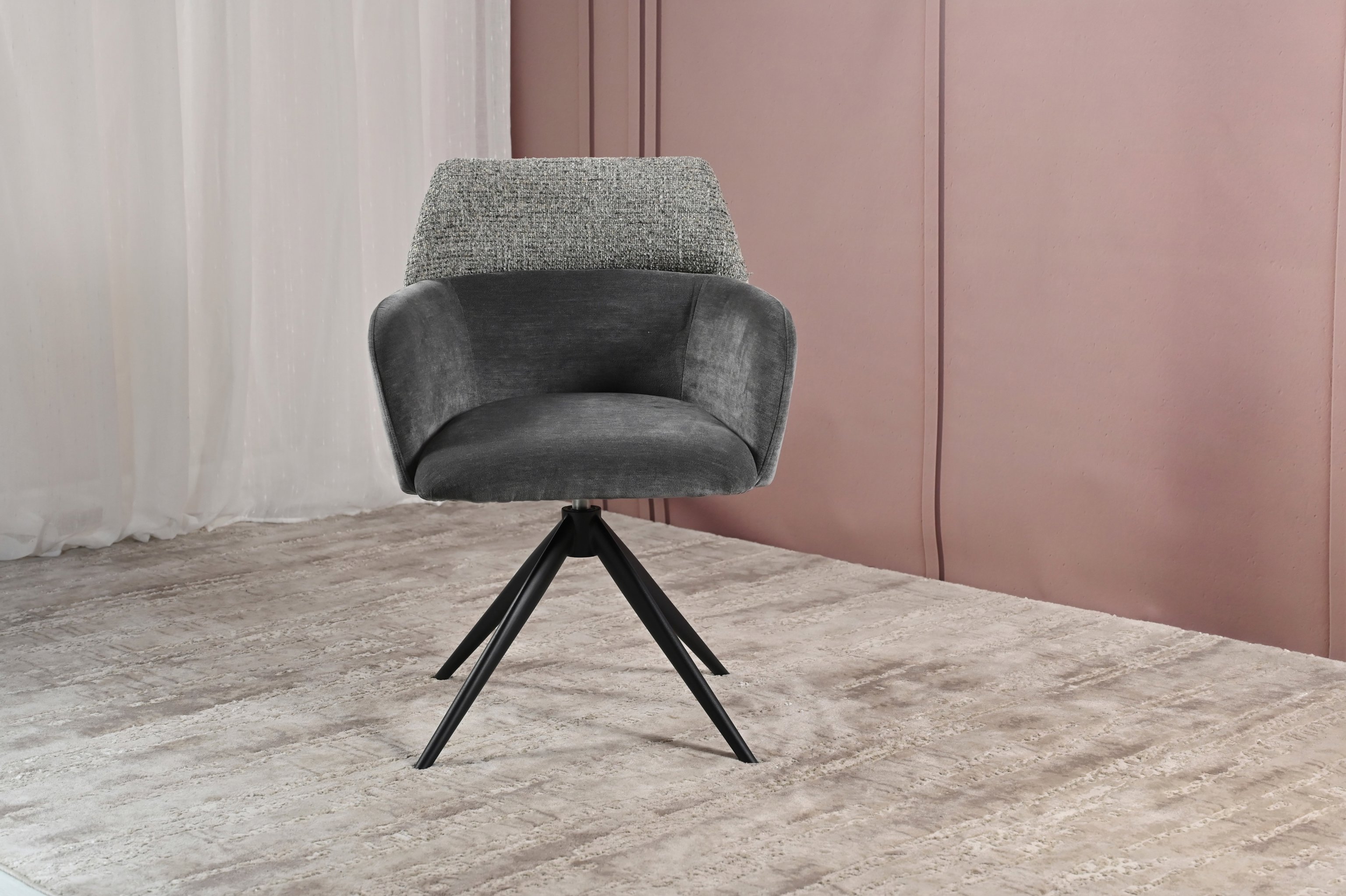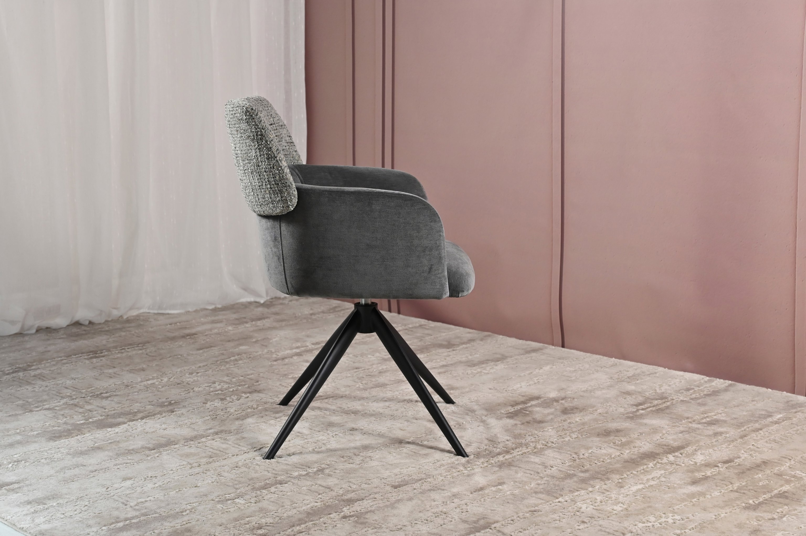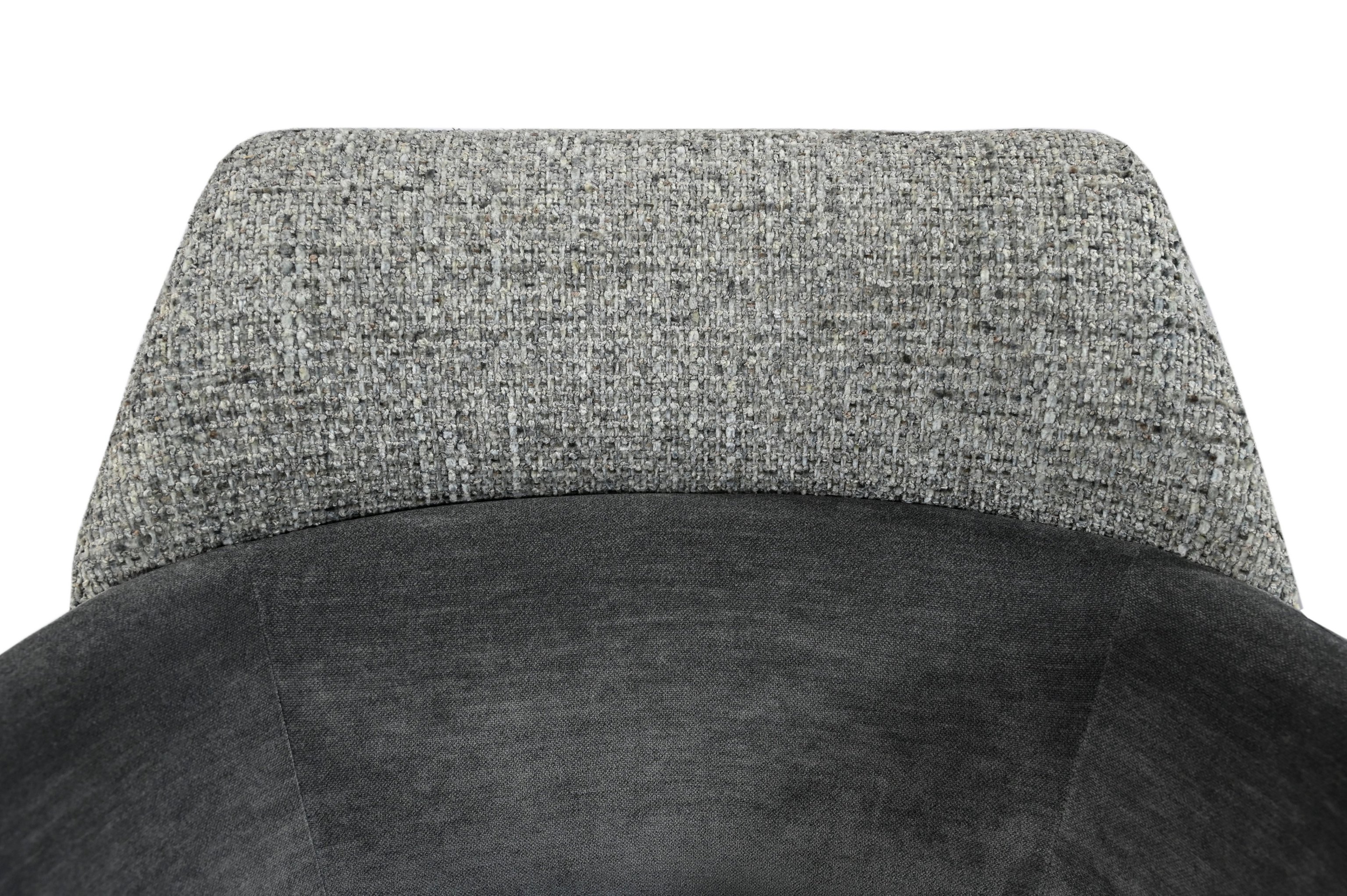 Модель має обертальну функцію на 360° з автоповоротом, що дозволяє з легкістю змінювати напрямок без потреби вставати. Оббивка з шеніллу в попільному кольорі додає стільцю м'якість і текстурну глибину, створюючи затишну атмосферу. Це кольорове рішення є універсальним і додає елегантності, чудово поєднуючись з чорними металевими ніжками, що надають конструкції стабільності.