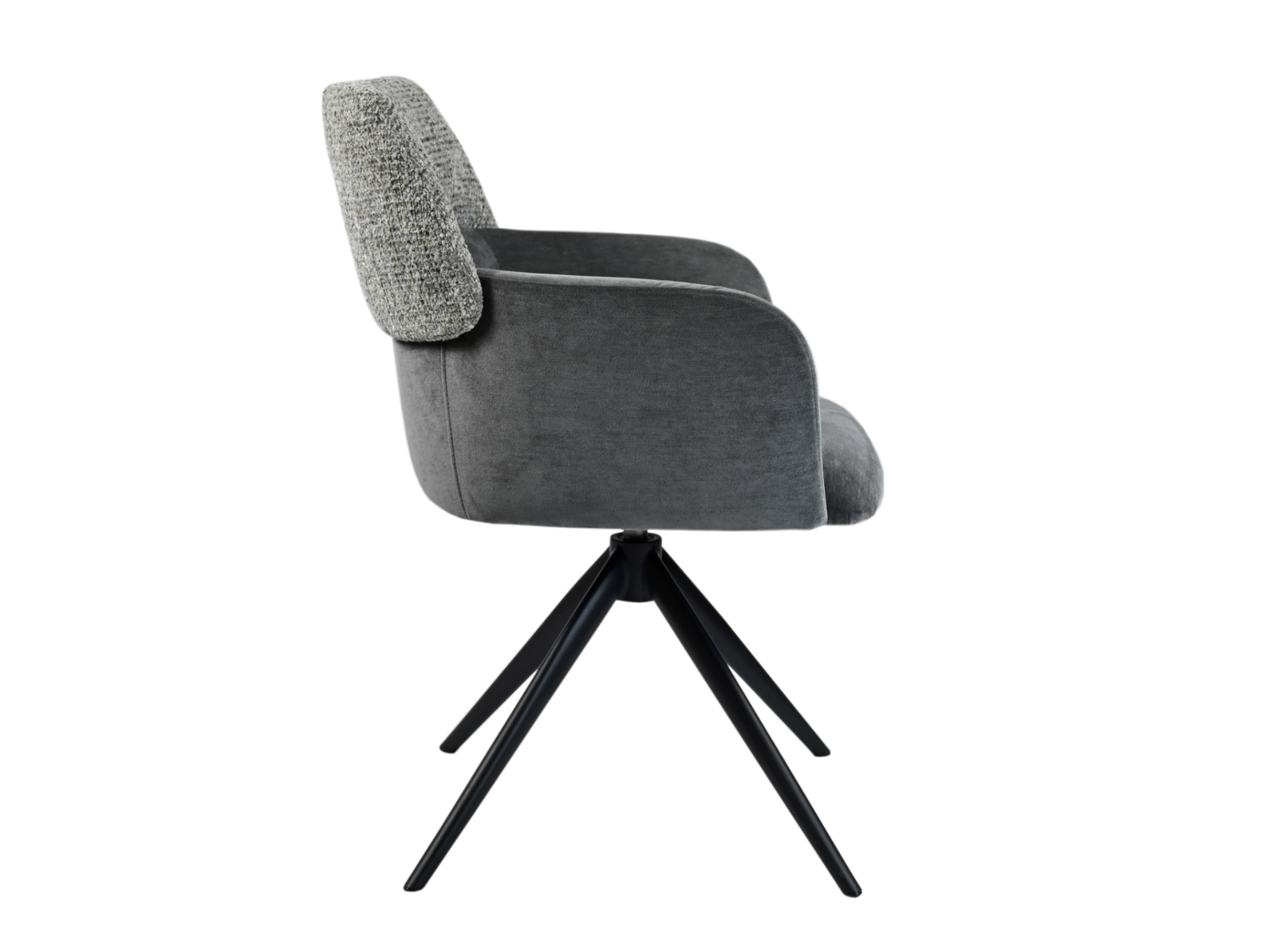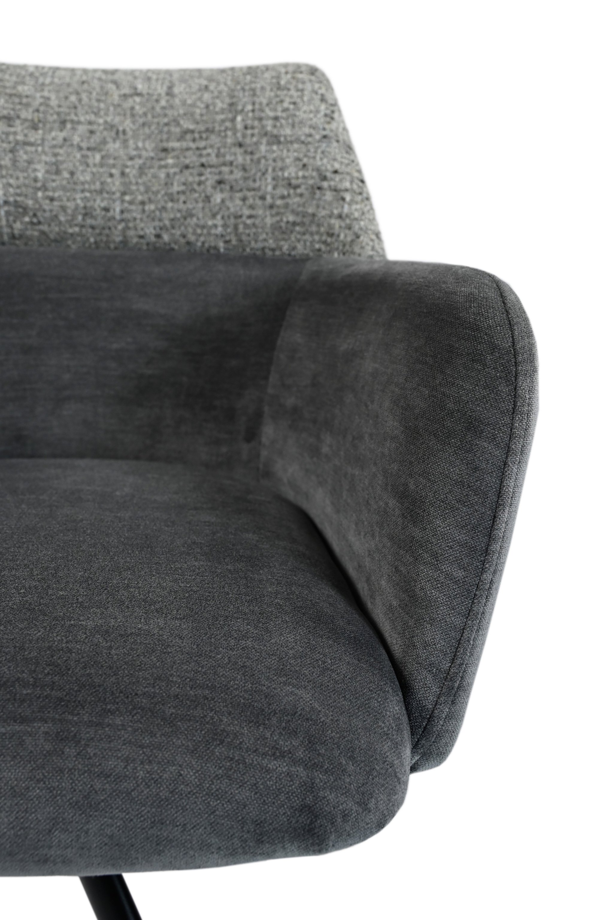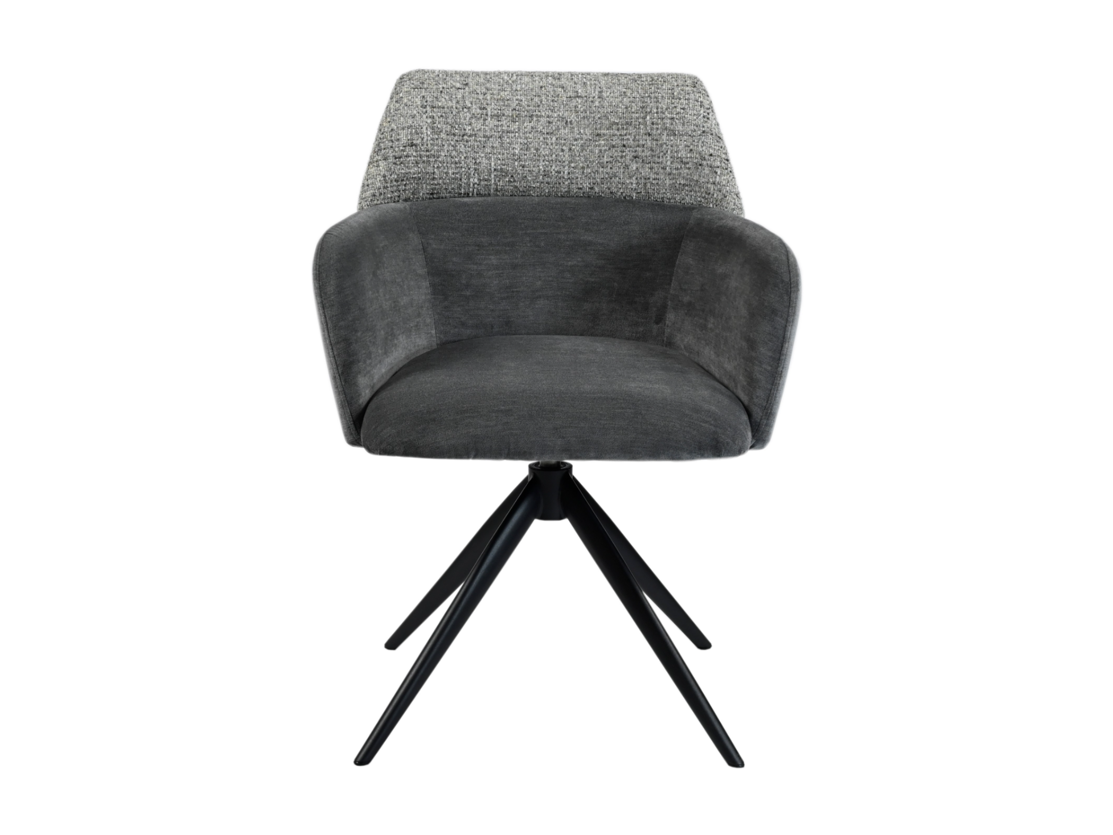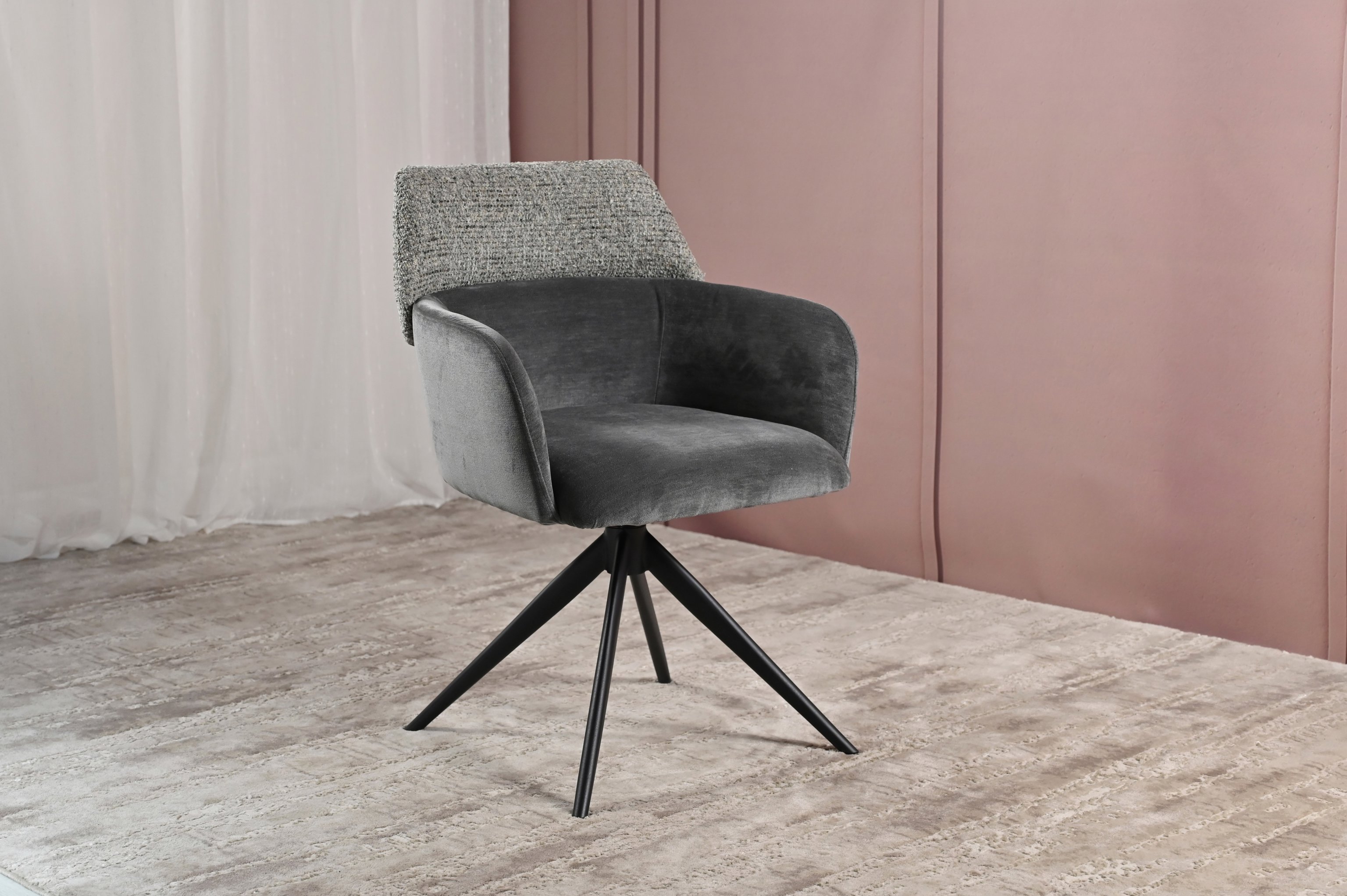 Модель має обертальну функцію на 360° з автоповоротом, що дозволяє з легкістю змінювати напрямок без потреби вставати. Оббивка з шеніллу в попільному кольорі додає стільцю м'якість і текстурну глибину, створюючи затишну атмосферу. Це кольорове рішення є універсальним і додає елегантності, чудово поєднуючись з чорними металевими ніжками, що надають конструкції стабільності.