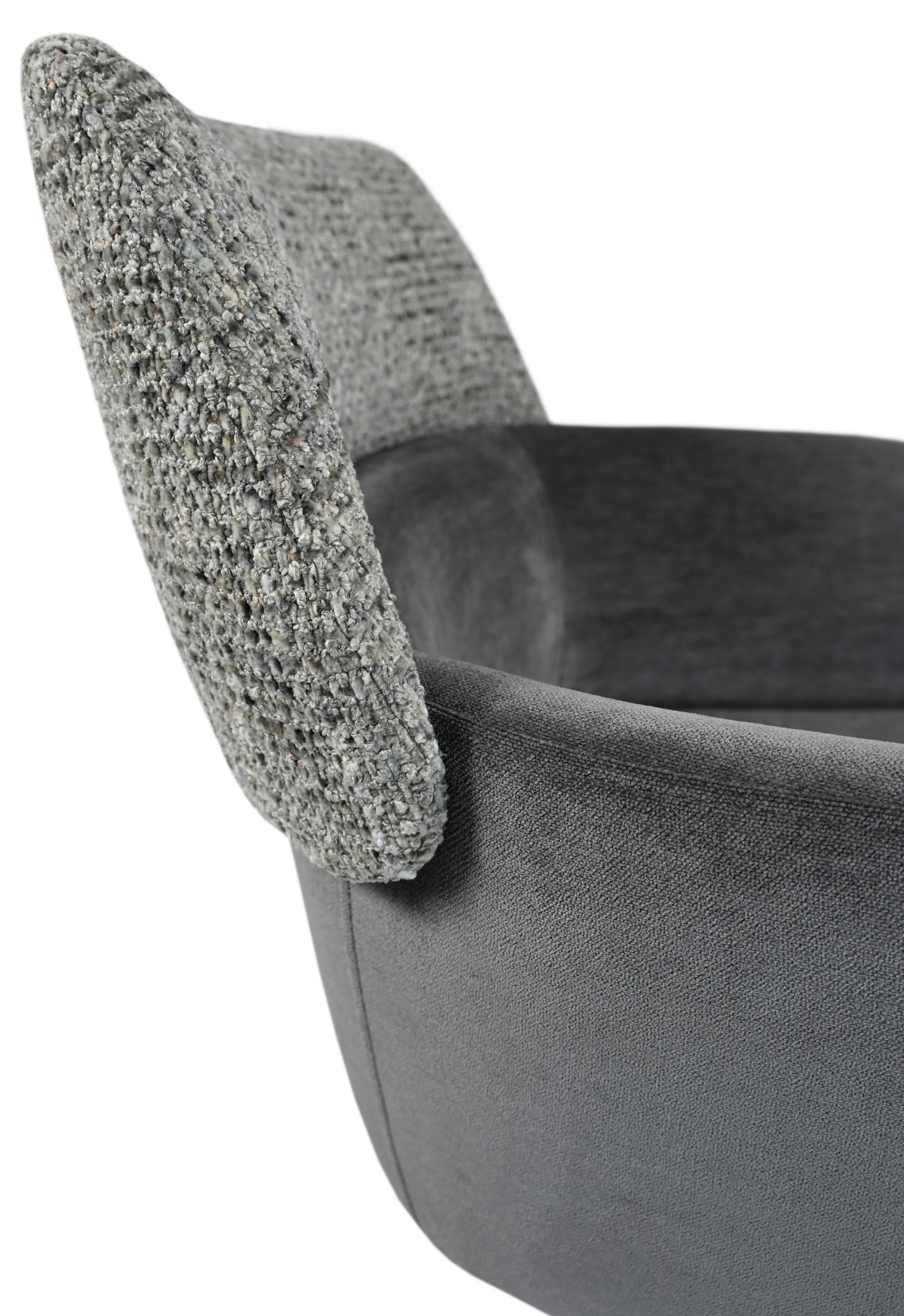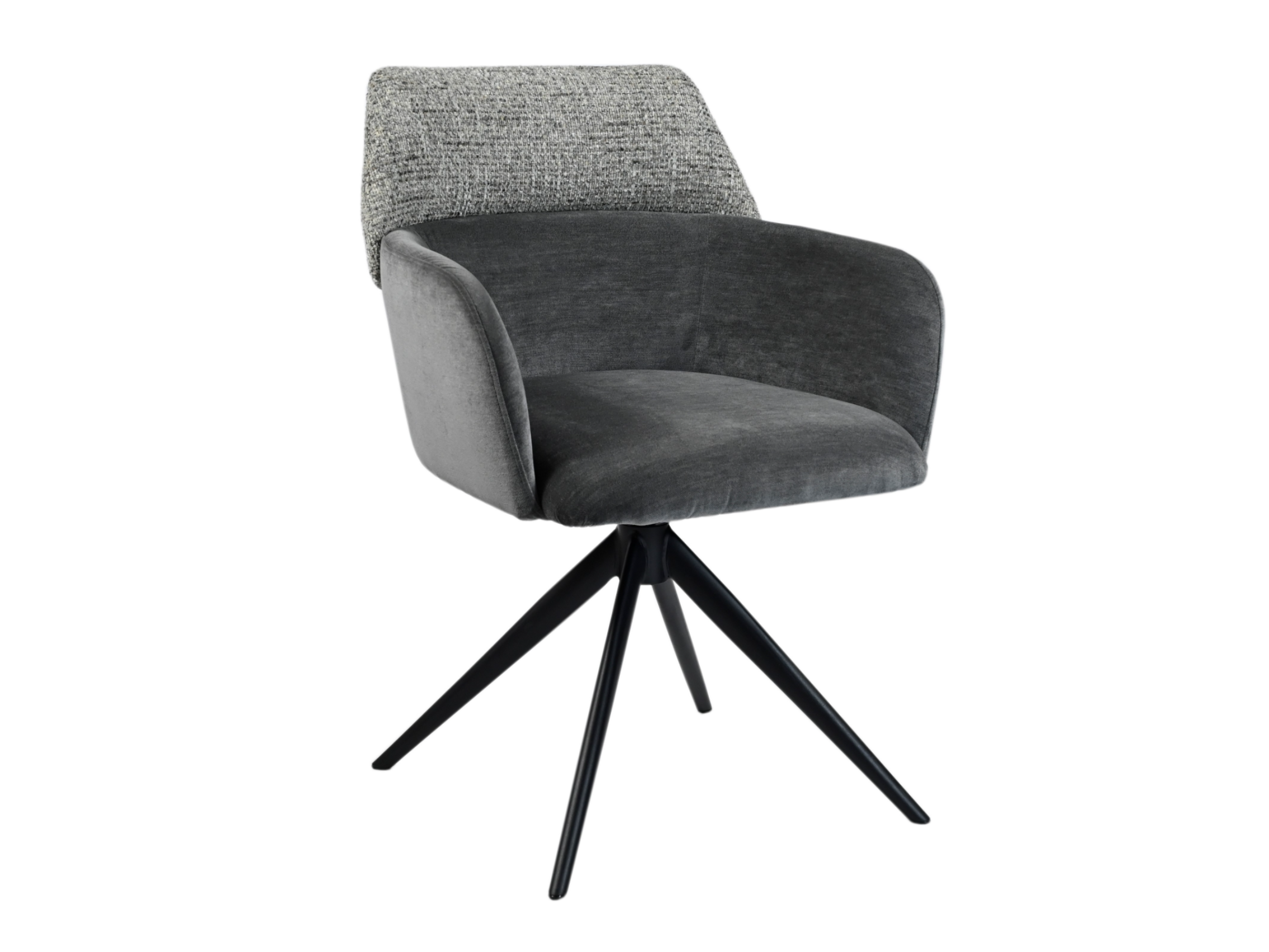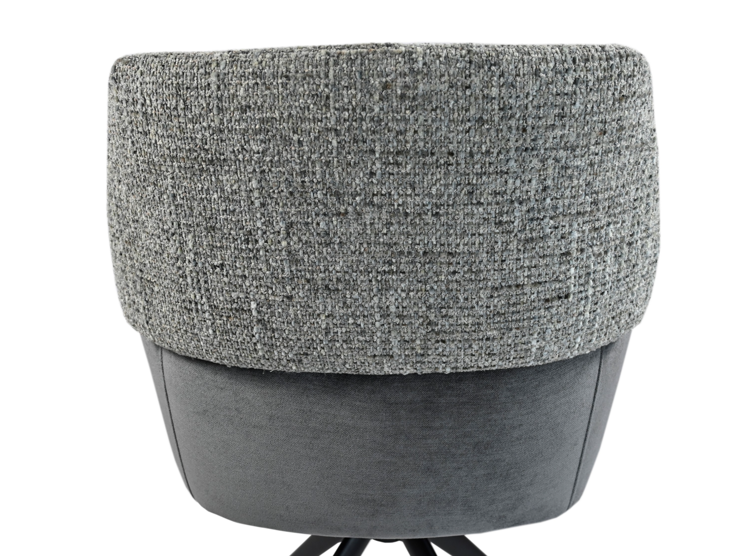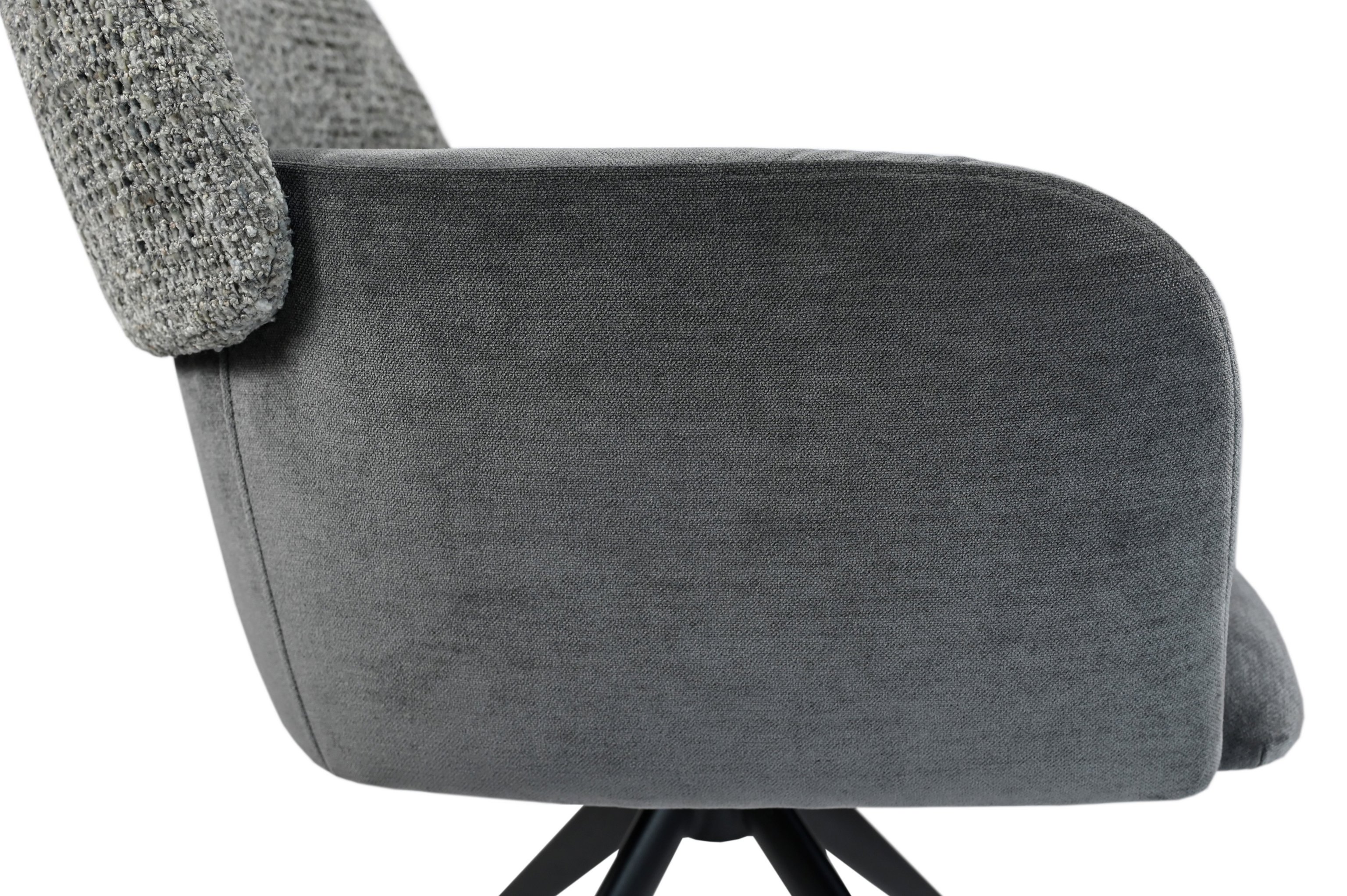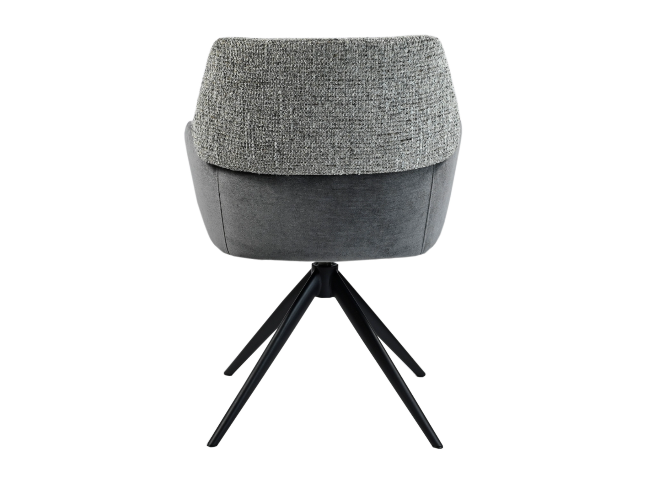 Модель має обертальну функцію на 360° з автоповоротом, що дозволяє з легкістю змінювати напрямок без потреби вставати. Оббивка з шеніллу в попільному кольорі додає стільцю м'якість і текстурну глибину, створюючи затишну атмосферу. Це кольорове рішення є універсальним і додає елегантності, чудово поєднуючись з чорними металевими ніжками, що надають конструкції стабільності.