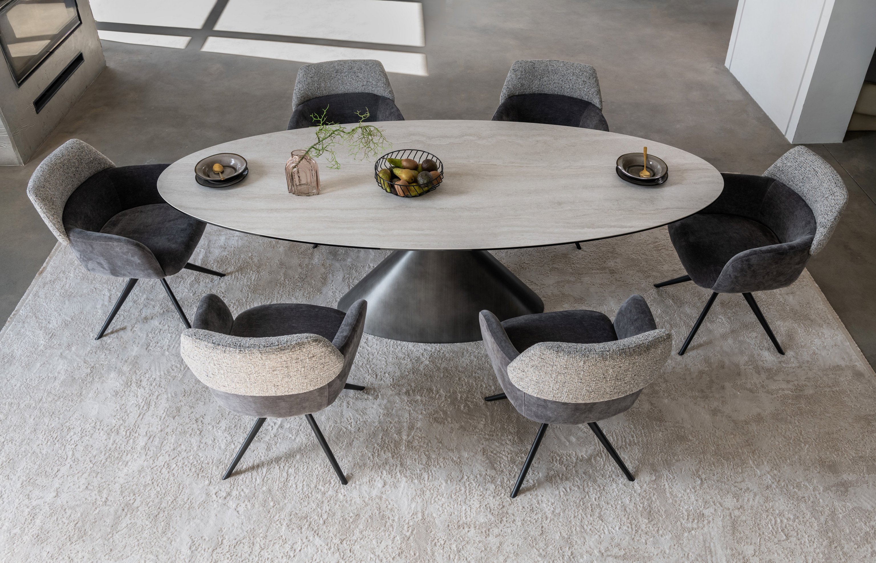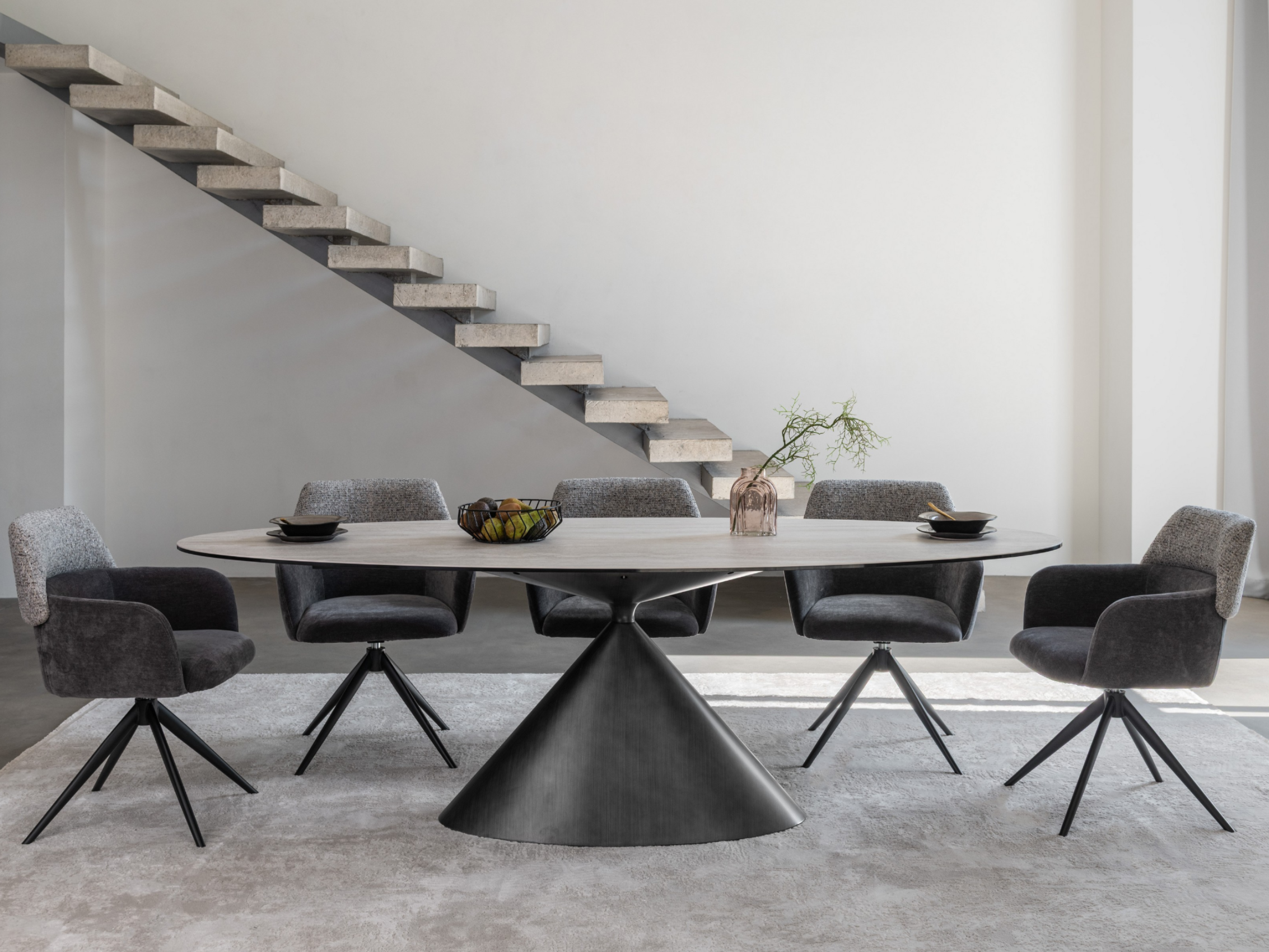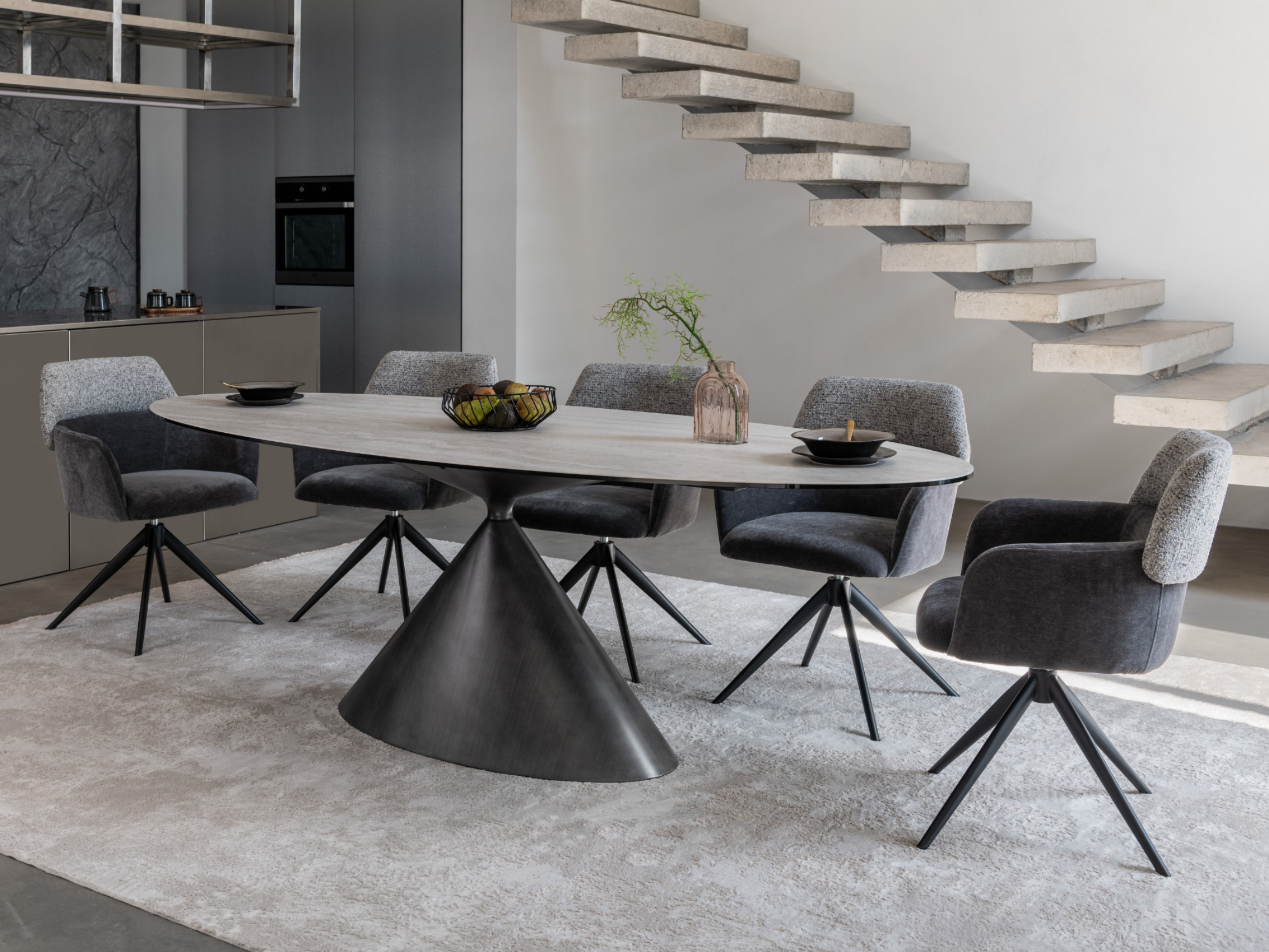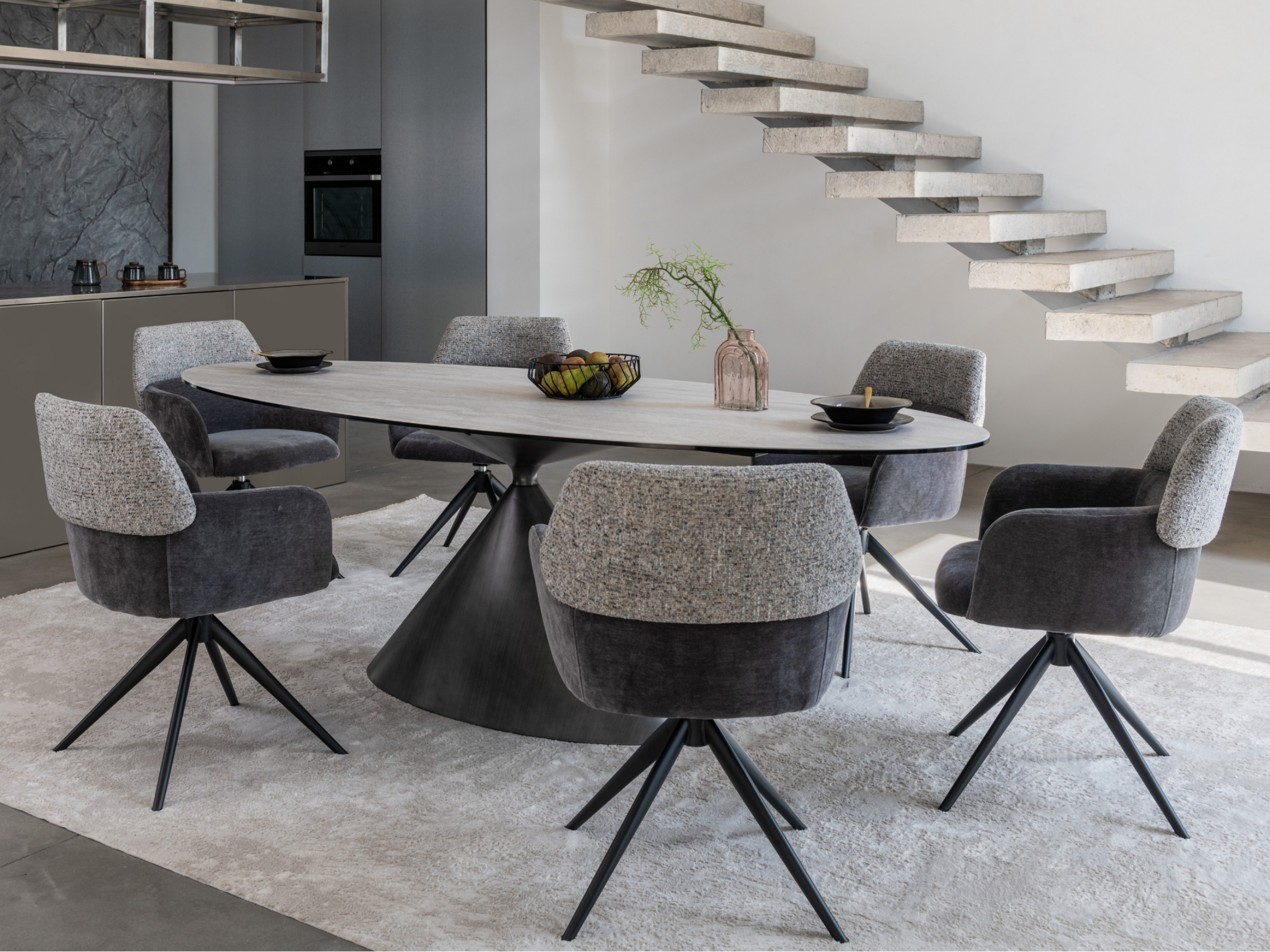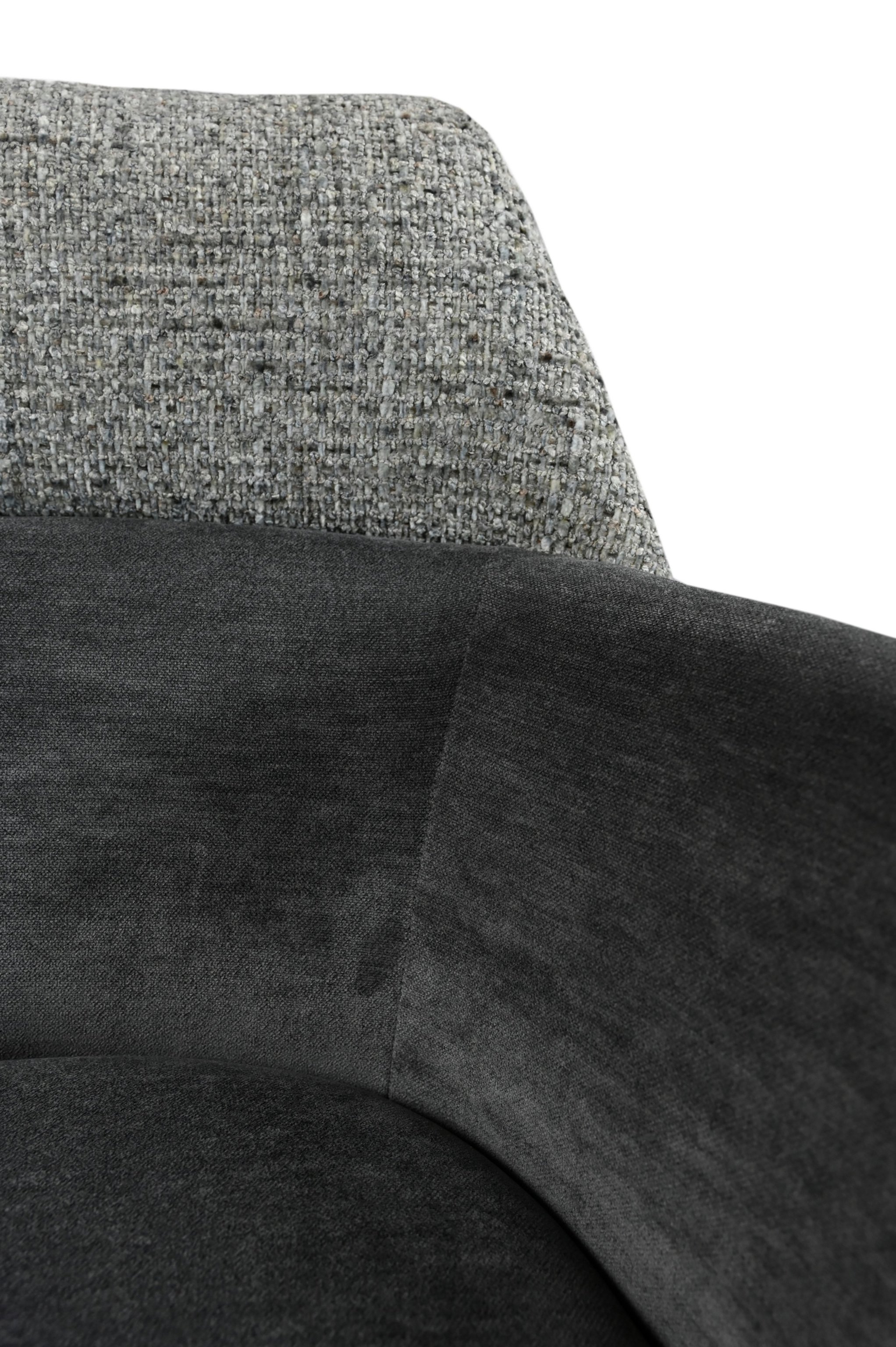 Модель має обертальну функцію на 360° з автоповоротом, що дозволяє з легкістю змінювати напрямок без потреби вставати. Оббивка з шеніллу в попільному кольорі додає стільцю м'якість і текстурну глибину, створюючи затишну атмосферу. Це кольорове рішення є універсальним і додає елегантності, чудово поєднуючись з чорними металевими ніжками, що надають конструкції стабільності.