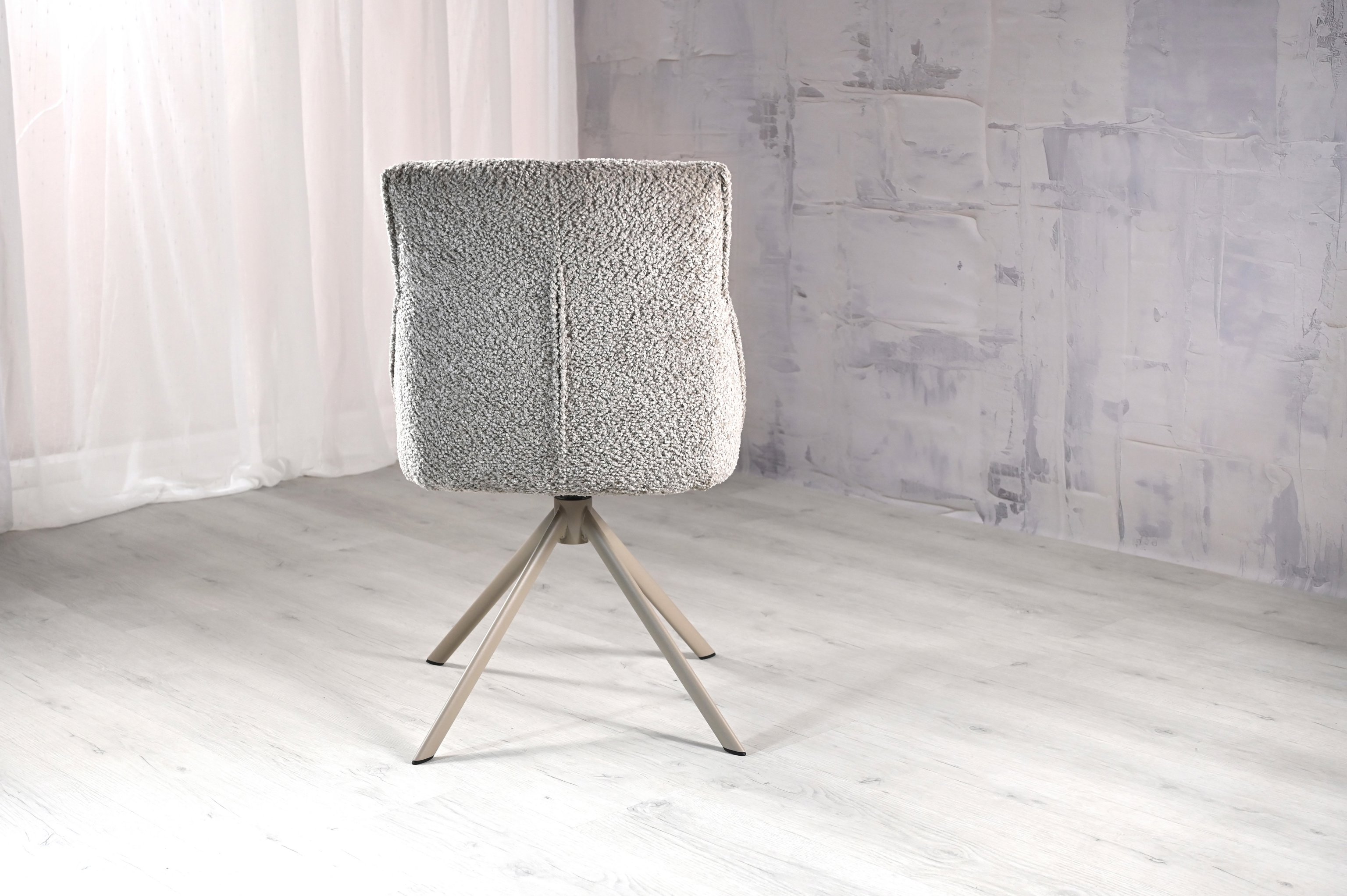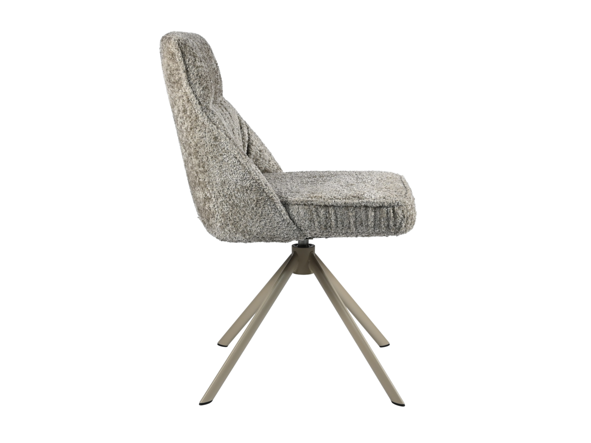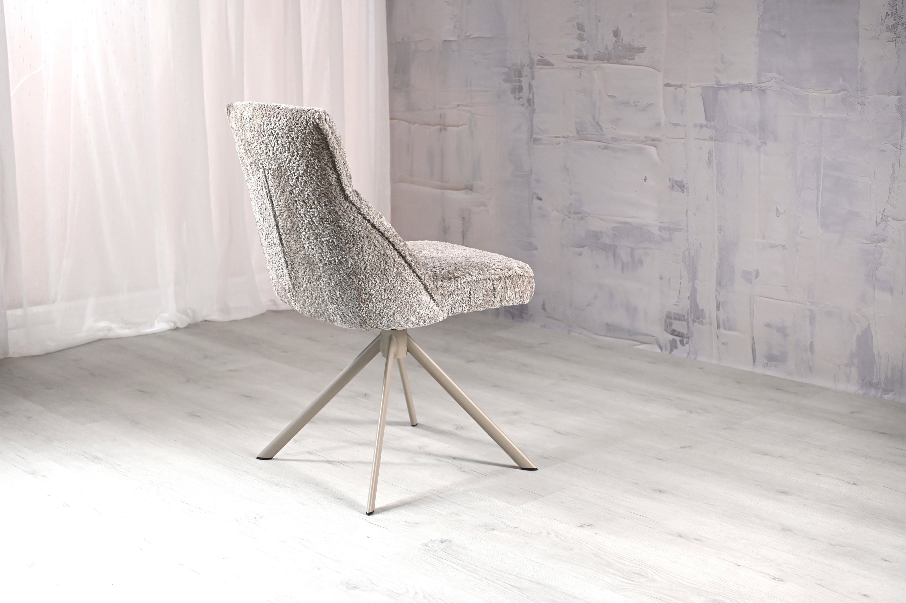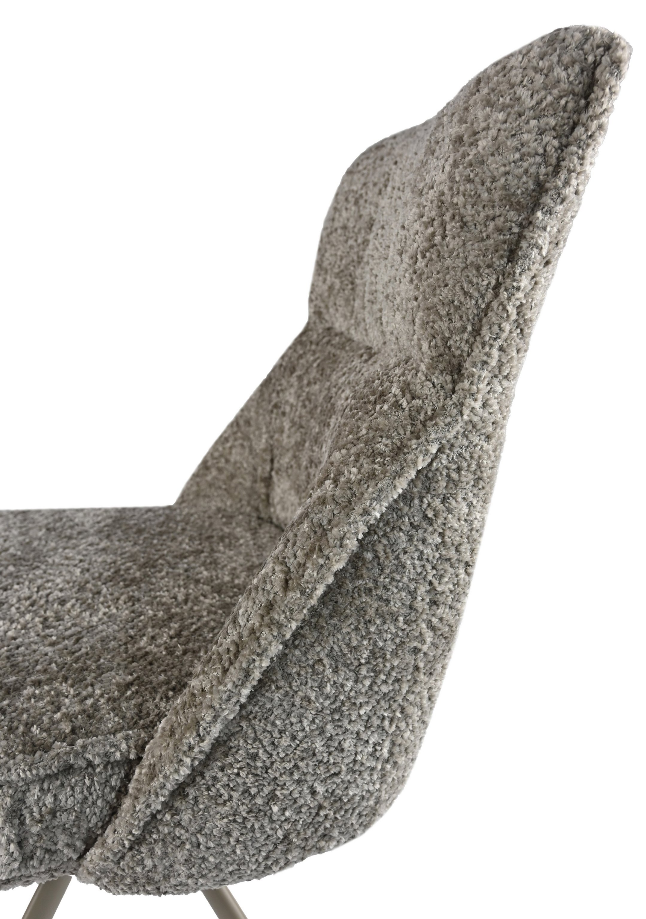 Стілець R-168 у благородному відтінку перлинний тауп — вдале поєднання сучасного дизайну, комфорту та практичності. Оббивка з м’якого букле створює затишну текстуру, що приємна на дотик, а металева основа у кольорі капучино додає теплоти та вишуканості образу.