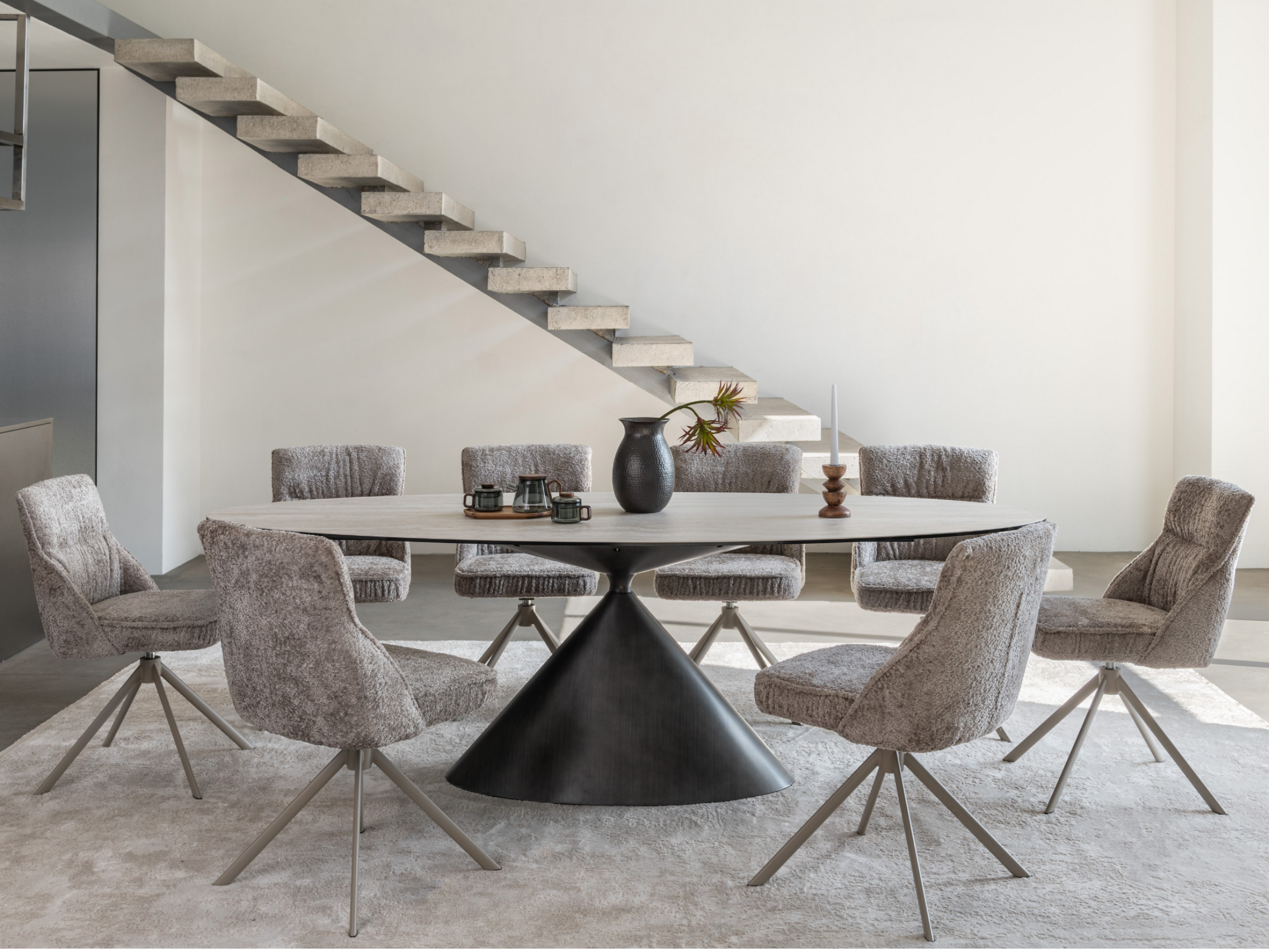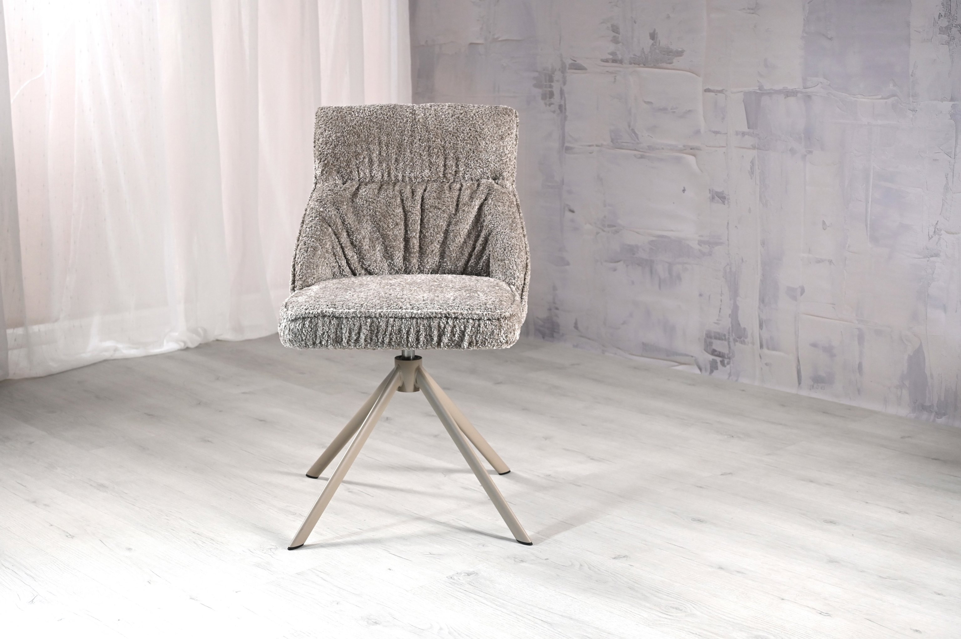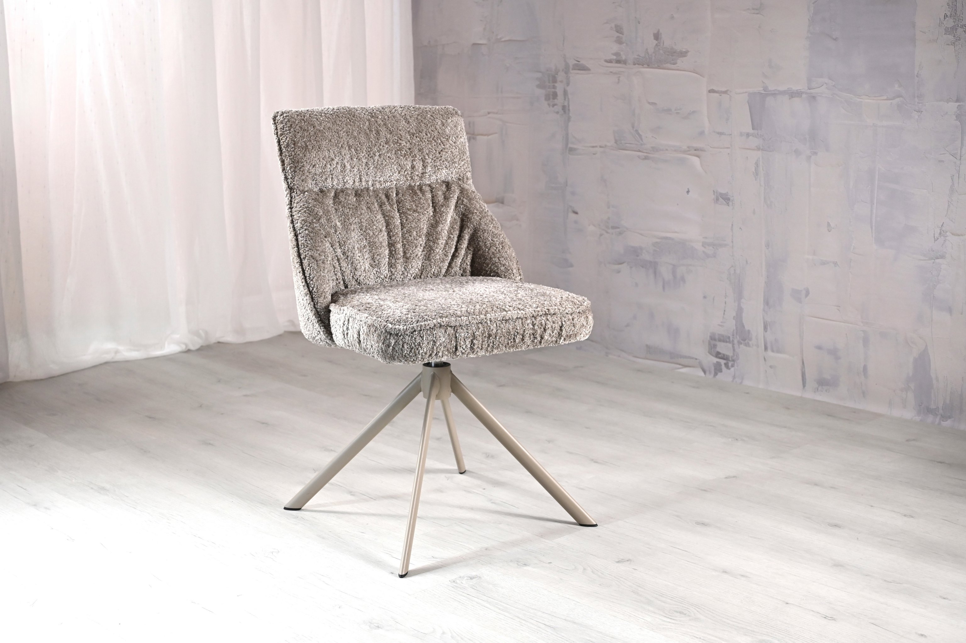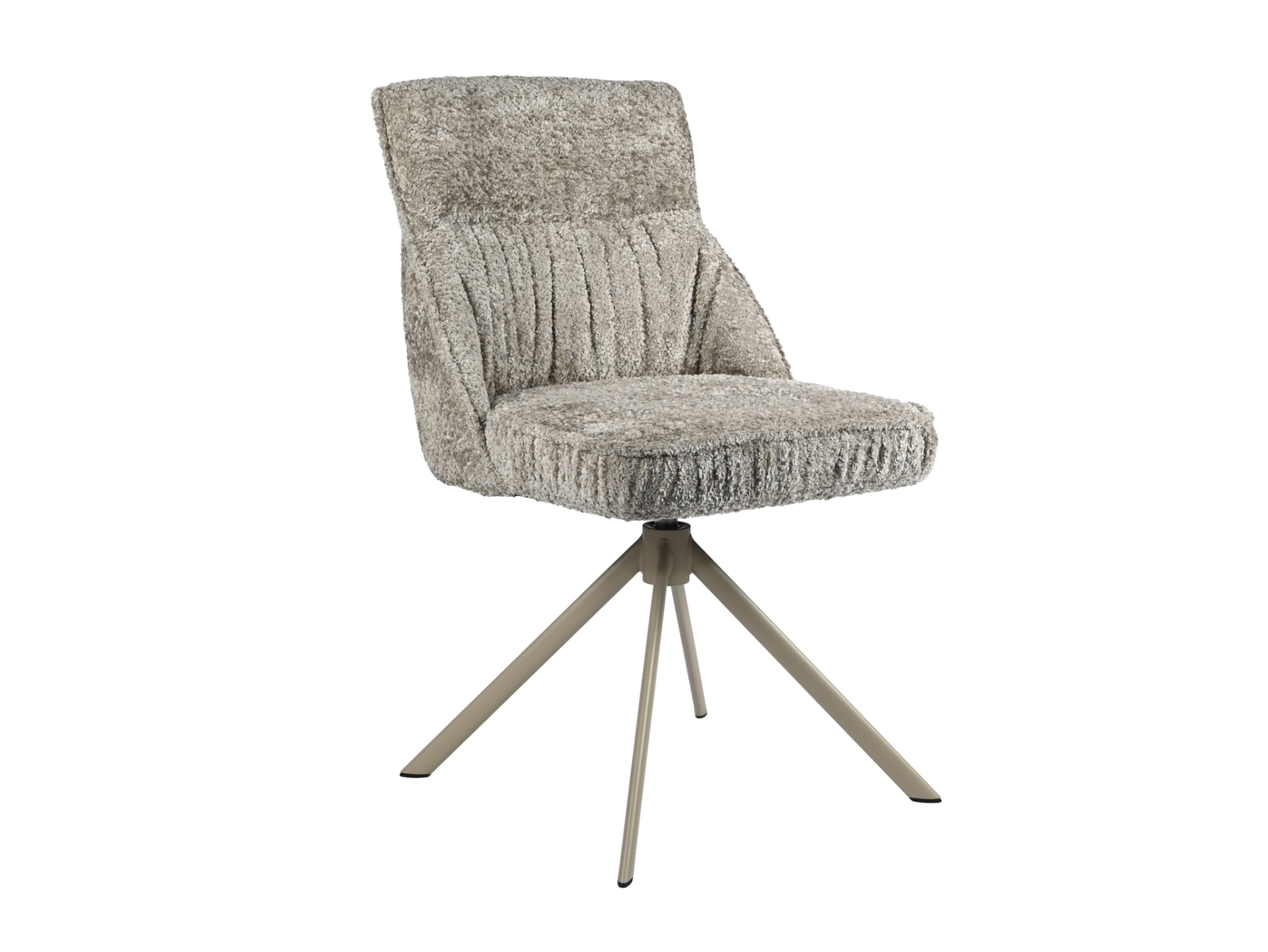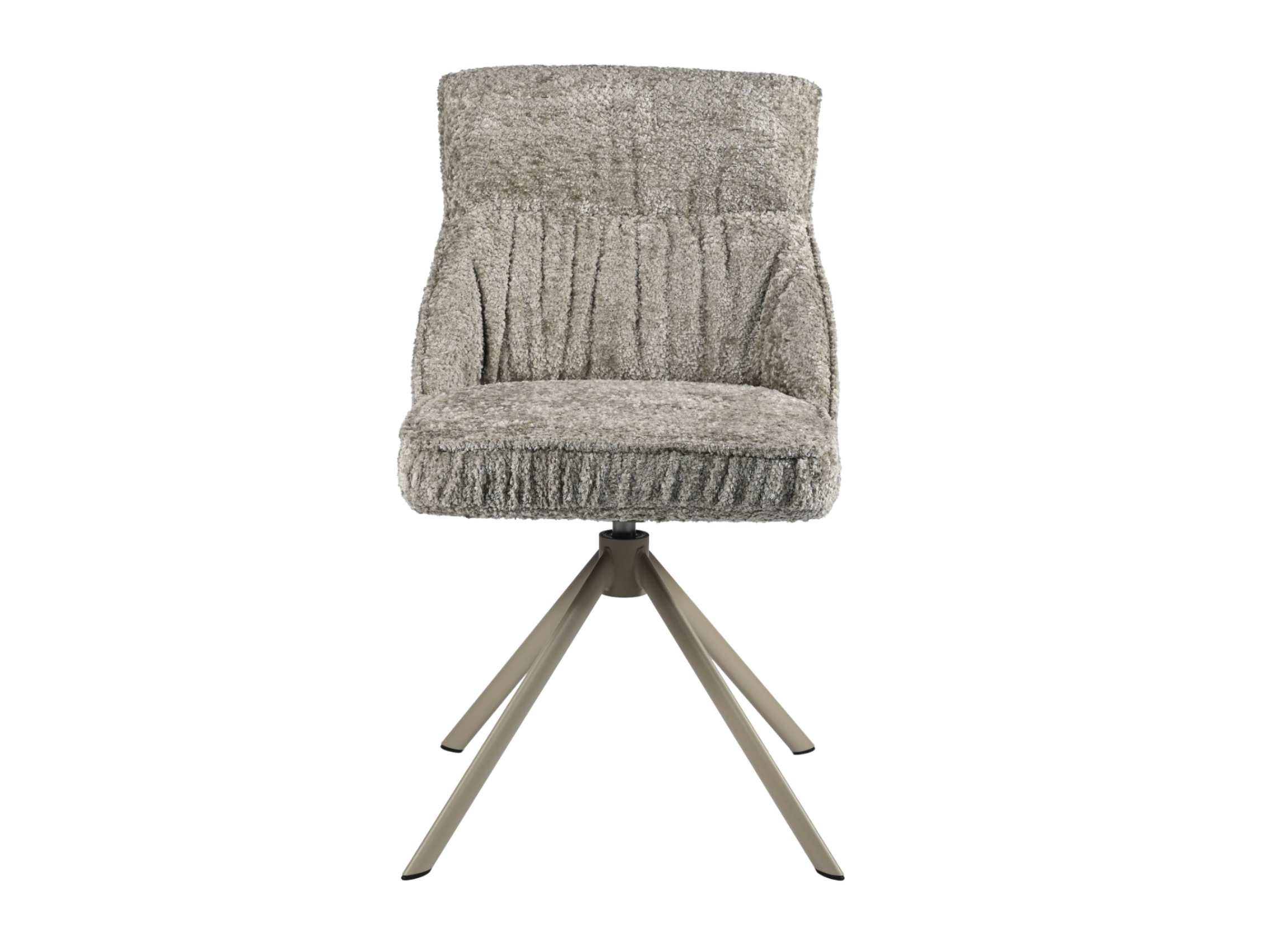Стілець R-168 у благородному відтінку перлинний тауп — вдале поєднання сучасного дизайну, комфорту та практичності. Оббивка з м’якого букле створює затишну текстуру, що приємна на дотик, а металева основа у кольорі капучино додає теплоти та вишуканості образу.