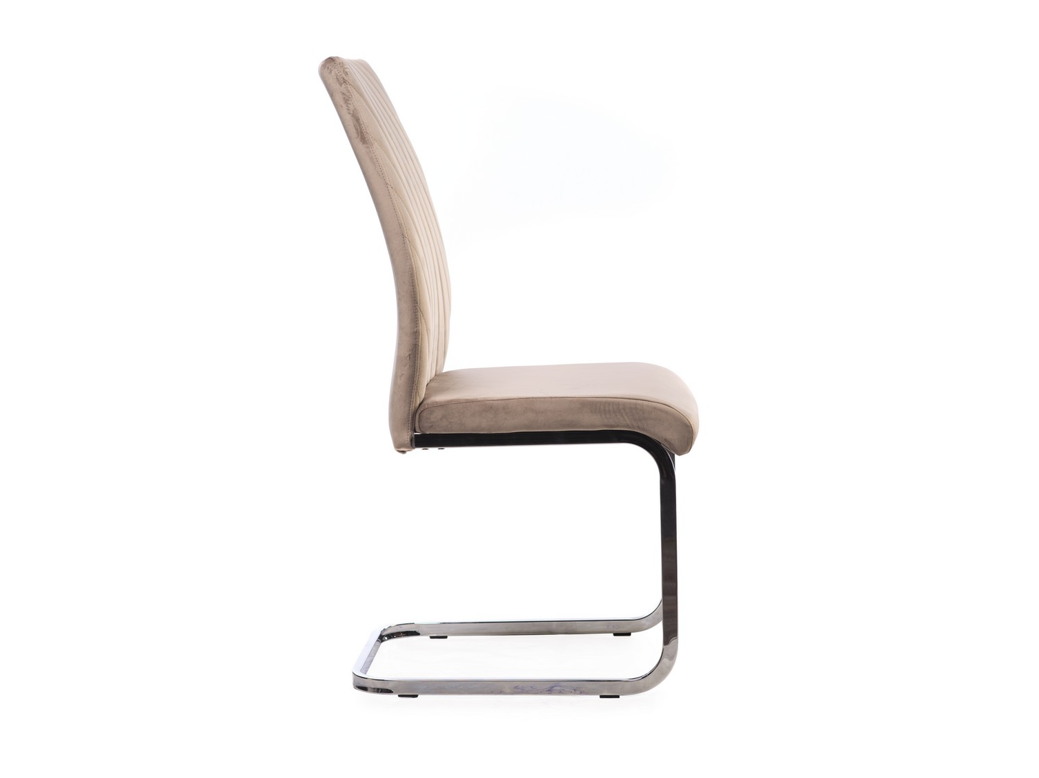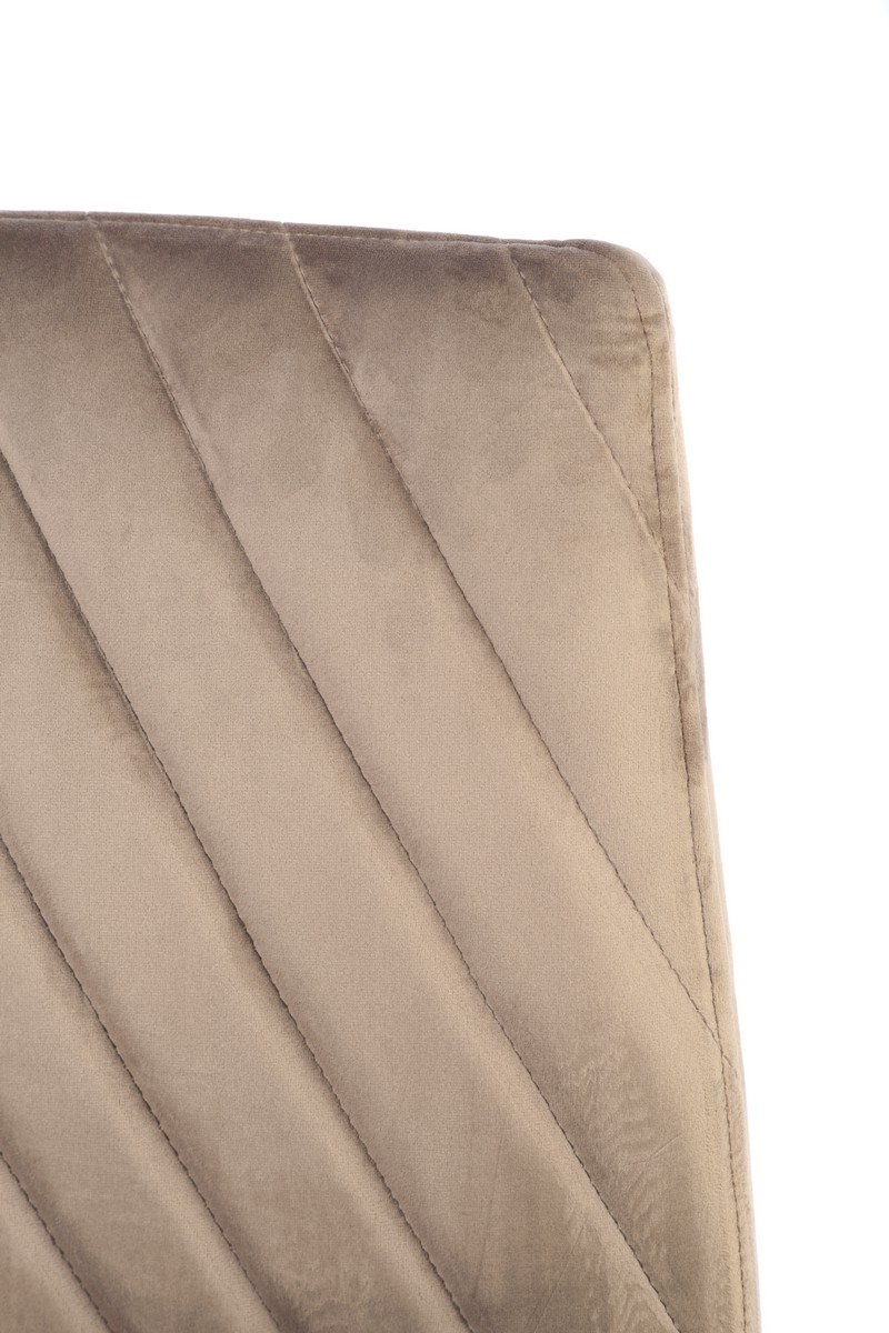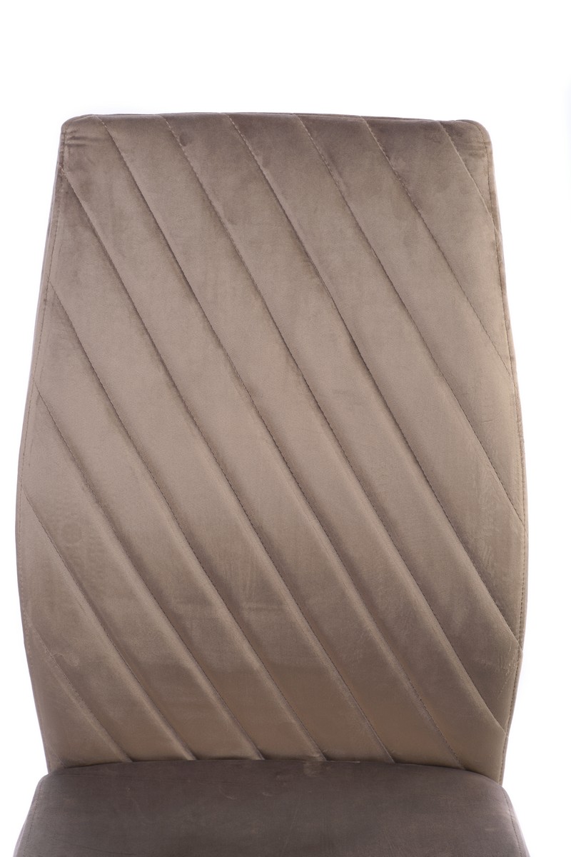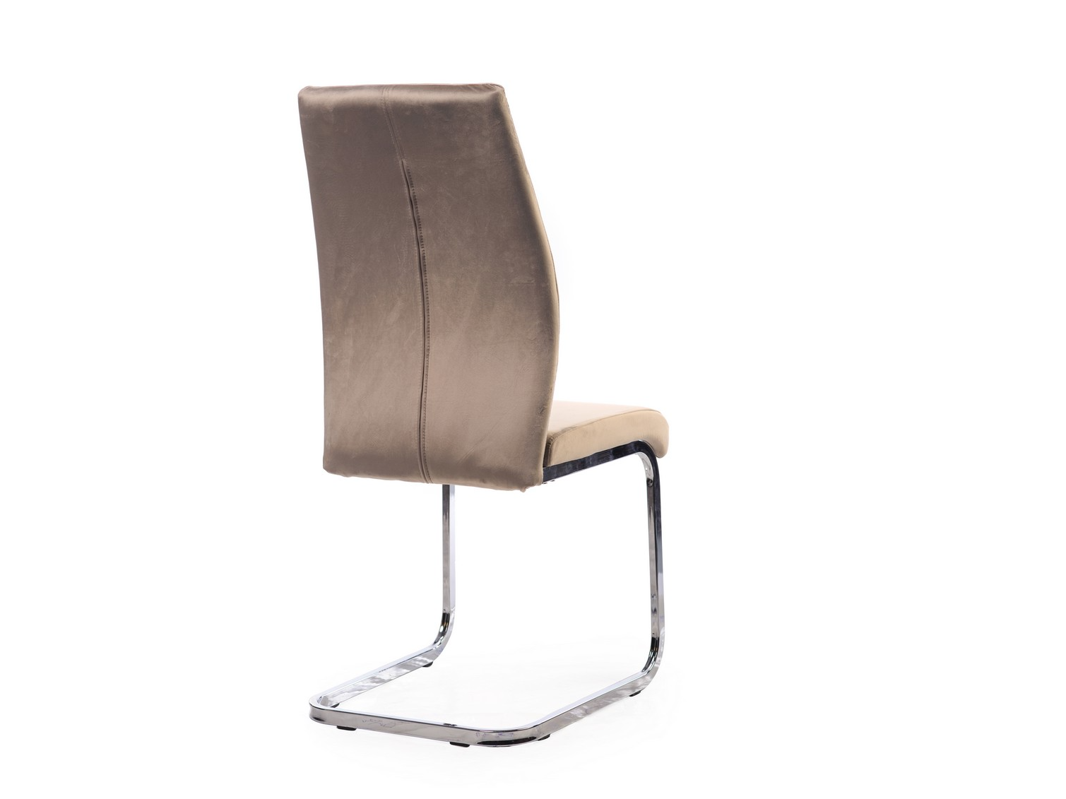 Стілець S-118 у кольорі капучино вирізняється вишуканістю та сучасним стилем. Оббивка з велюру у теплих відтінках капучино додає інтер’єру затишку, гармонійно поєднуючись із м’якими текстурами й природними кольорами. Велюрова поверхня не лише приємна на дотик, але й довговічна, зберігаючи свій вигляд навіть при частому використанні.