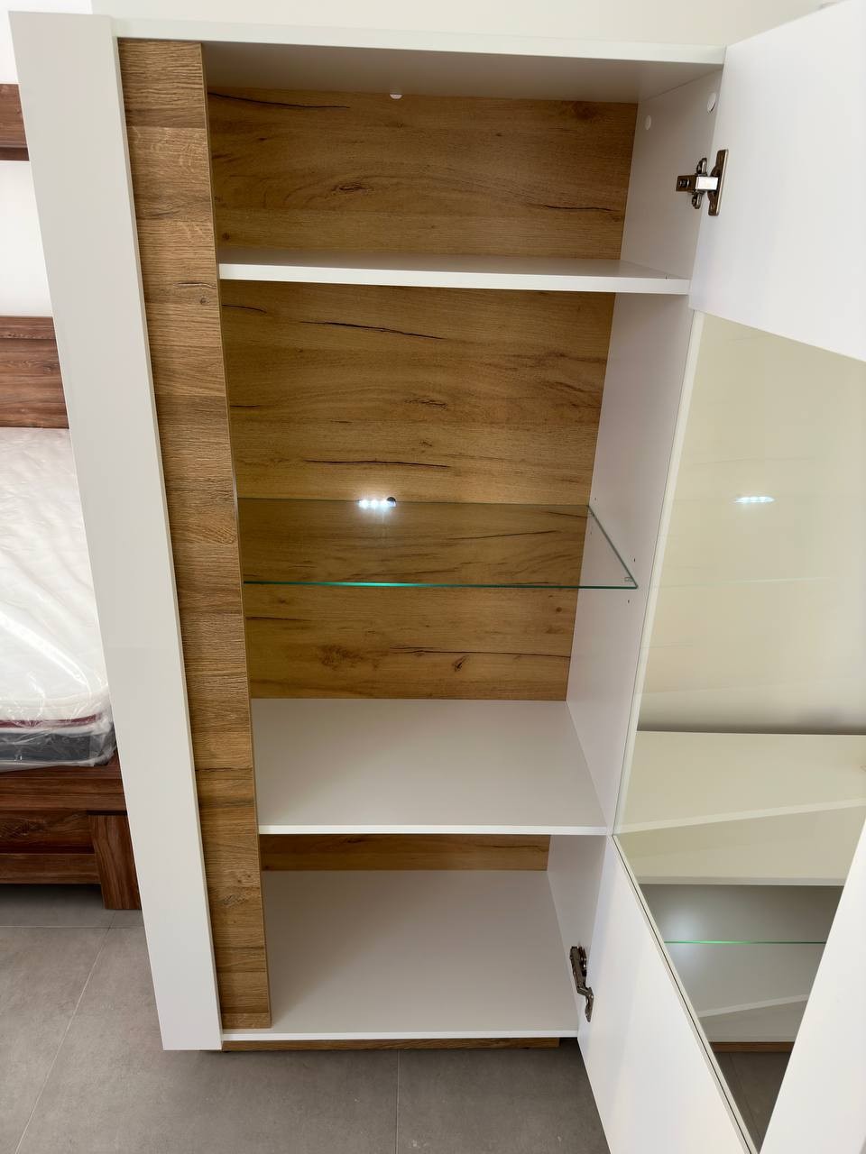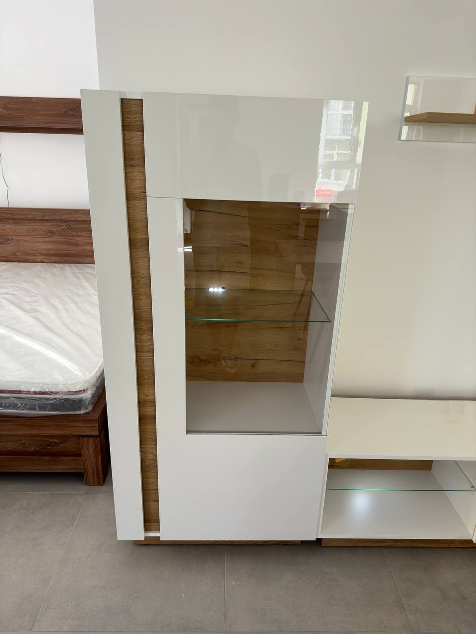Низька вітрина Arco 1D1W/72 Perfect Home Польща - чудове доповнення до сучасного інтер'єру. Вона ідеально виглядає в поєднанні з тумбою під телевізор і підвісним телевізором. Фасад вітрини виконаний у білому глянці, а корпус - у білому матовому кольорі. Внутрішня частина вітрини має контрастний декор з дуба. Меблі мають сучасний характер і стоять на цоколі. Дана вітрина поставляється в розібраному вигляді з інструкцією по збірці і є частиною однойменного комплекту. Можливе додаткове освітлення.